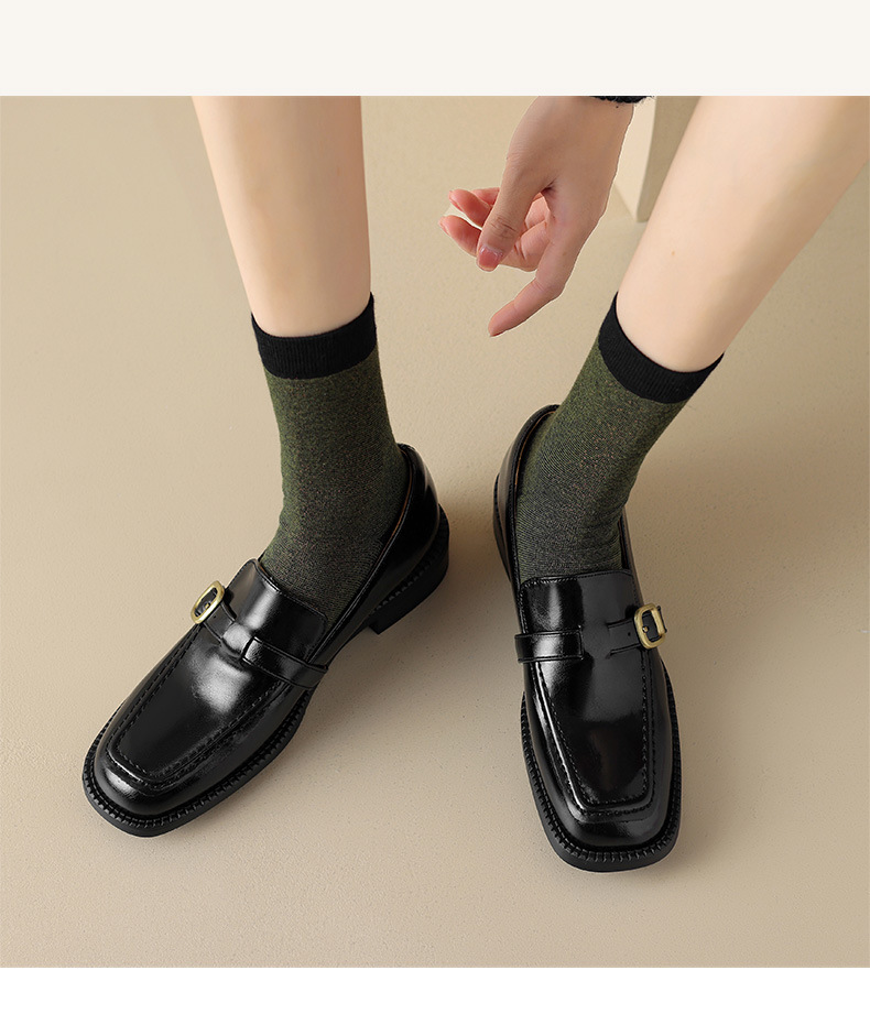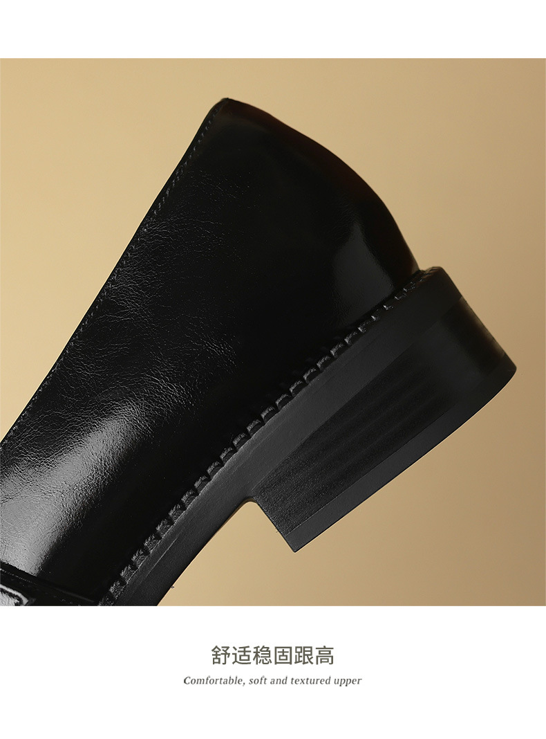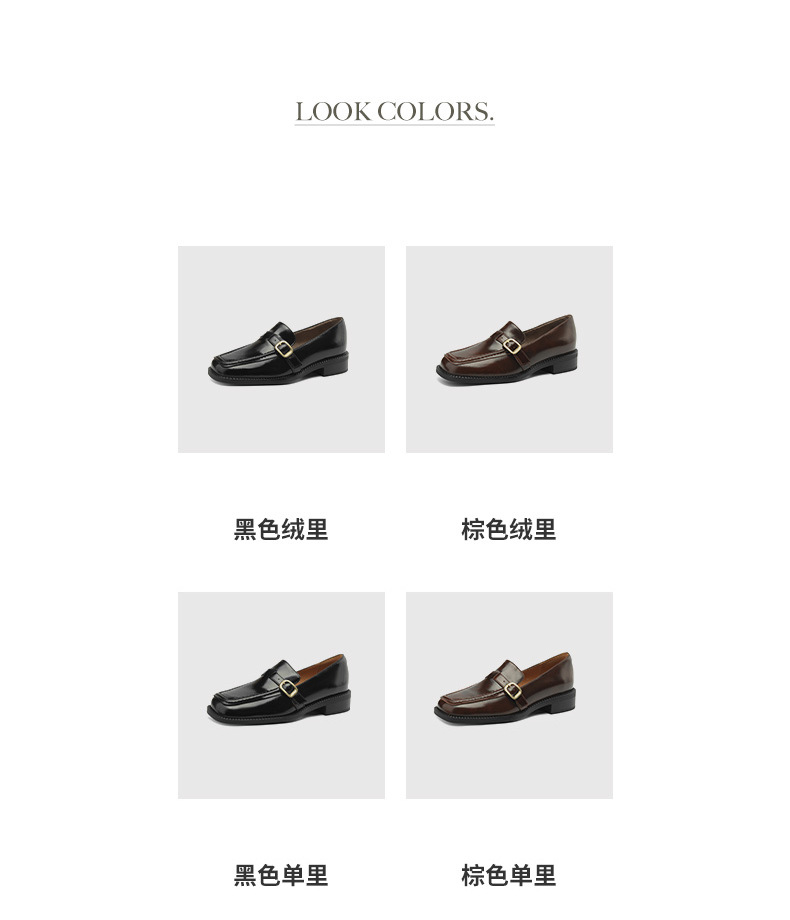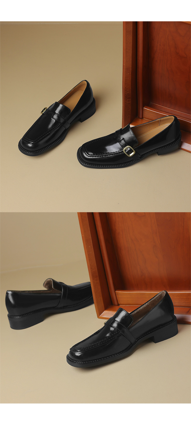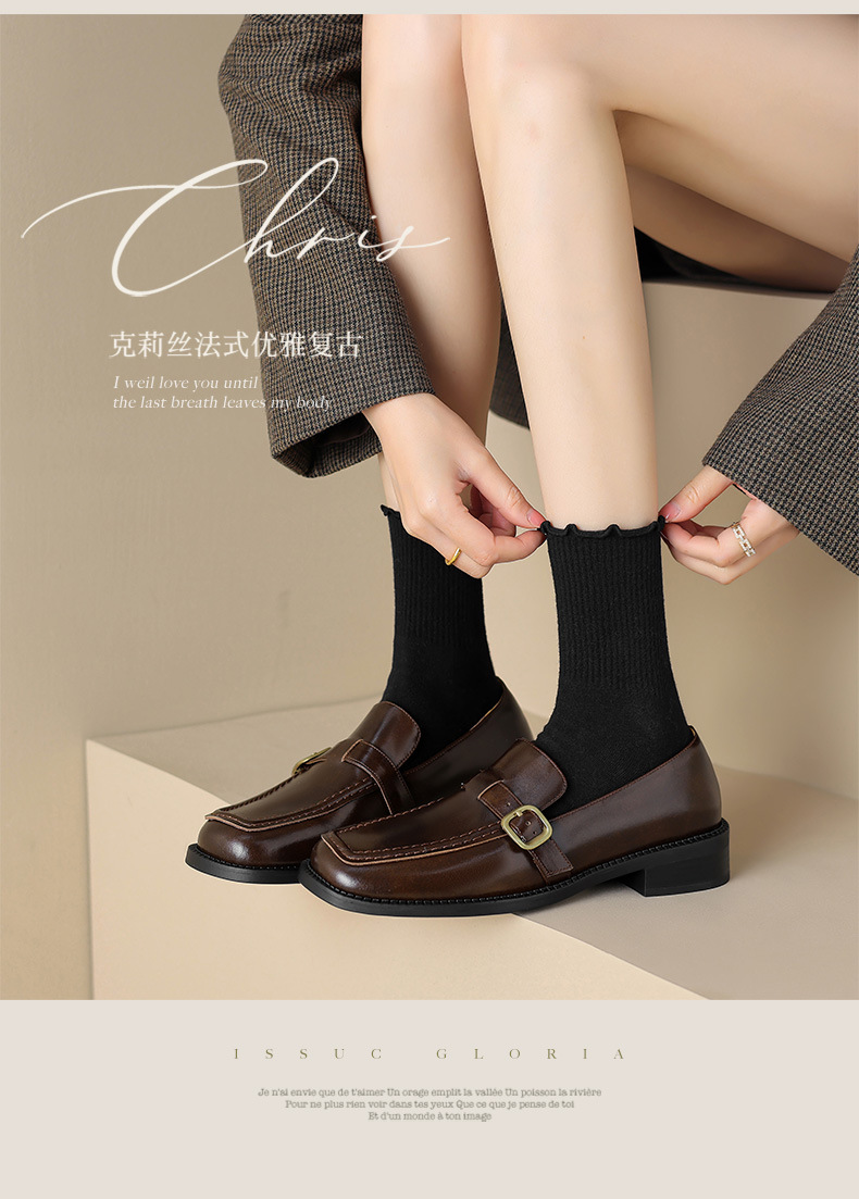 영국 스타일 벨트 버클 로퍼 2024 이른 봄 스퀘어 토 가죽 신발 복고풍 청키 힐 싱글 레이어 신발 여성용 미드 힐 플러스 사이즈