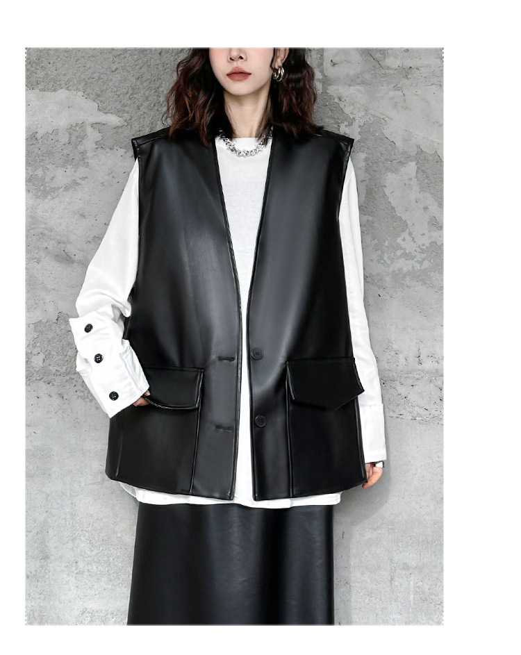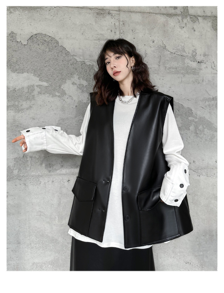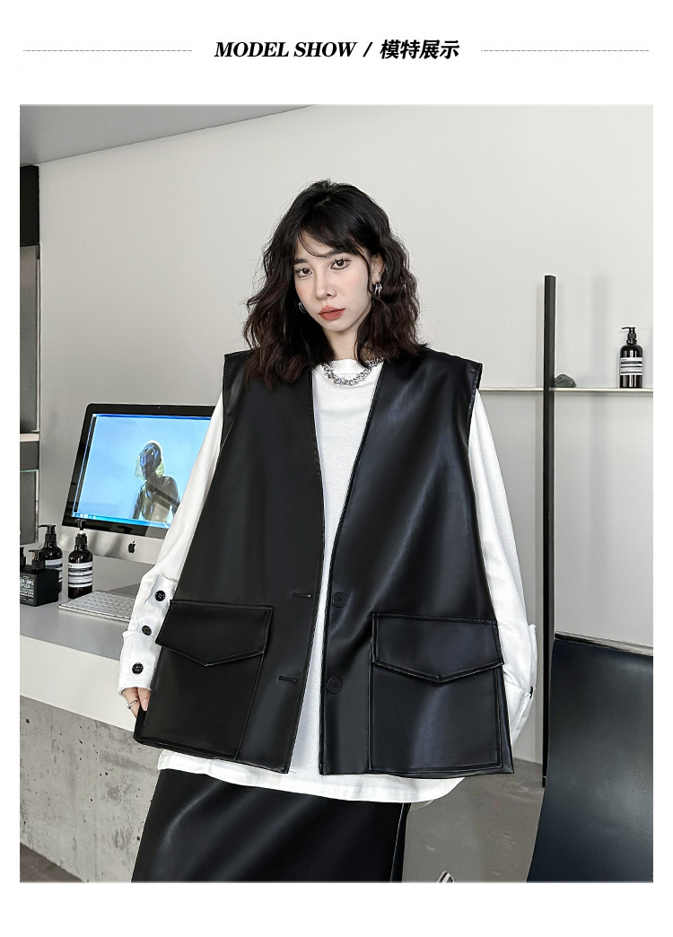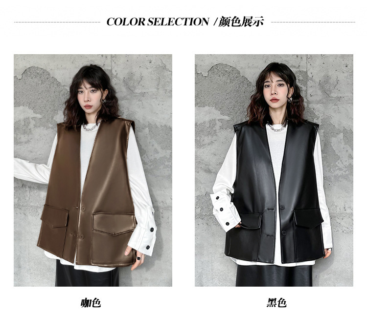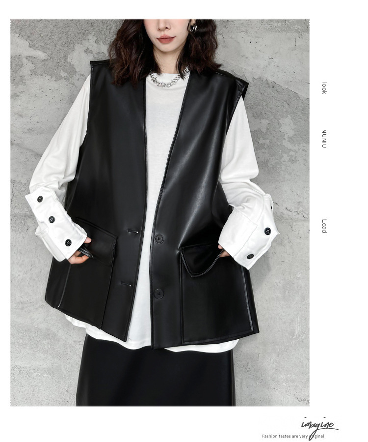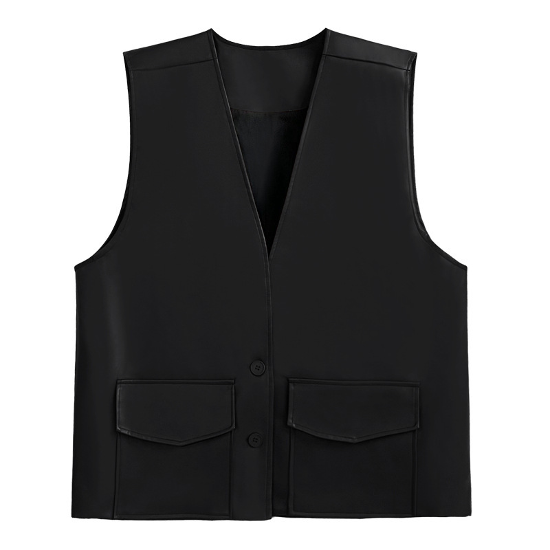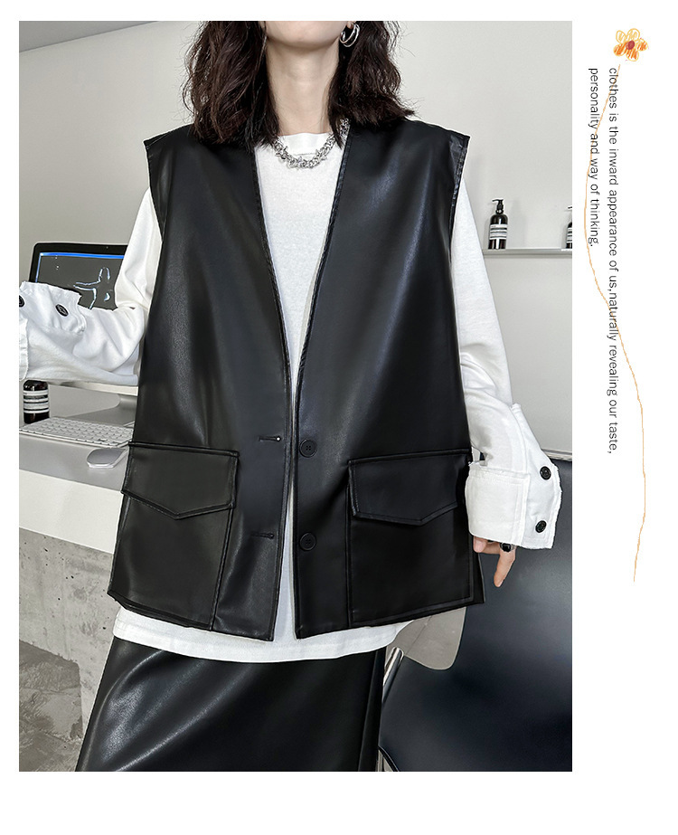 빈티지 홍콩 스타일 솔리드 컬러 퍼가죽 V 넥 조끼 여성의 봄과 가을 새로운 느슨한 쌓인 캐주얼 조끼 재킷