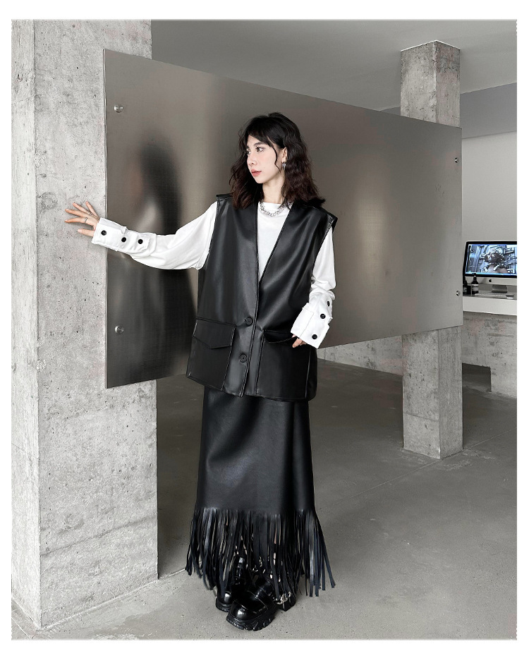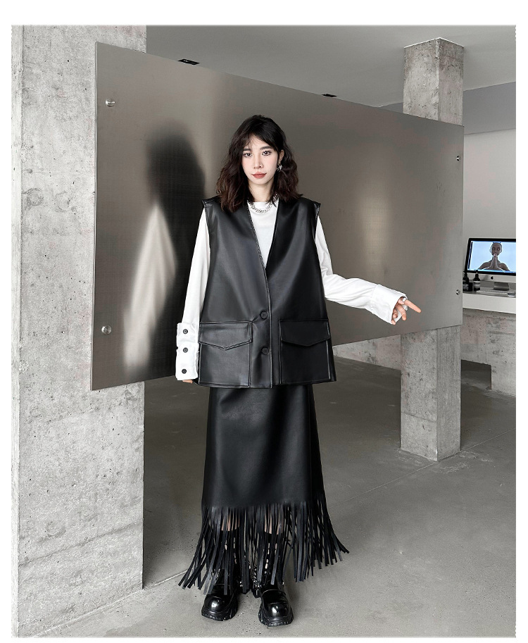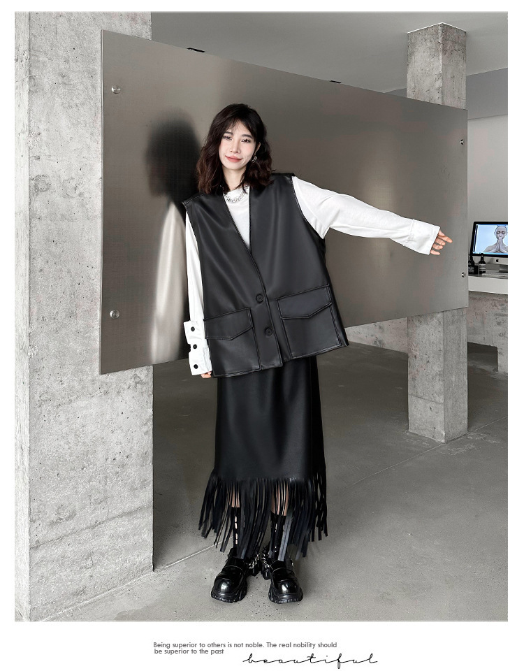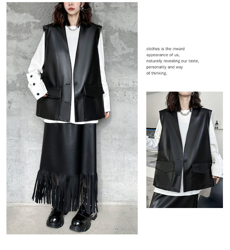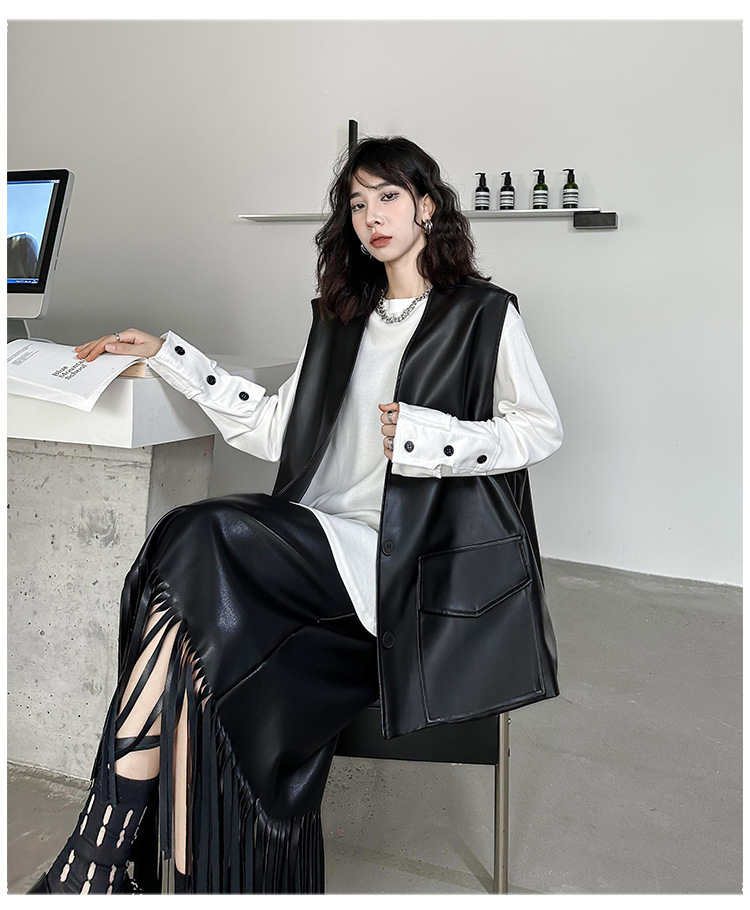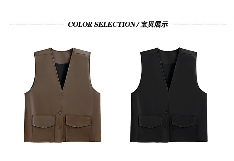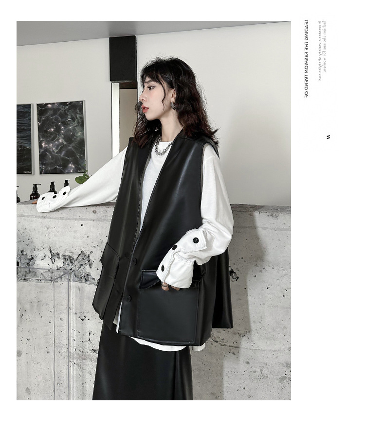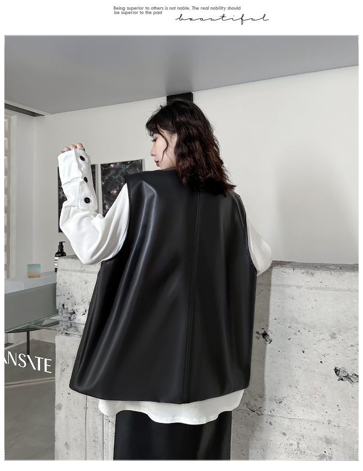 빈티지 홍콩 스타일 솔리드 컬러 퍼가죽 V 넥 조끼 여성의 봄과 가을 새로운 느슨한 쌓인 캐주얼 조끼 재킷