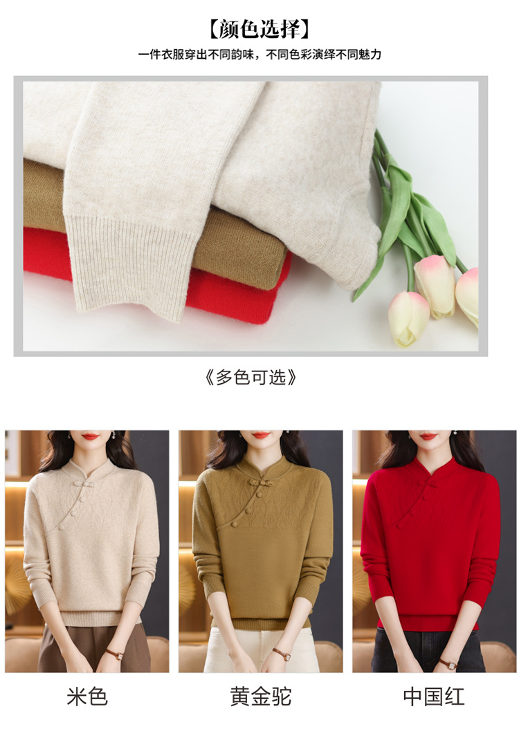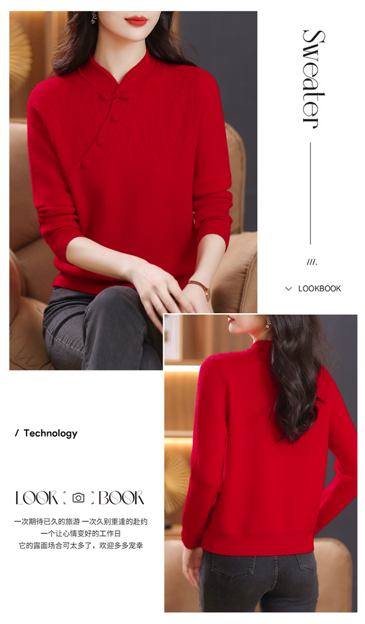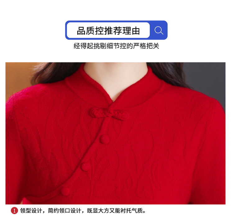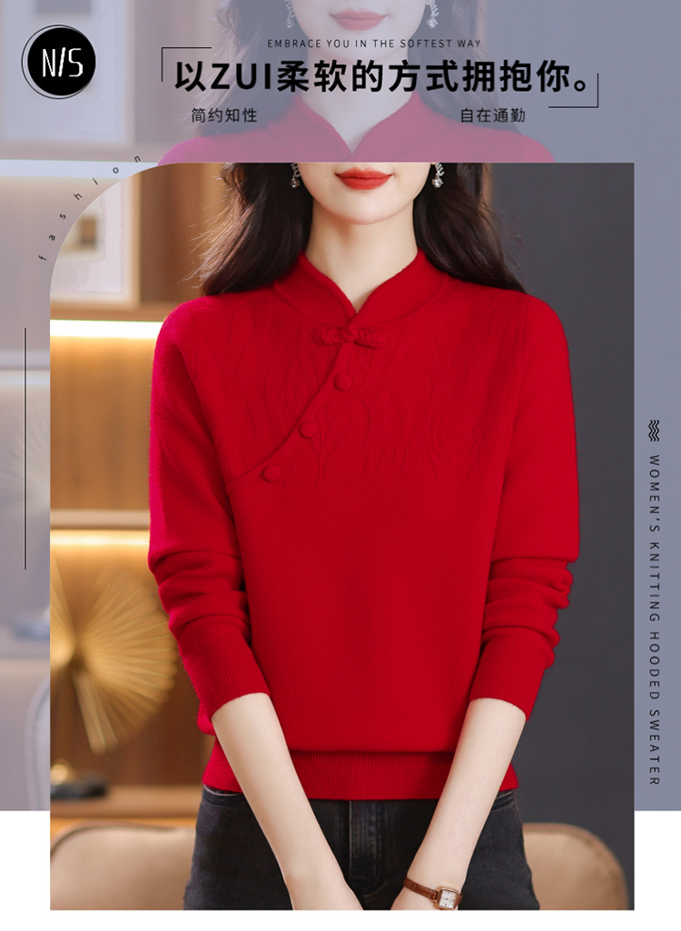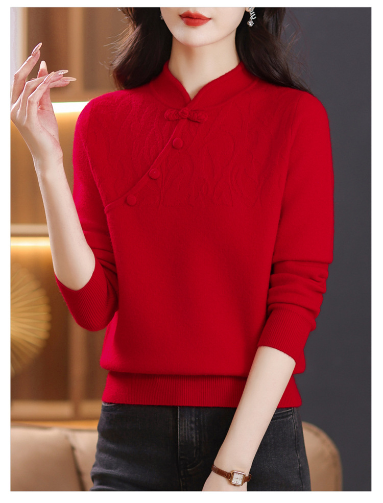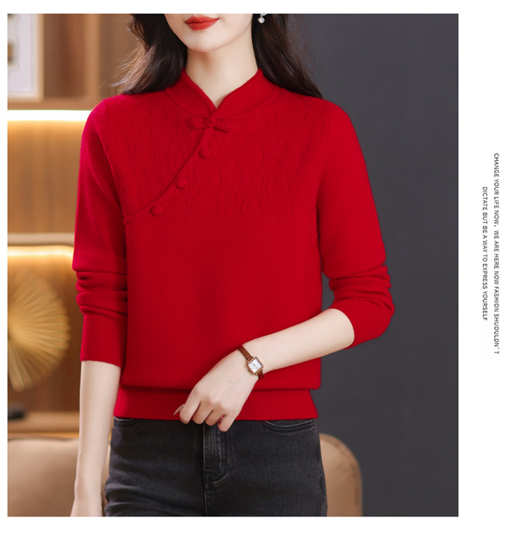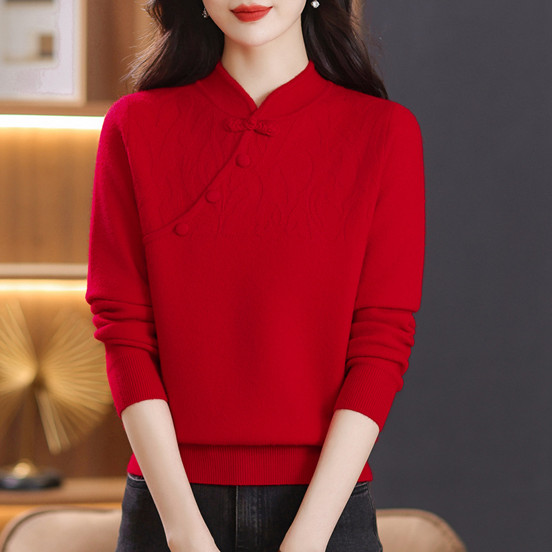 2024 새로운 중국 스타일 버클 탑 엄마 니트 중국 빨간 스웨터 여성의 가을과 겨울 밑바닥 셔츠 내복스토어 가기