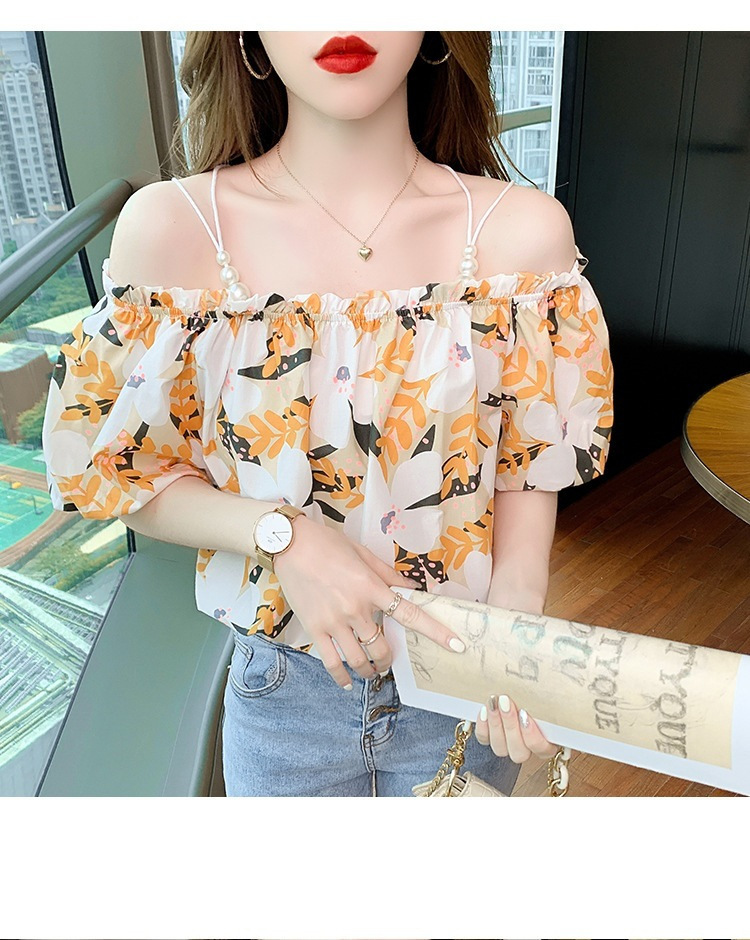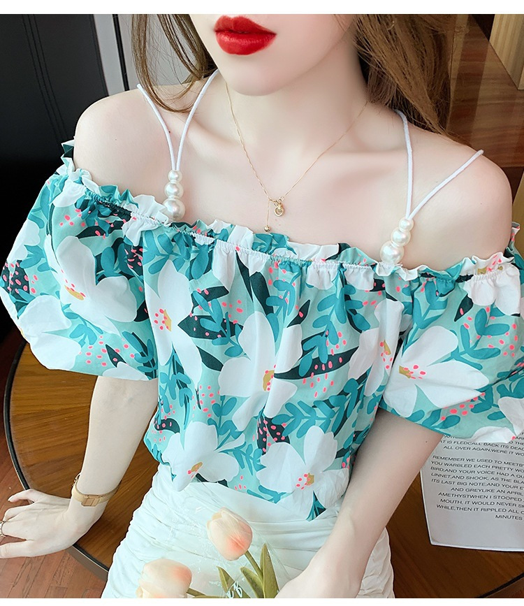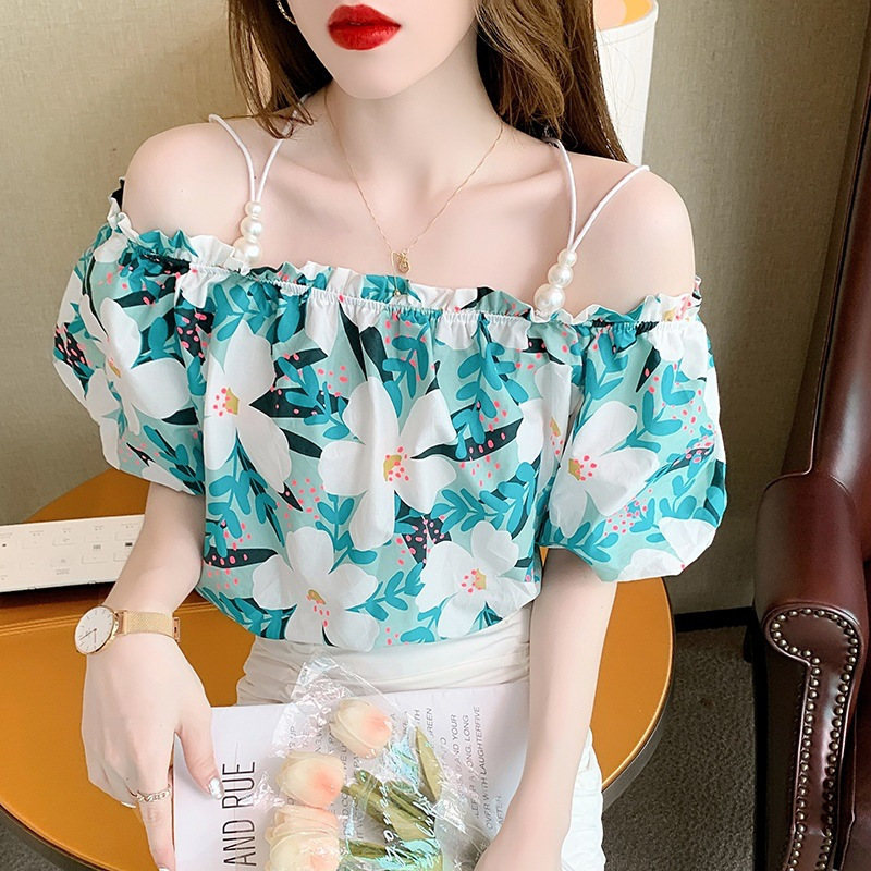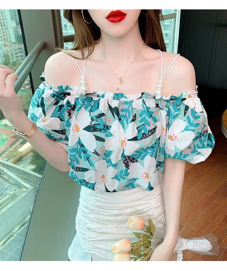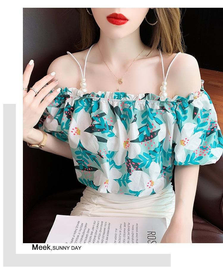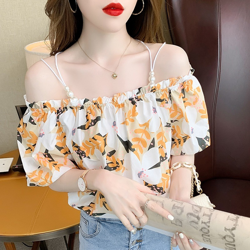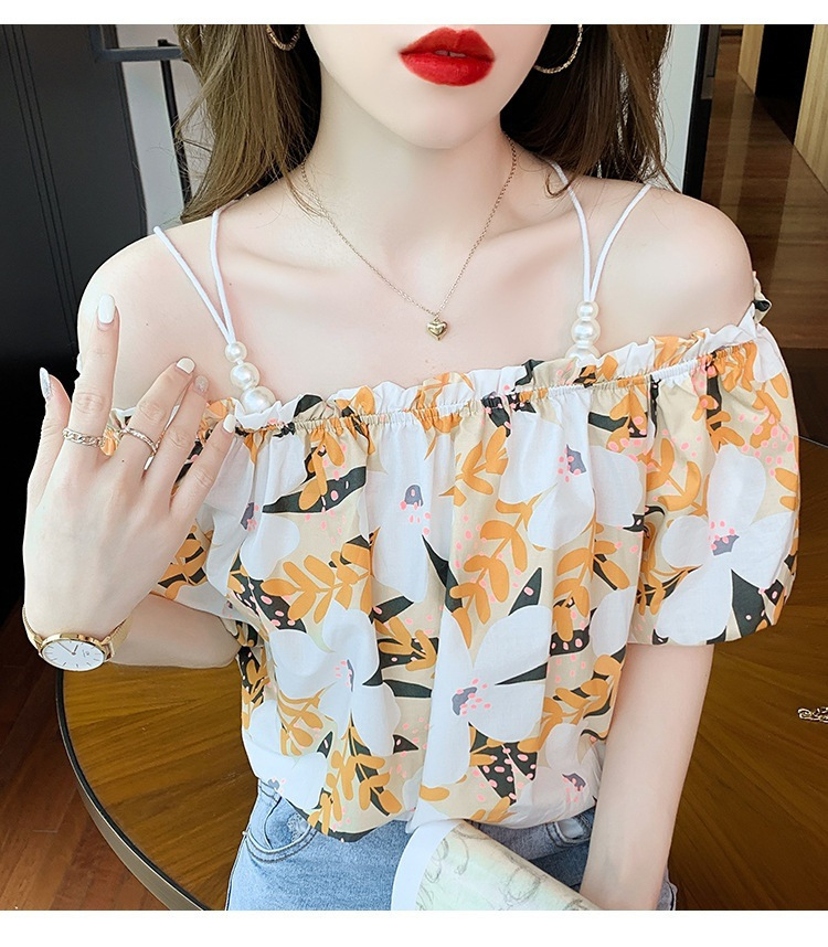 여름 새로운 섹시한 진주 체인 슬링 숄더 컬러 탑 짧은 소매 홍콩 스타일 한국 스타일 서양식 작은 셔츠