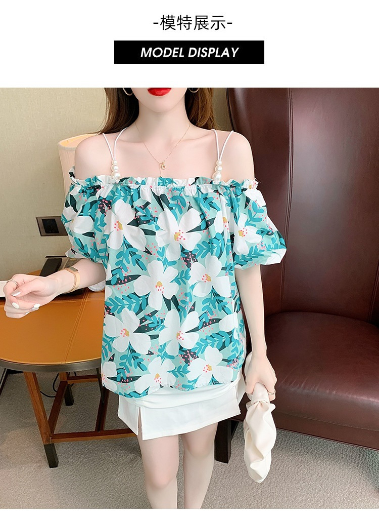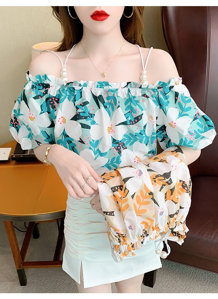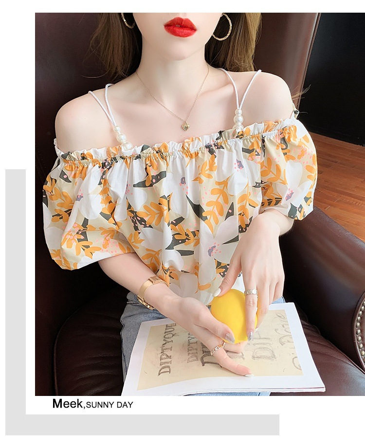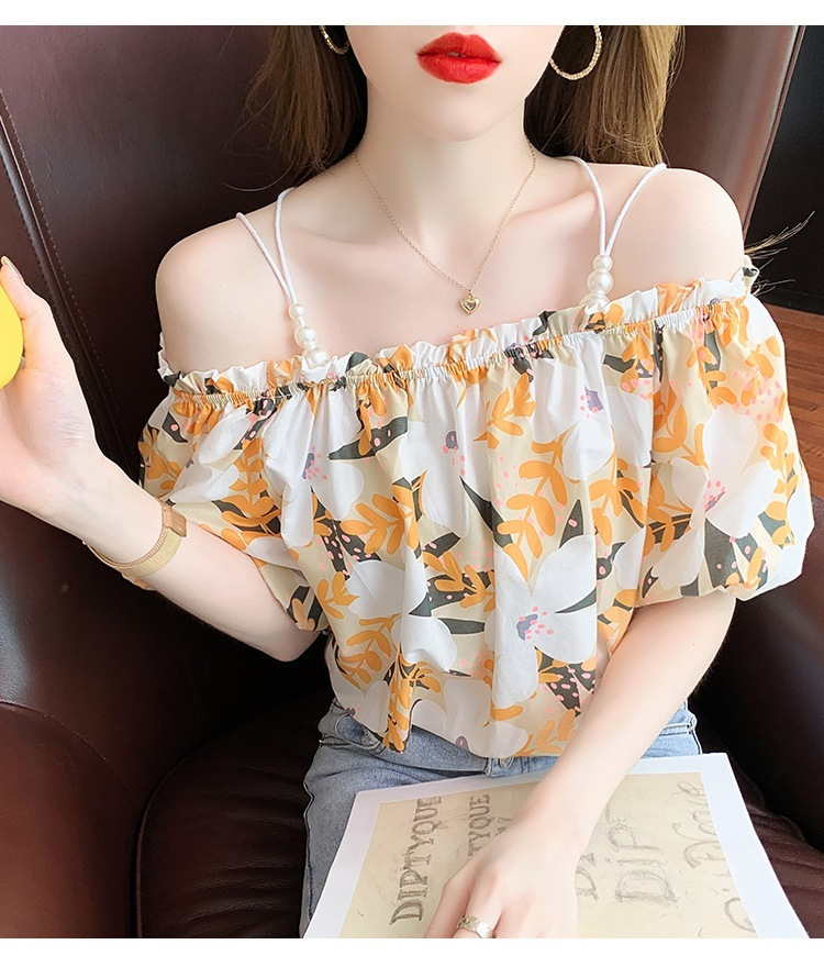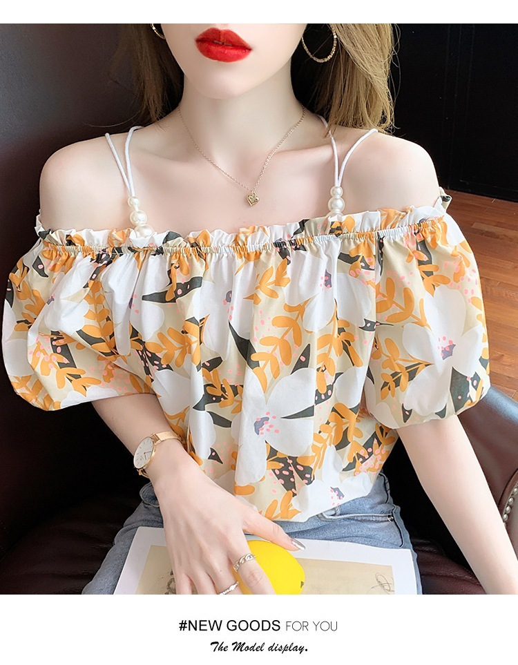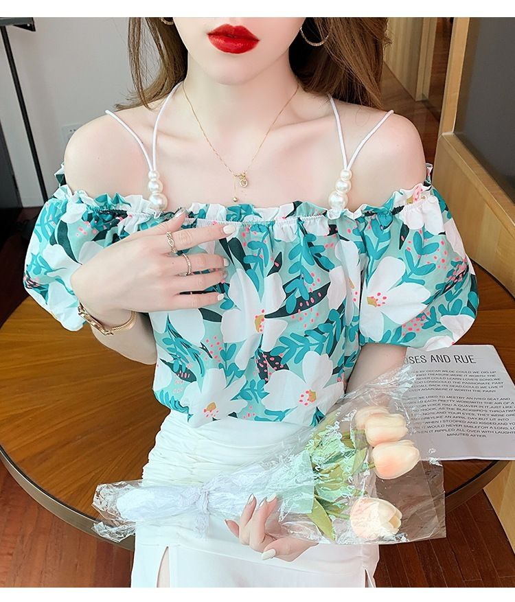여름 새로운 섹시한 진주 체인 슬링 숄더 컬러 탑 짧은 소매 홍콩 스타일 한국 스타일 서양식 작은 셔츠