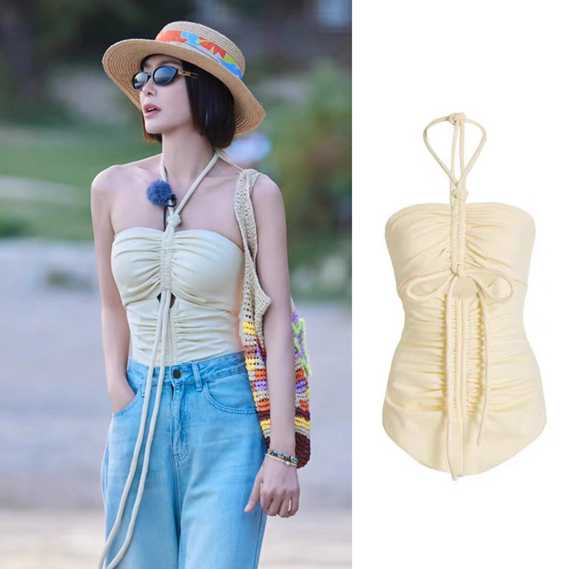 한국의 Ins 스타일 진란 같은 스타일 순수한 욕망 작은 샤넬 스타일 스트랩리스 넥 드로스트링 단순 결합 된 수영복 여성용 수영복스토어 가기