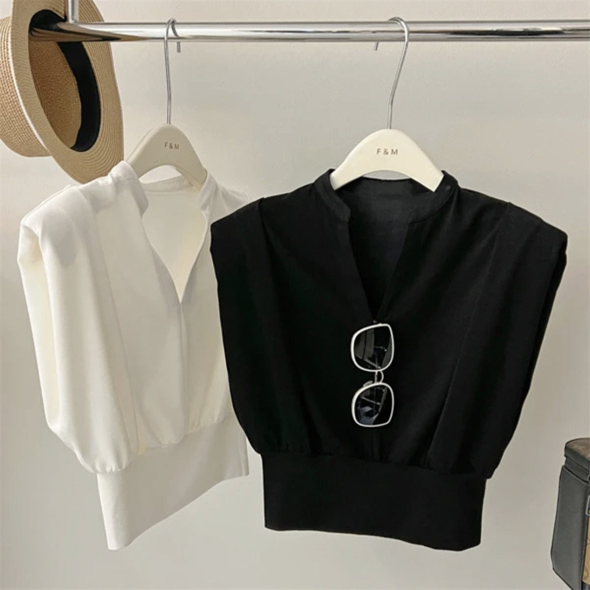 소녀 2024 여름 짧은 니트 탑 어린이 비행 슬리브 V 넥 티셔츠 단색 Ins 어린이를위한 세련된 민소매 조끼
