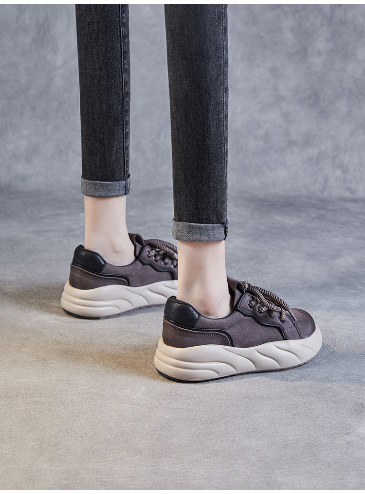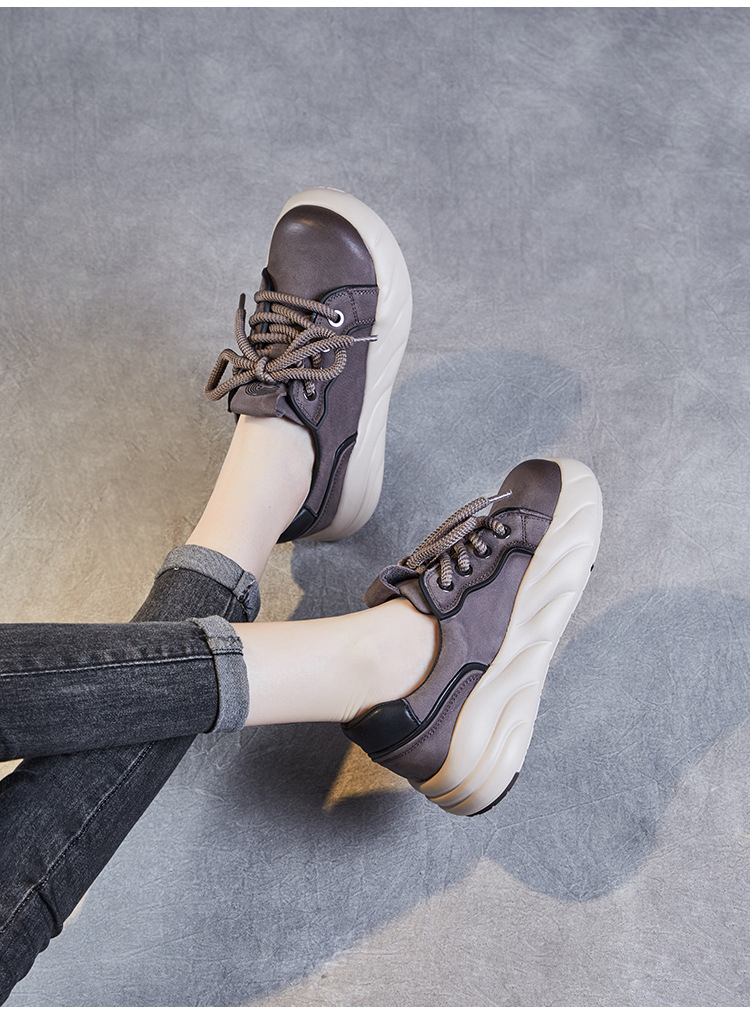 2024 봄 새로운 첫 번째 레이어 소 가죽 빈티지 수제 신발 올 매치 두꺼운 바닥 라운드 토 레이스 업 스포츠 캐주얼 정품 가죽 여성 신발