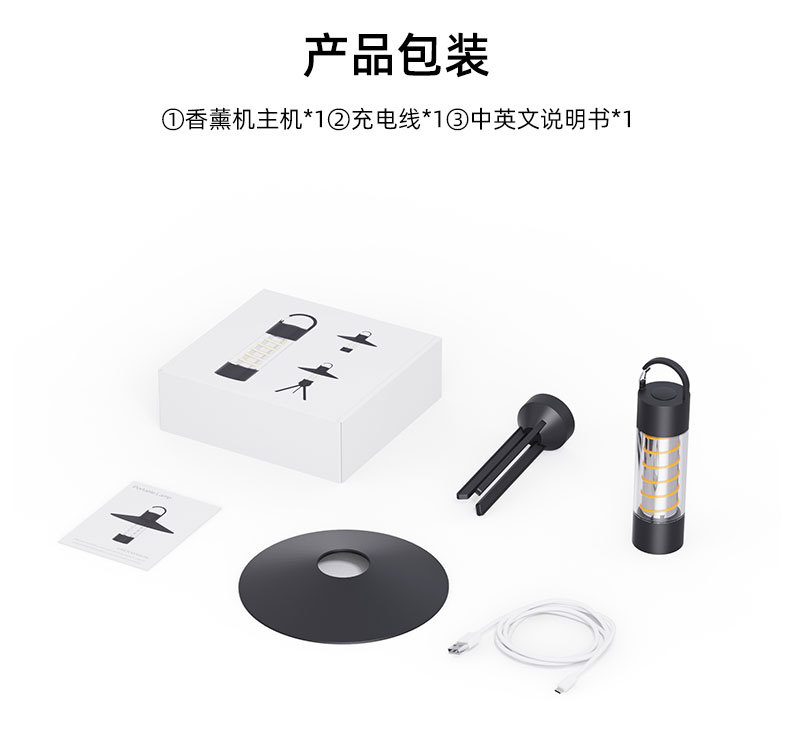 产品附带配件明细:主机*1、硅胶灯罩*1、三角架*1、充电线*1、中英文说明书*1