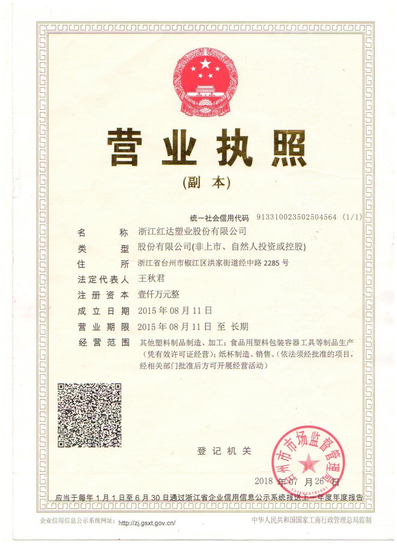 浙江红达塑业有限公司,成立于1993年,位于台州椒江洪家塑料工业园区。占地面积6000多方,具备年生产能力1500万美元以上。主要生产一次性包装用品:一次性塑料杯、纸杯、一次性饭盒、一次性塑料盘子等产品。公司拥有先进的设备、雄厚的设计能力及现代的管理体系。公司通过QS,及ISO9001。满足与超越顾客需求是公司发展的动力。浙江红达塑业有限公司本着诚信、实力和产品质量获得业界的认可。欢迎各界朋友莅临参观、指导和业务洽谈。