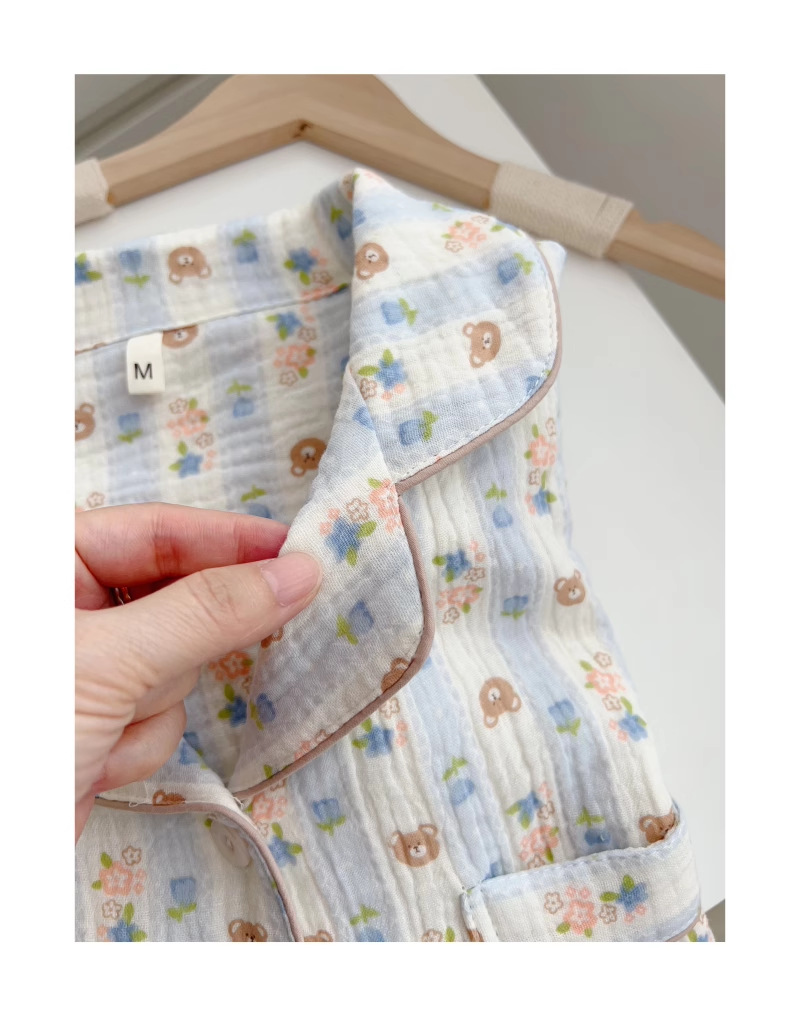 블루 베어 면사 잠옷 여성의 가을과 겨울 만화 귀여운 프린트 긴팔 바지 간단한 홈웨어 세트