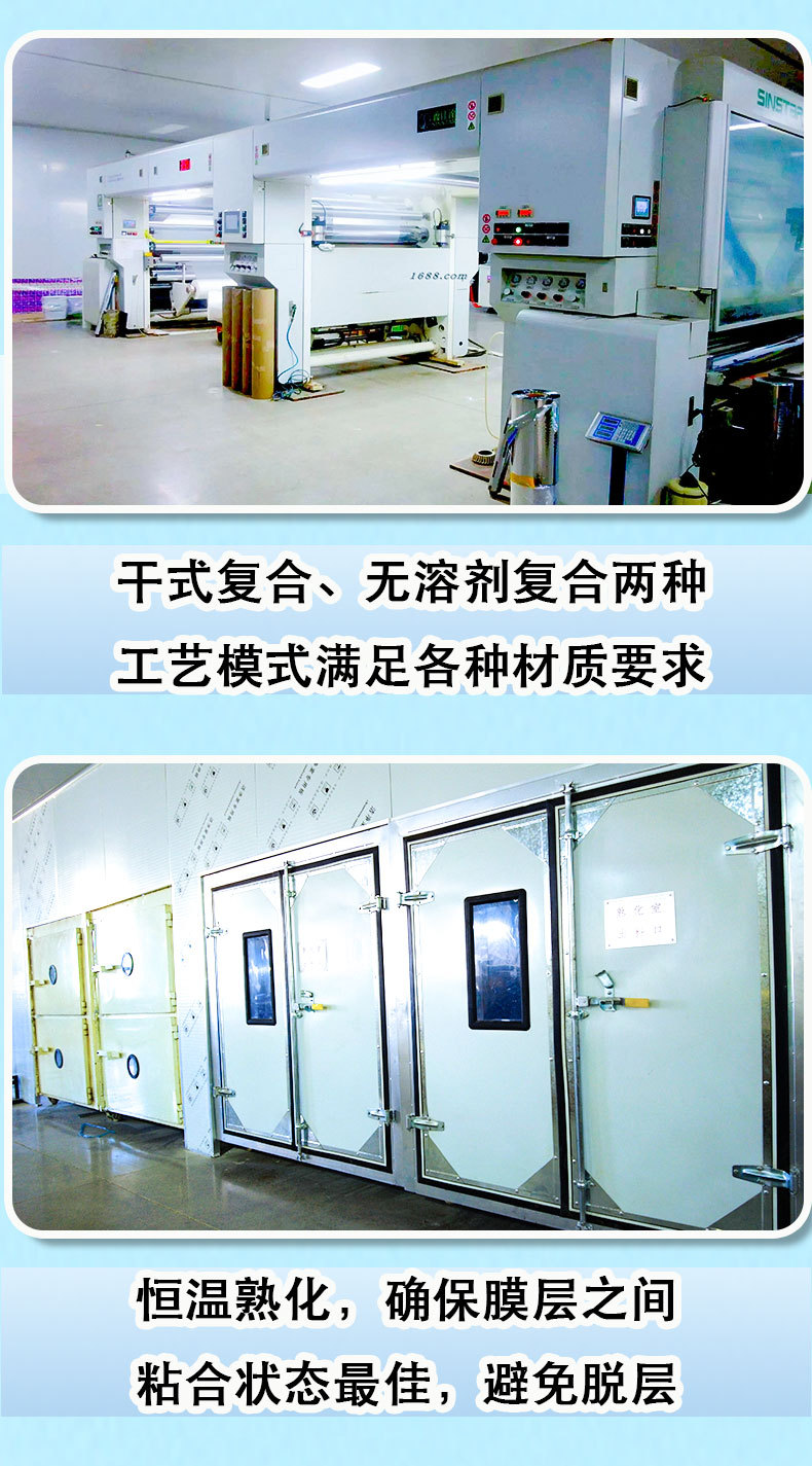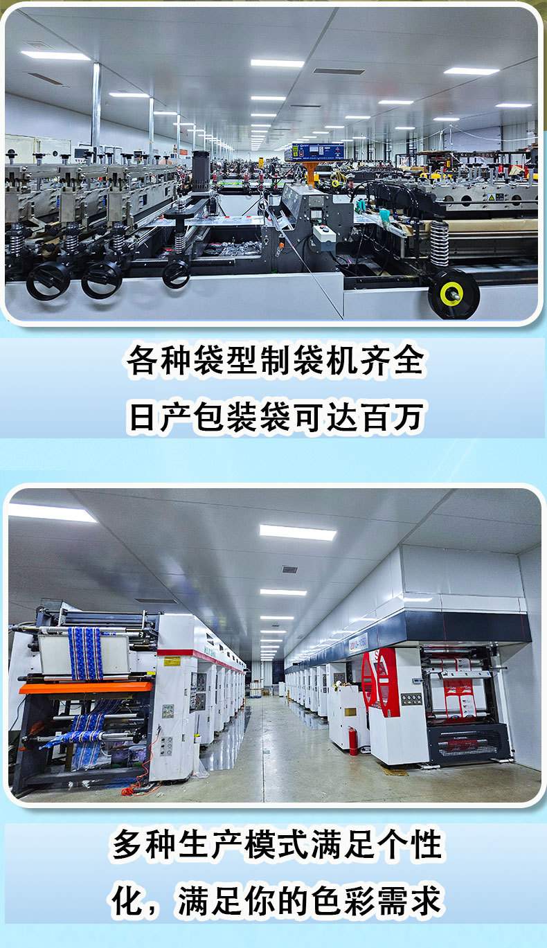 7.拥有40+台先进设备:复合机、印刷机、分切机、制袋机等,日产超100万条,大货生产也能稳定按期交付。