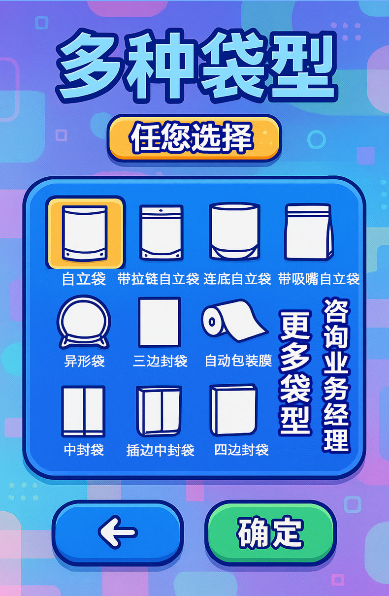 4.提供十余种袋型选择:三边封袋、自立袋、自立拉链袋、八边封袋、背封风琴袋、异形袋、吸嘴袋等适用于冻干食品、坚果、宠粮、零食、干货、粮油等多品类食品包装。