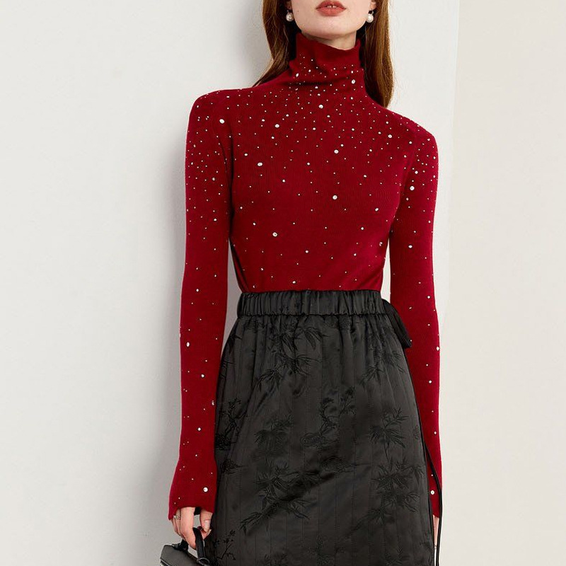 프랑스 모조 다이아몬드 새해 복 스웨터 여성 의류 2023 가을과 겨울 새로운 터틀넥 따뜻한 슬림 스웨터