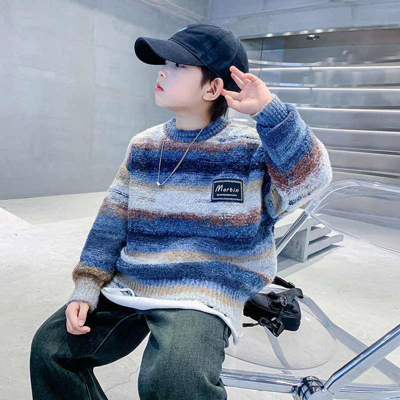 소년 겨울 유행 스트라이프 그라데이션 두꺼운 스웨터 2024 새로운 어린이 소년 가을, 겨울 따뜻한 스웨터스토어 가기