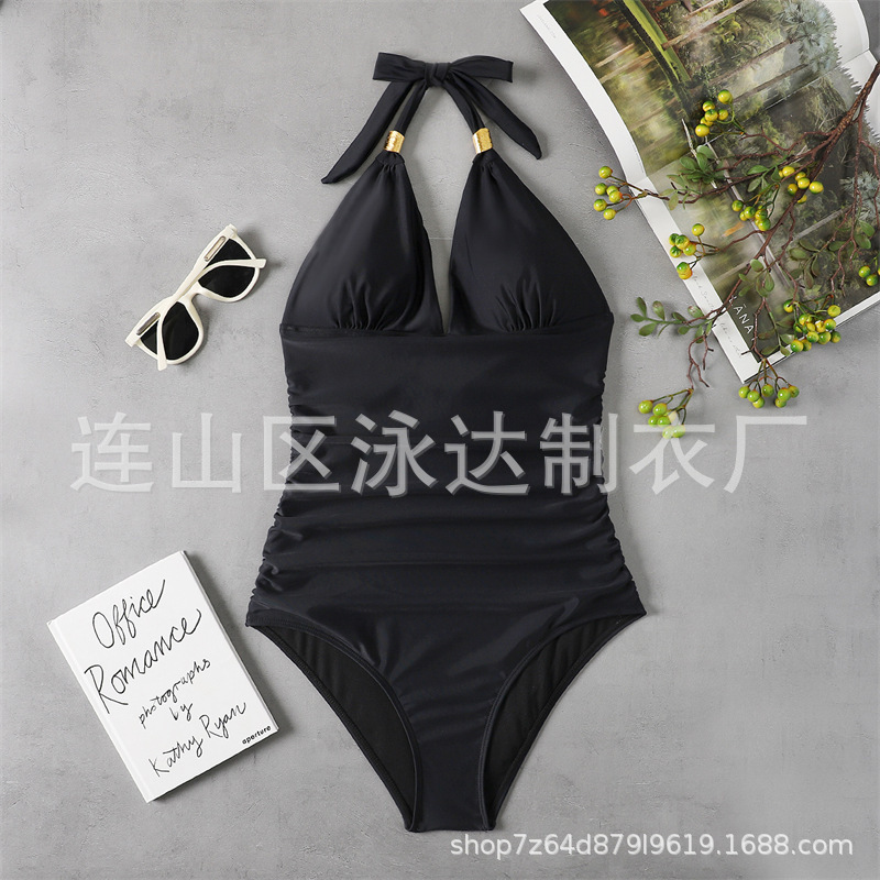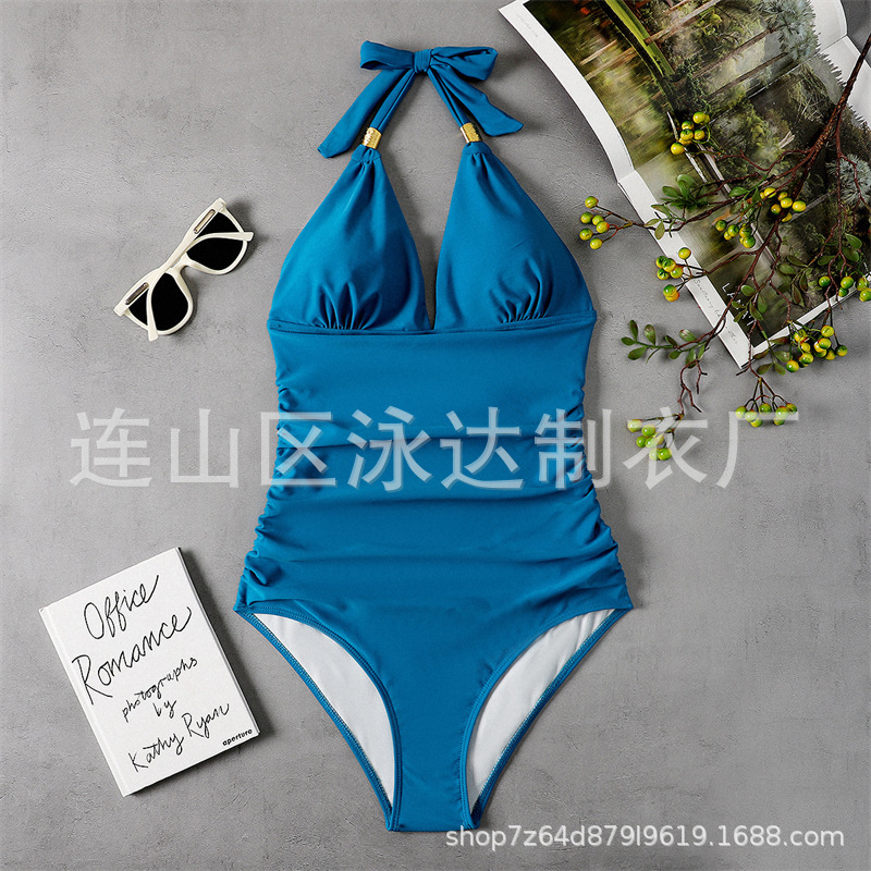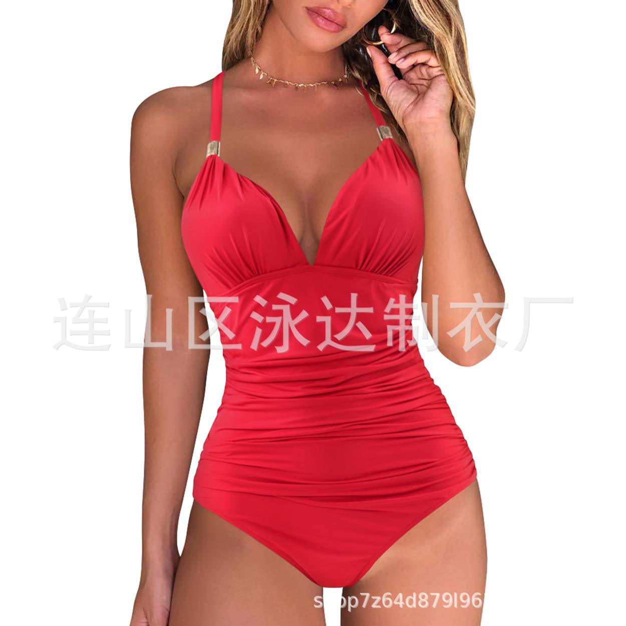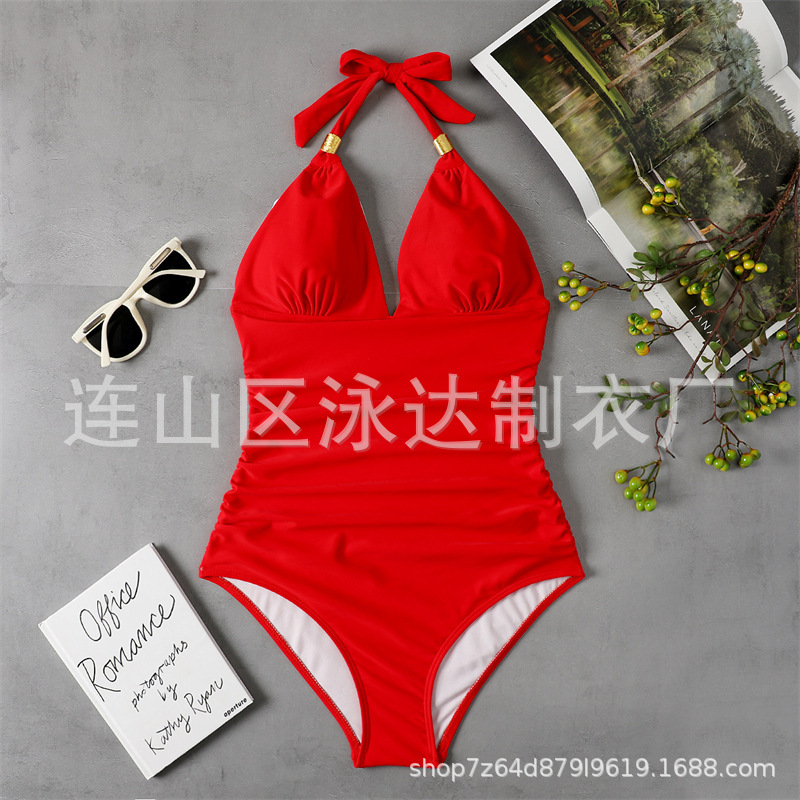 2023 새로운 대외 무역 배경없는 아마존 유럽과 미국 국경 간 수영복 보수적 인 단색 목 붉은 수영복스토어 가기