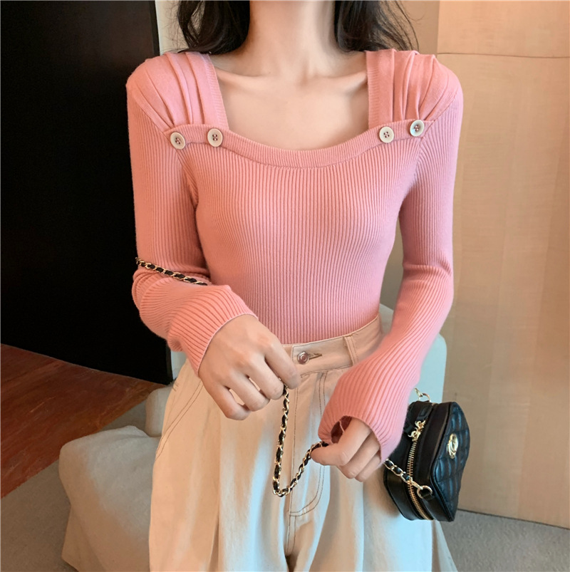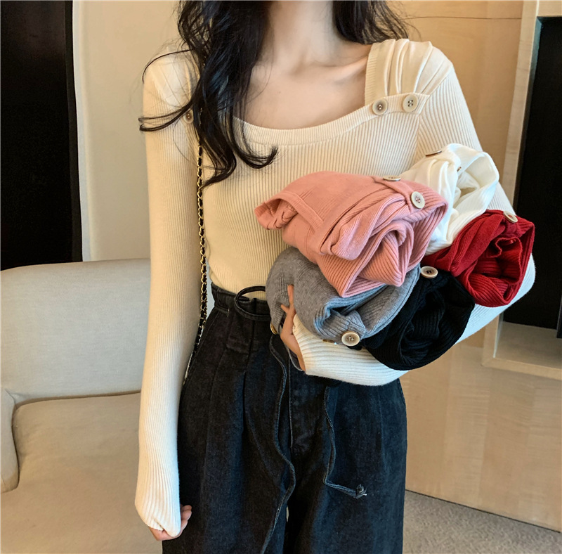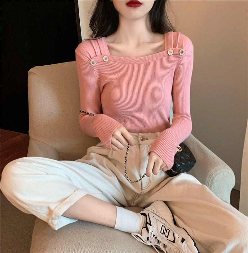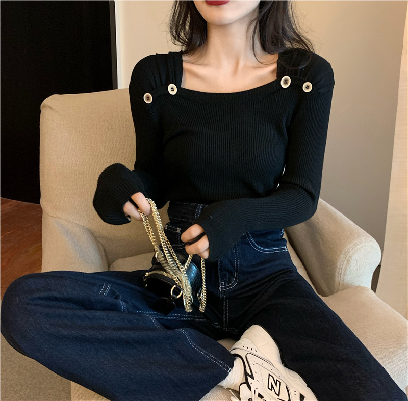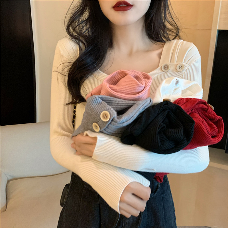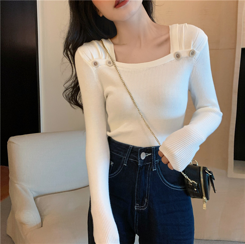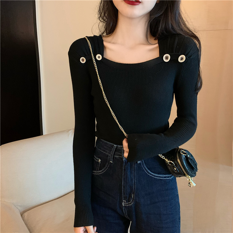 봄과 가을의 얇은 올 매치 슬림 핏 긴팔 바닥 스웨터 최고 서양식 프랑스 스퀘어 칼라 내부 스웨터 가을 및 겨울 여성스토어 가기