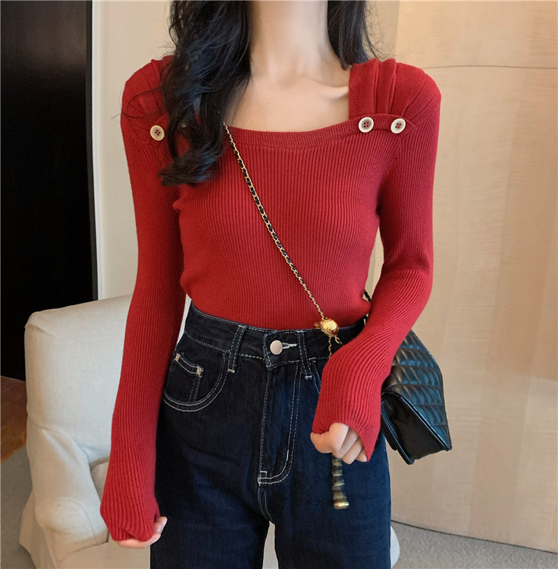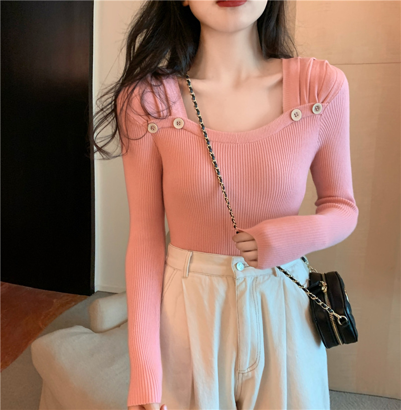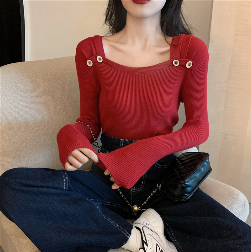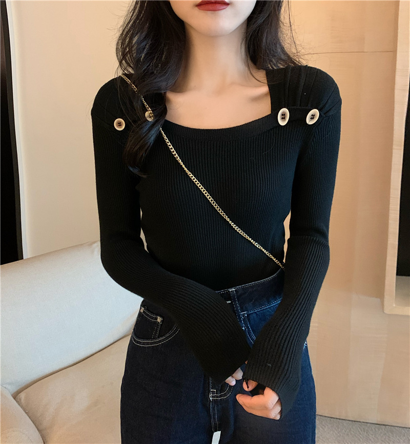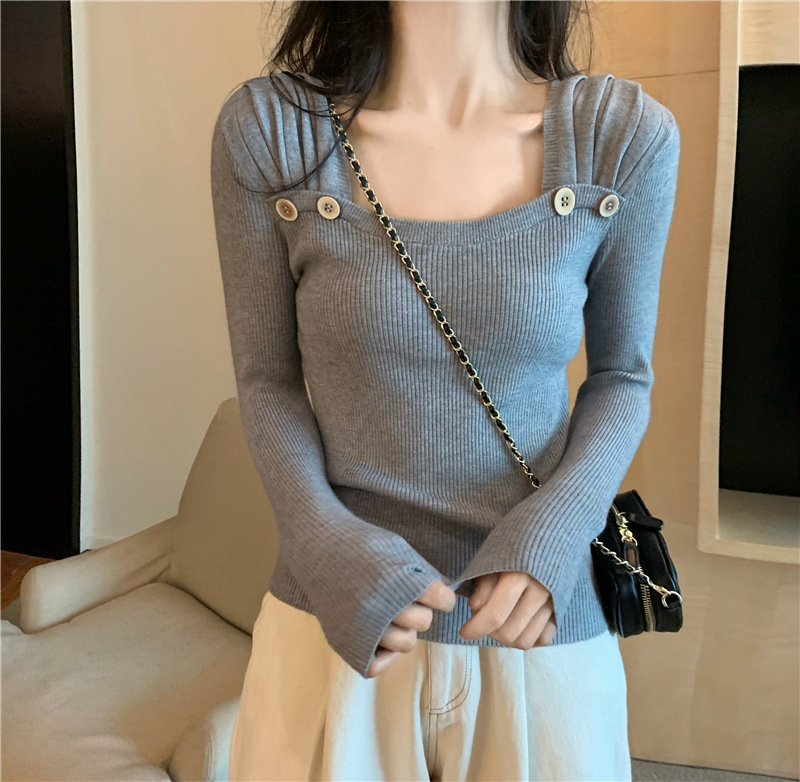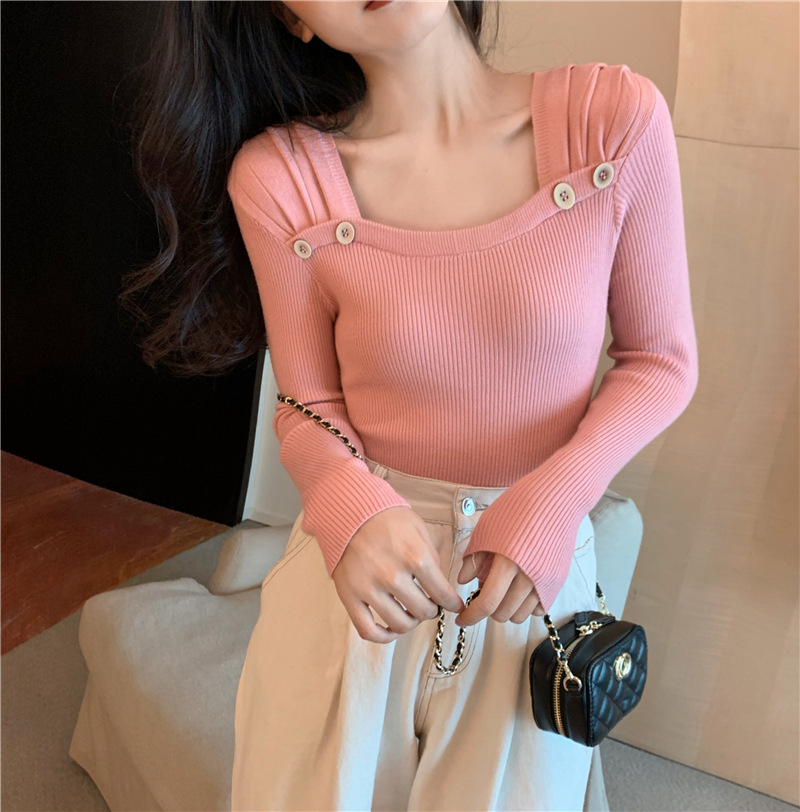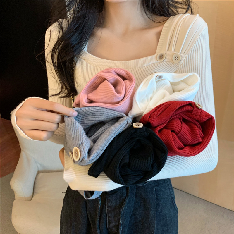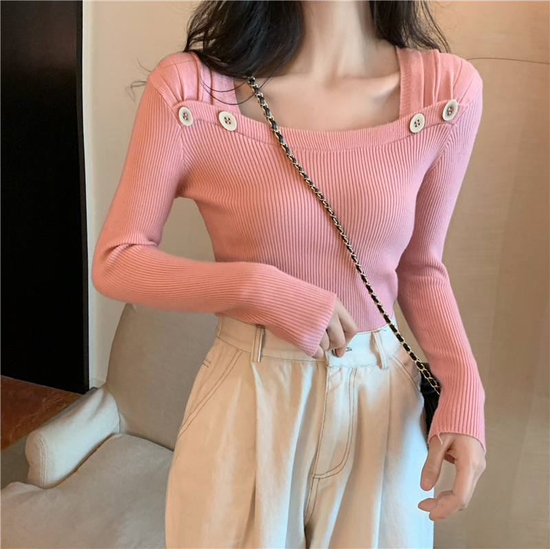봄과 가을의 얇은 올 매치 슬림 핏 긴팔 바닥 스웨터 최고 서양식 프랑스 스퀘어 칼라 내부 스웨터 가을 및 겨울 여성스토어 가기