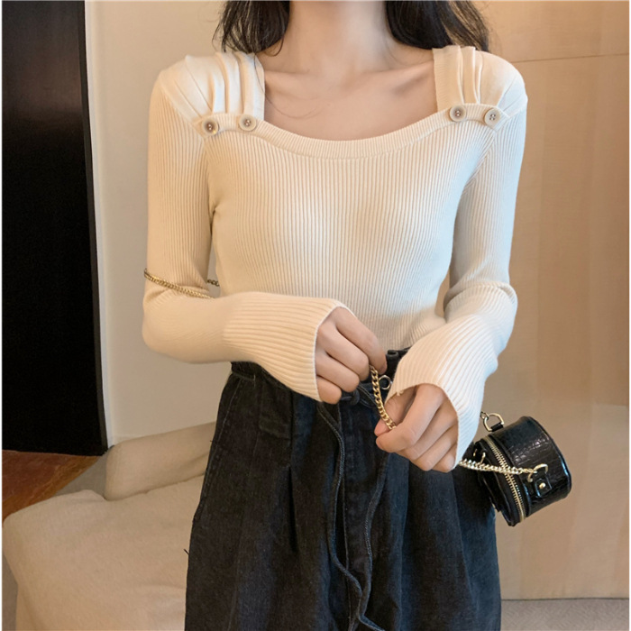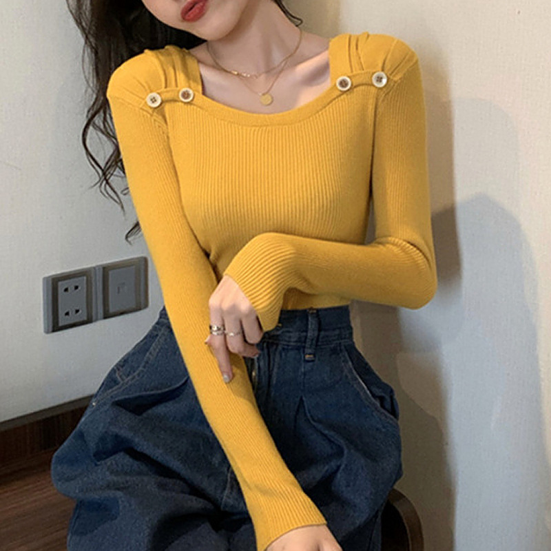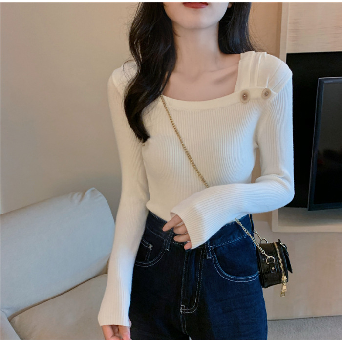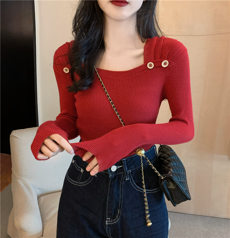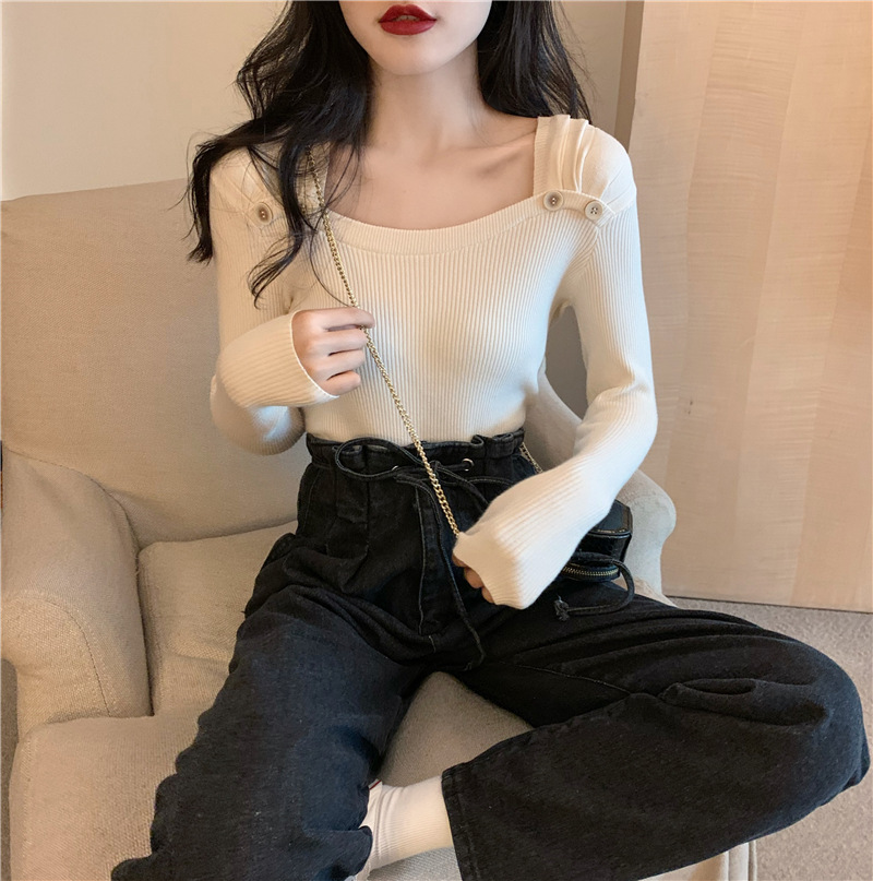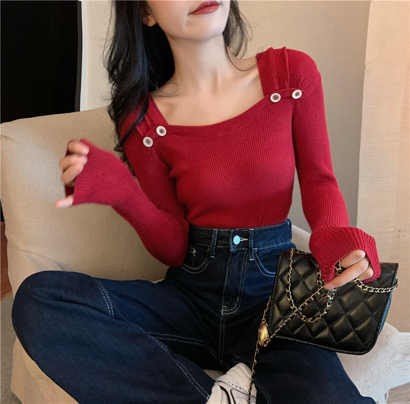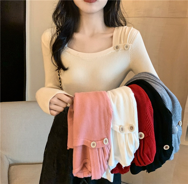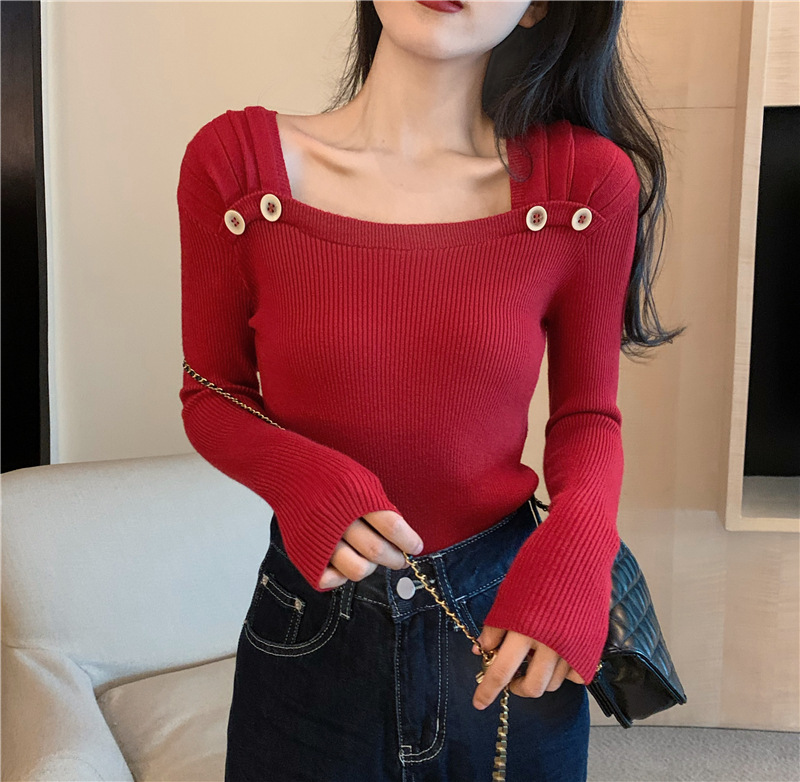 봄과 가을의 얇은 올 매치 슬림 핏 긴팔 바닥 스웨터 최고 서양식 프랑스 스퀘어 칼라 내부 스웨터 가을 및 겨울 여성스토어 가기