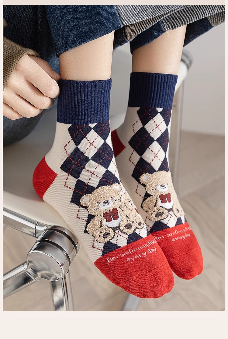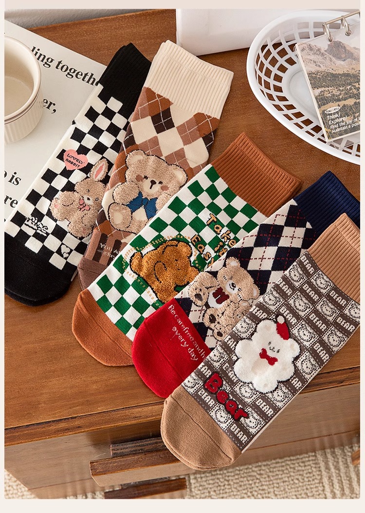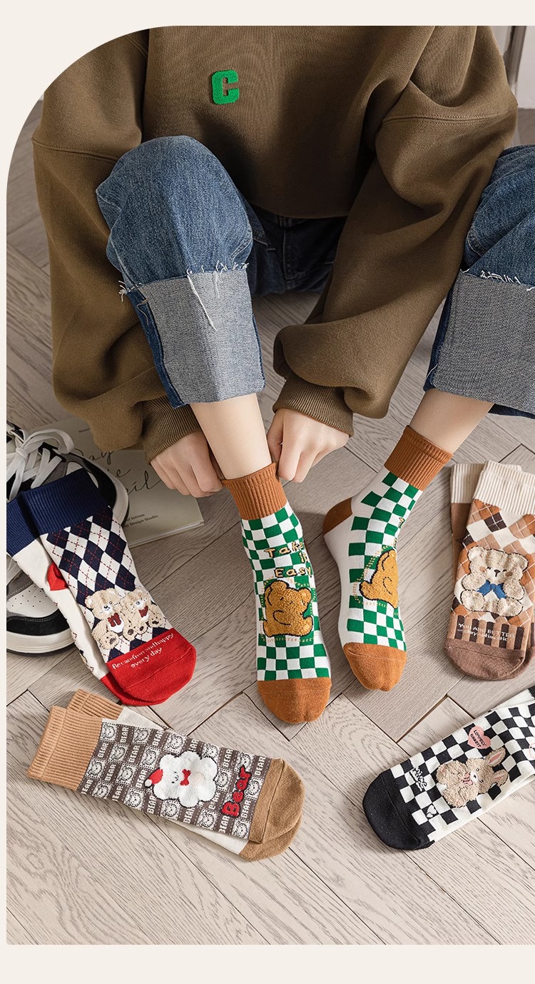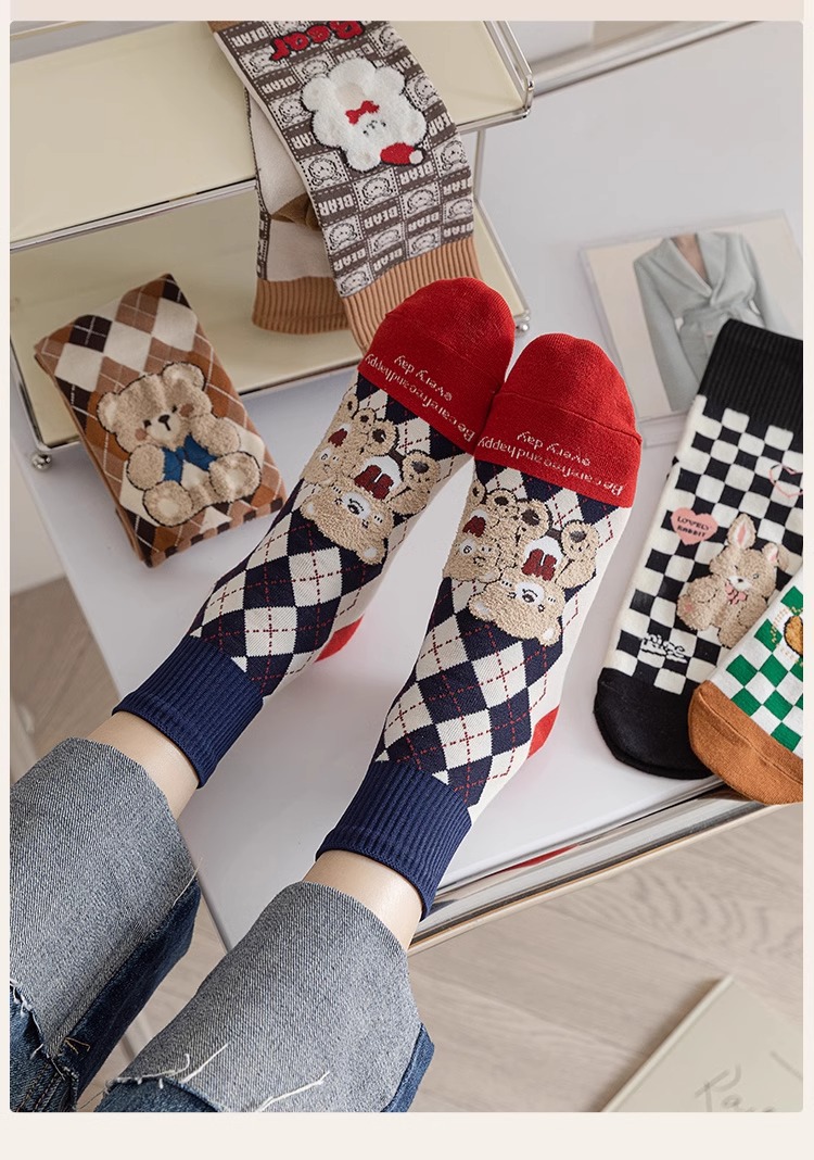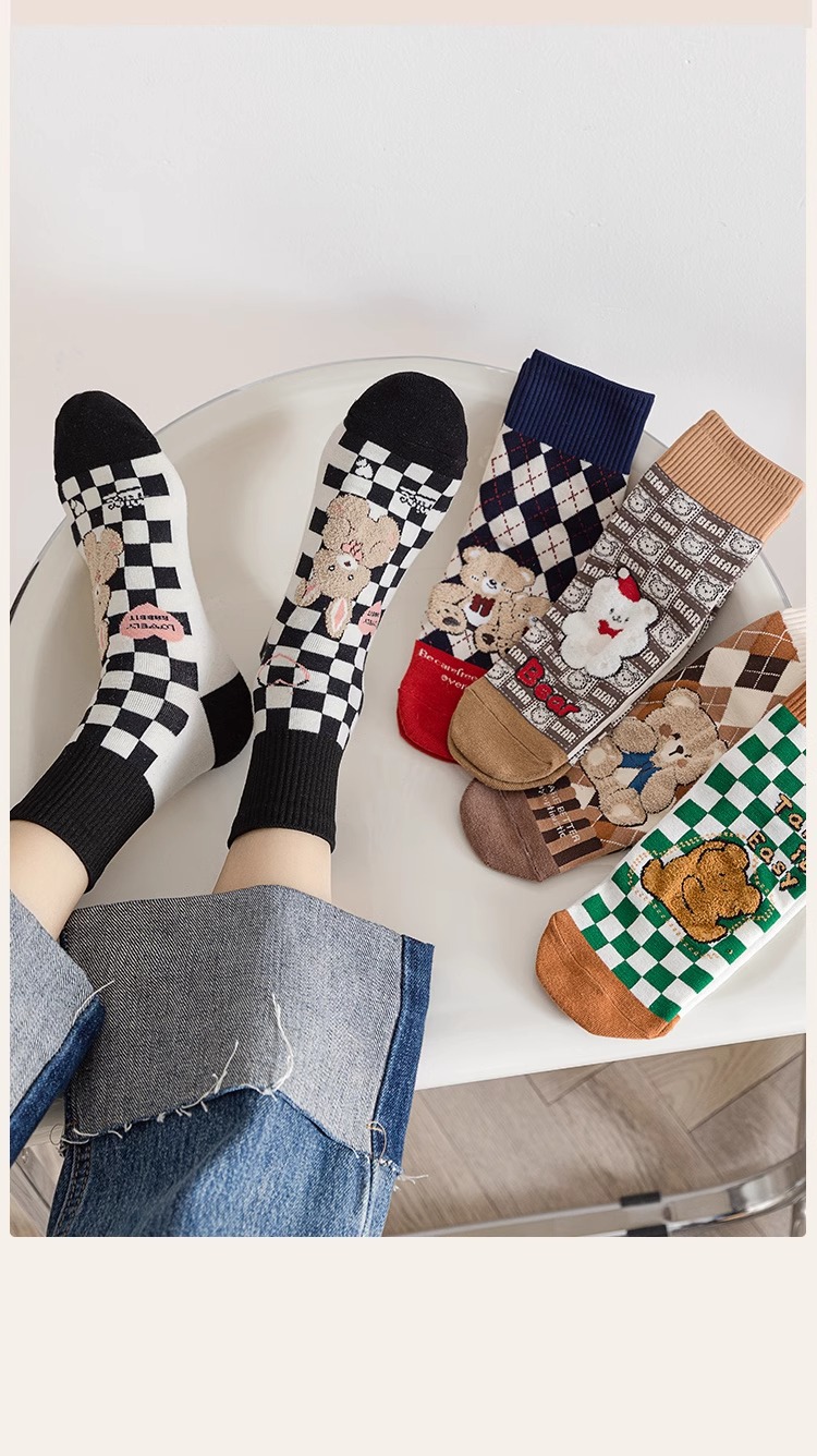 체스보드 체크 양말 새로운 가을과 겨울에 2024 여성의 중간 종아리 길이 양말 곰 만화 프레피 스타일 스트레이트 스타킹 도매