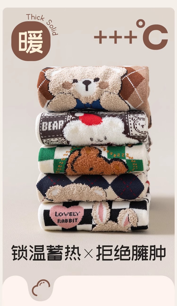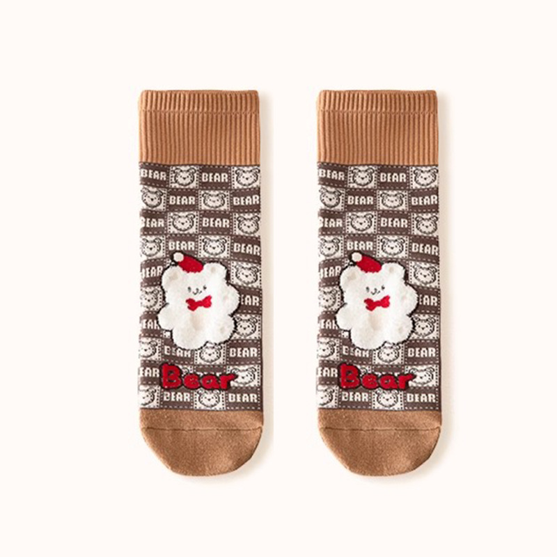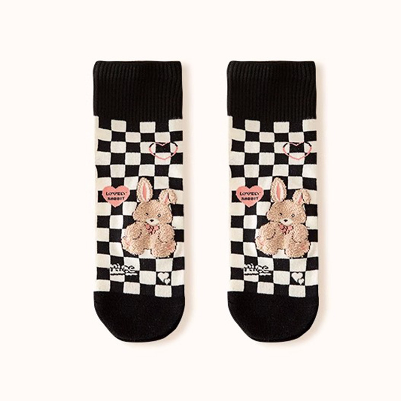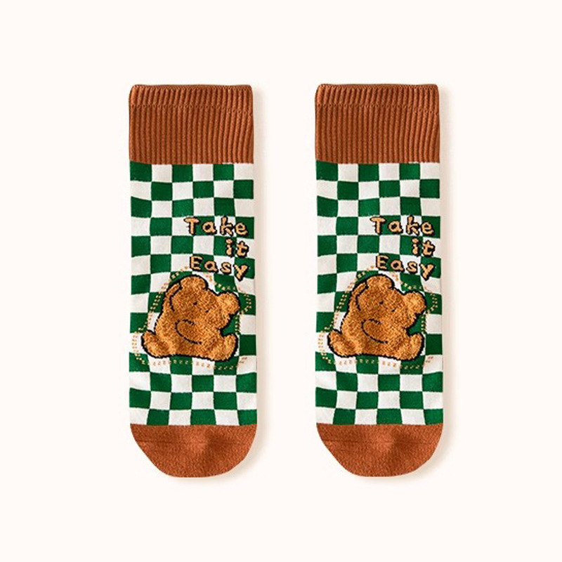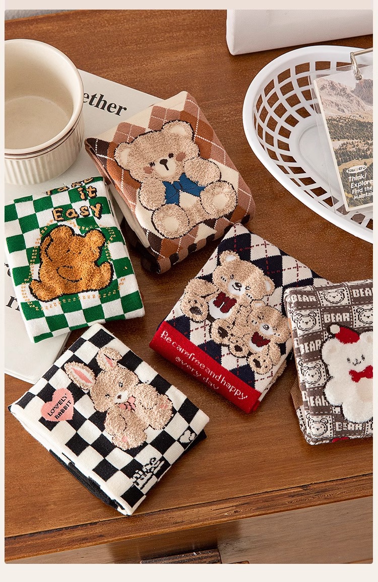 체스보드 체크 양말 새로운 가을과 겨울에 2024 여성의 중간 종아리 길이 양말 곰 만화 프레피 스타일 스트레이트 스타킹 도매