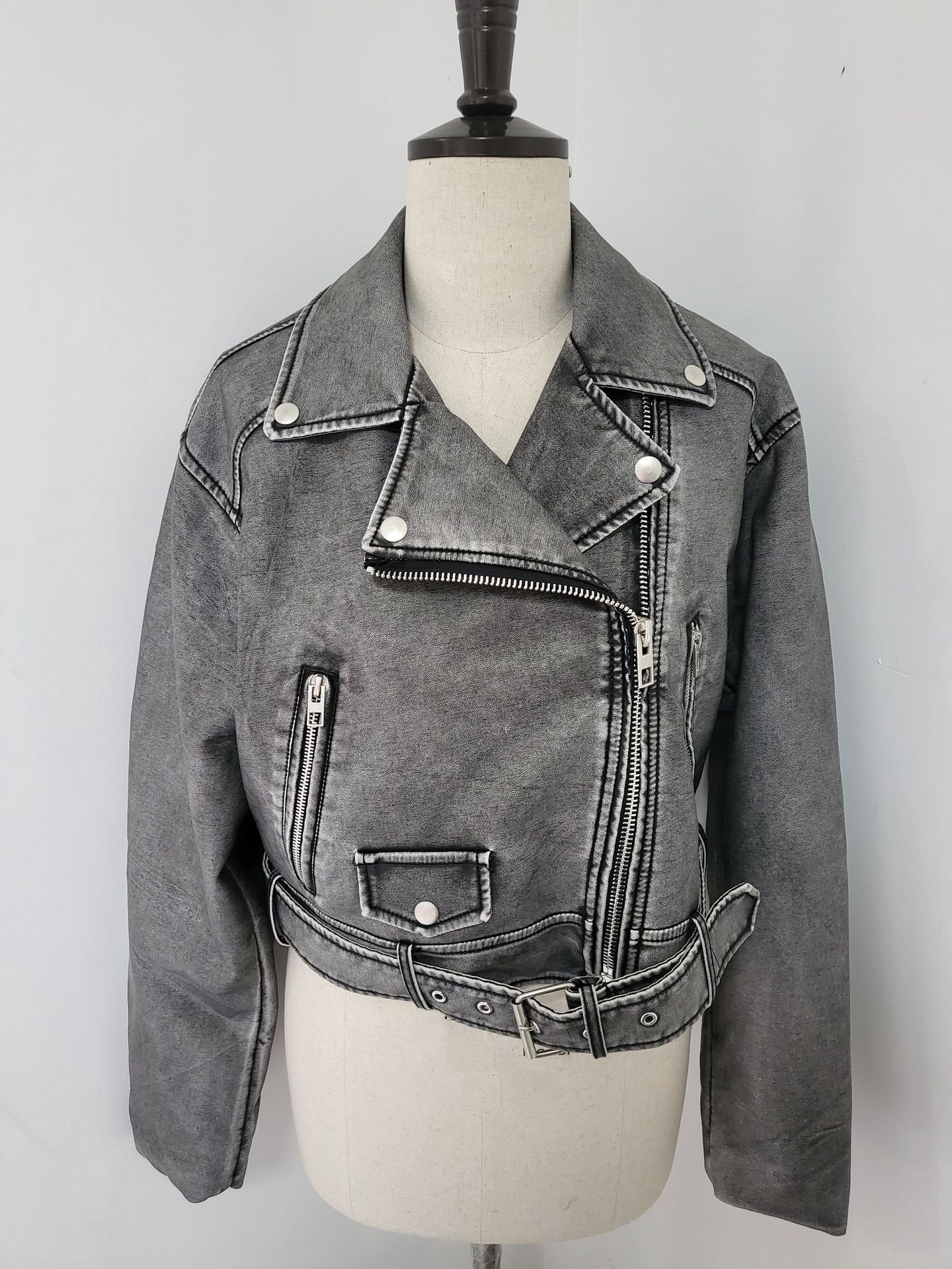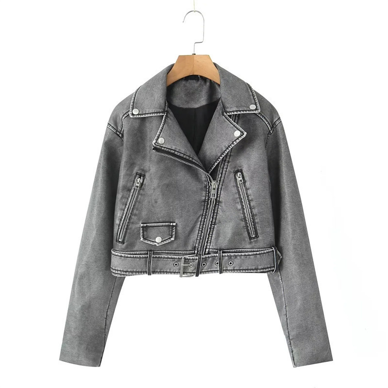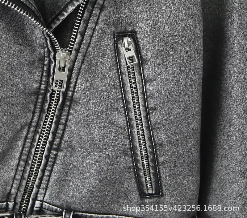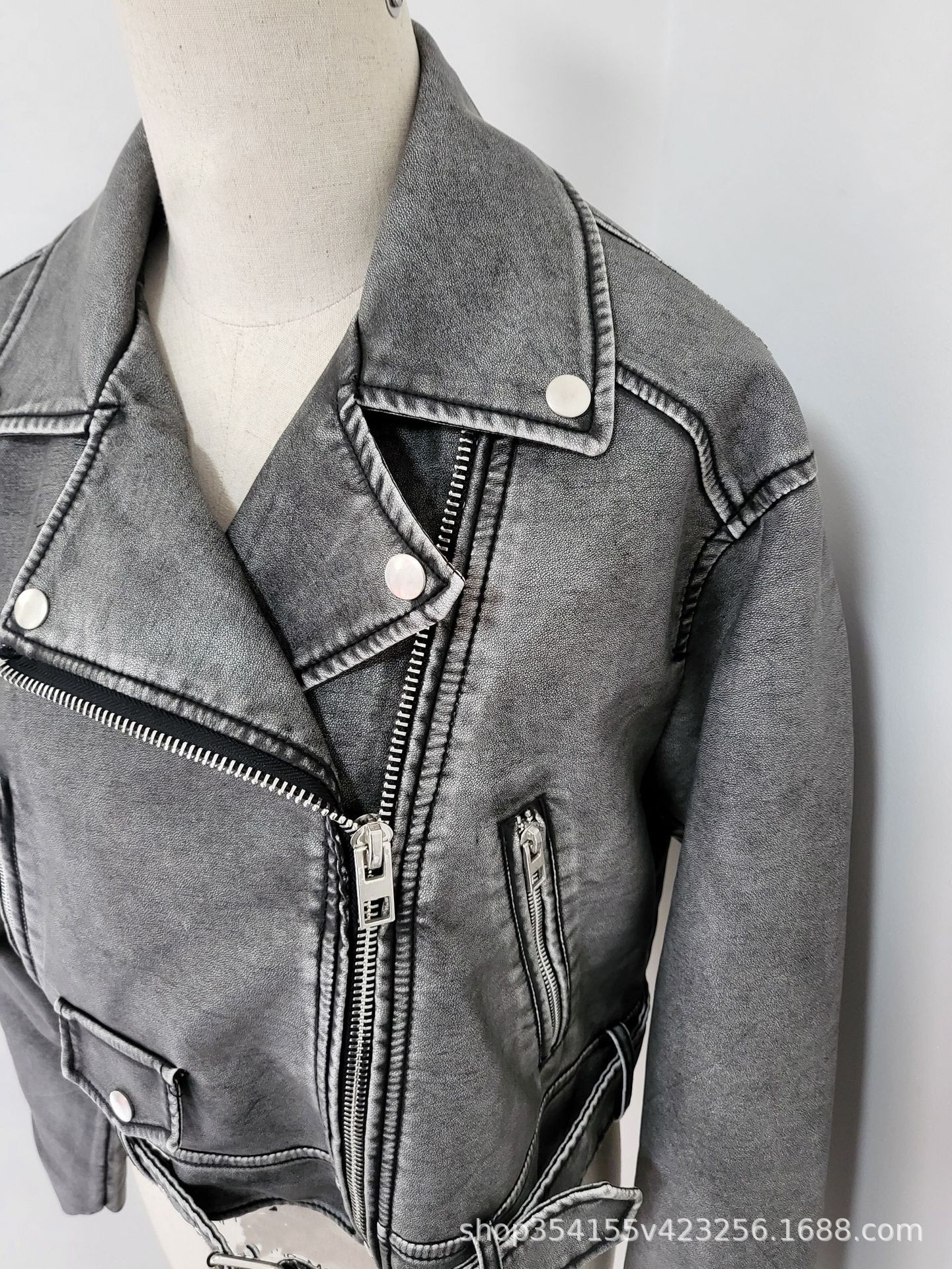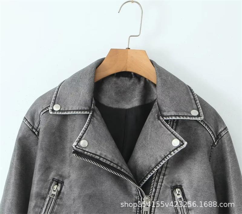 유럽과 미국 국경 대외 무역 2024 가을 새로운 여성 세탁 가죽 낡은 오토바이 캐주얼 단색 재킷 가죽 여성스토어 가기