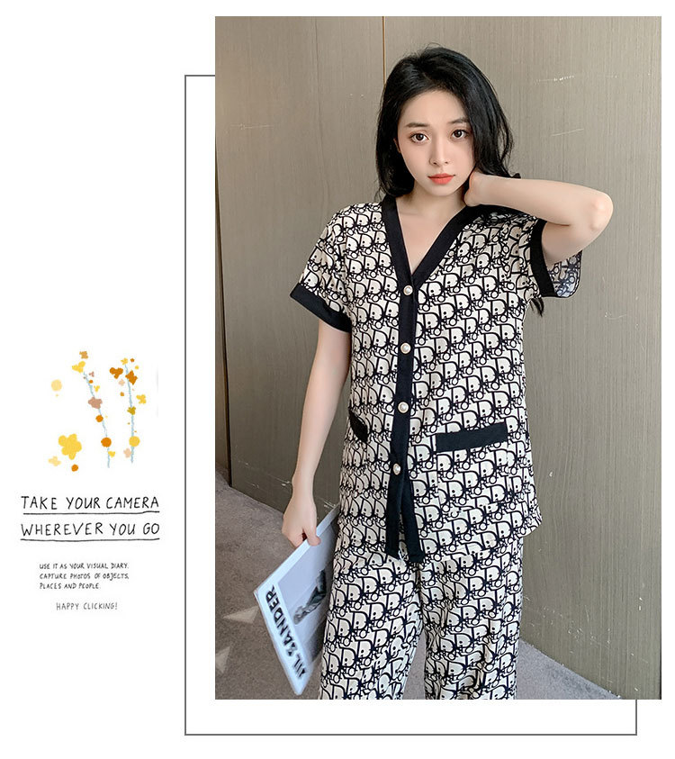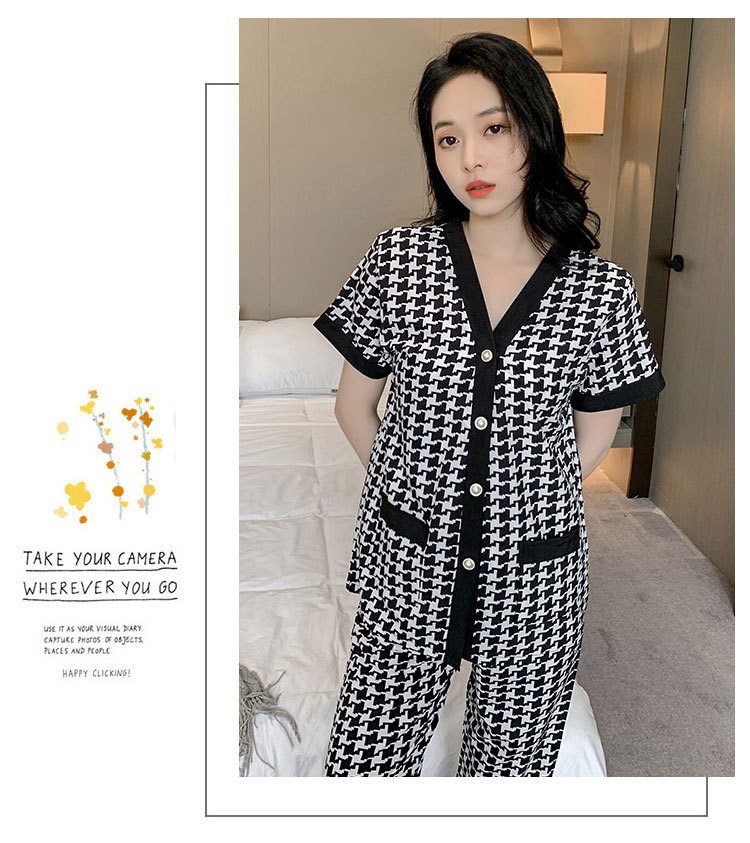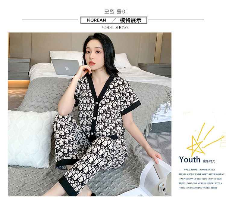 잠옷 여성용 카디건 V 넥 얇은 반팔 바지 벽면 플러스 사이즈 홈웨어 세트스토어 가기