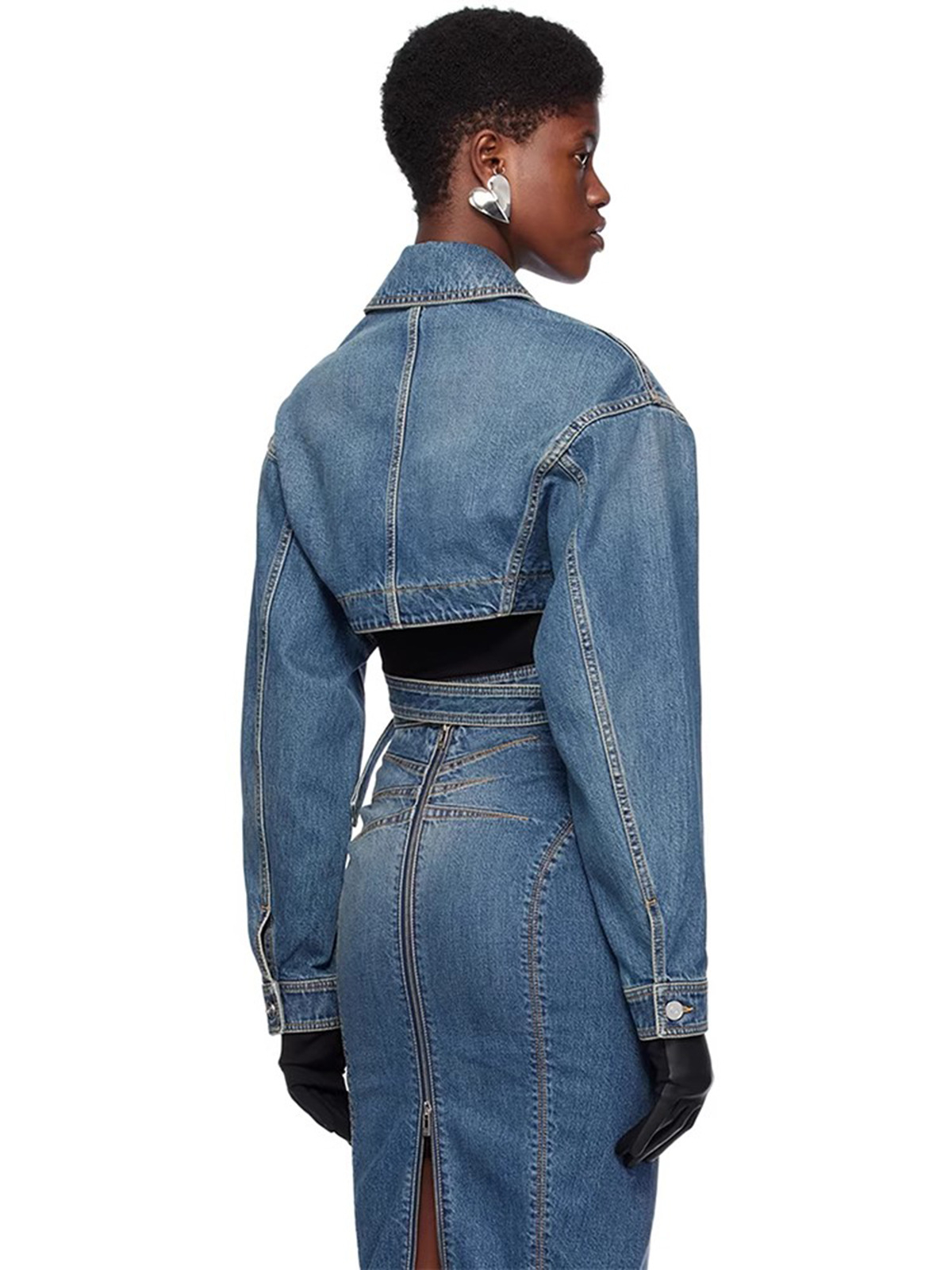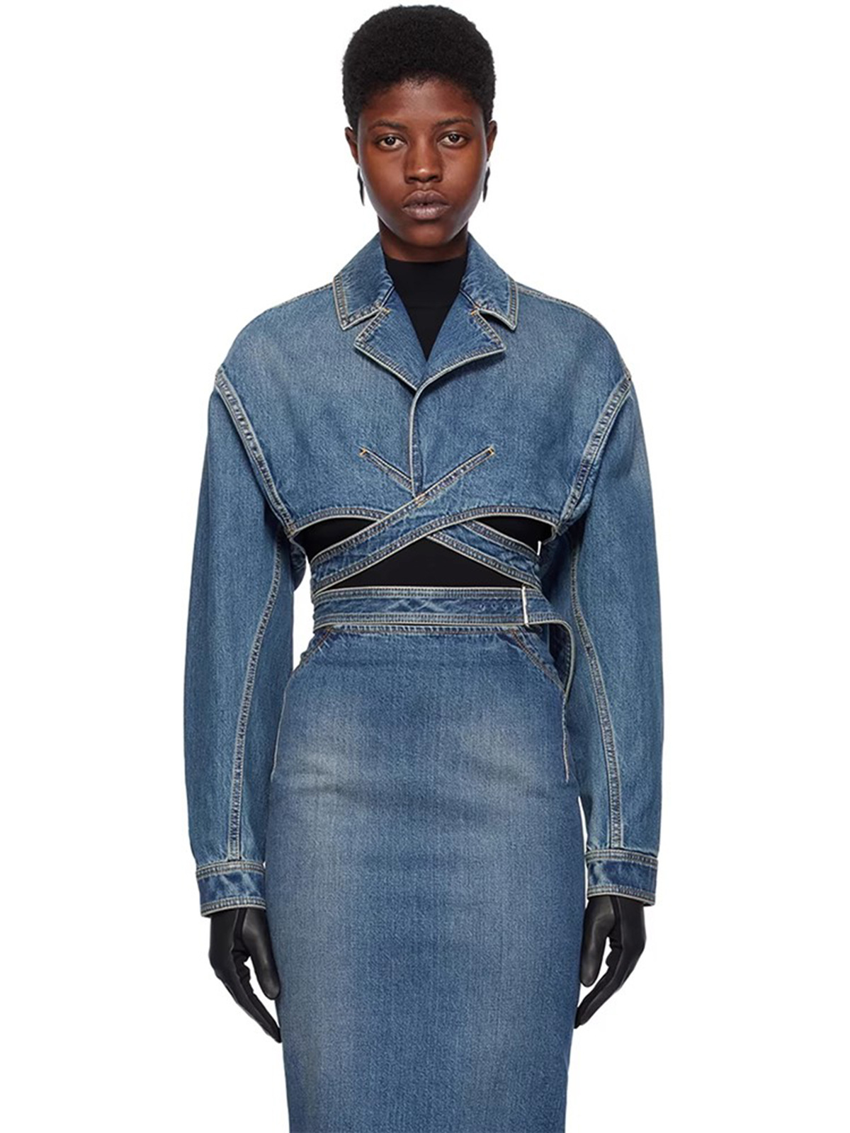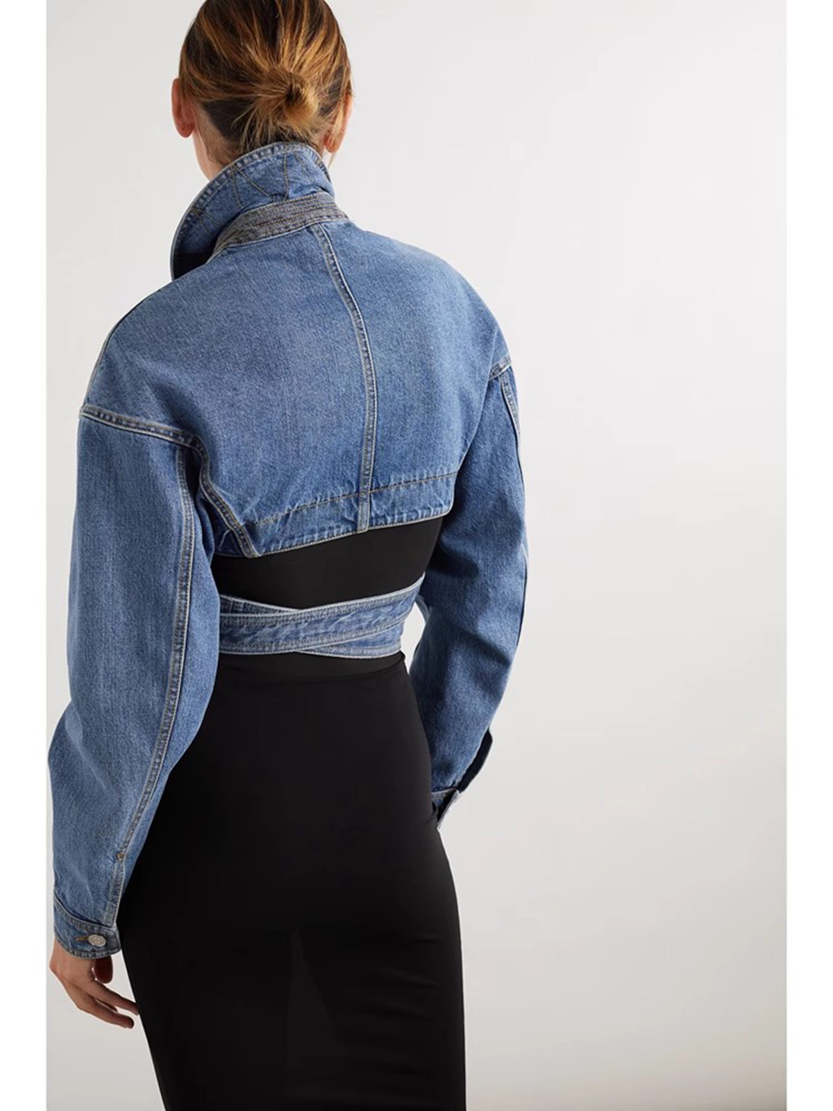 틈새 디자인 센스 탑 코트 2024 봄 크로스 폴드 천공 빈 허리 레이스 업 짧은 여자 데님 재킷