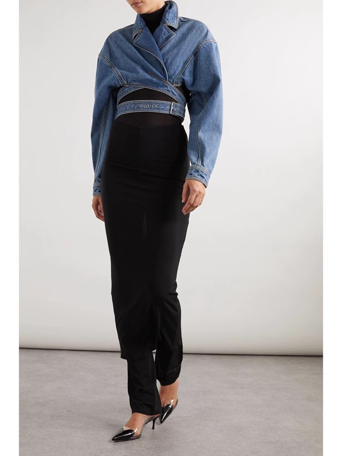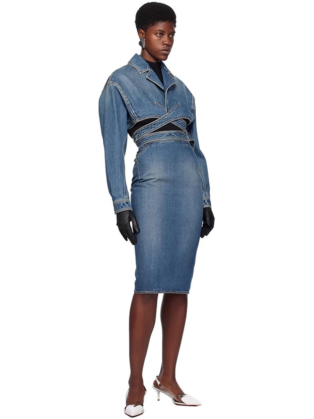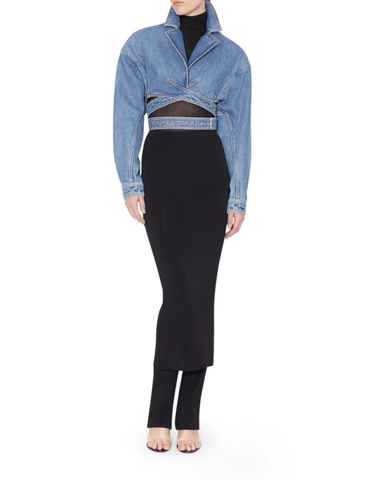 틈새 디자인 센스 탑 코트 2024 봄 크로스 폴드 천공 빈 허리 레이스 업 짧은 여자 데님 재킷