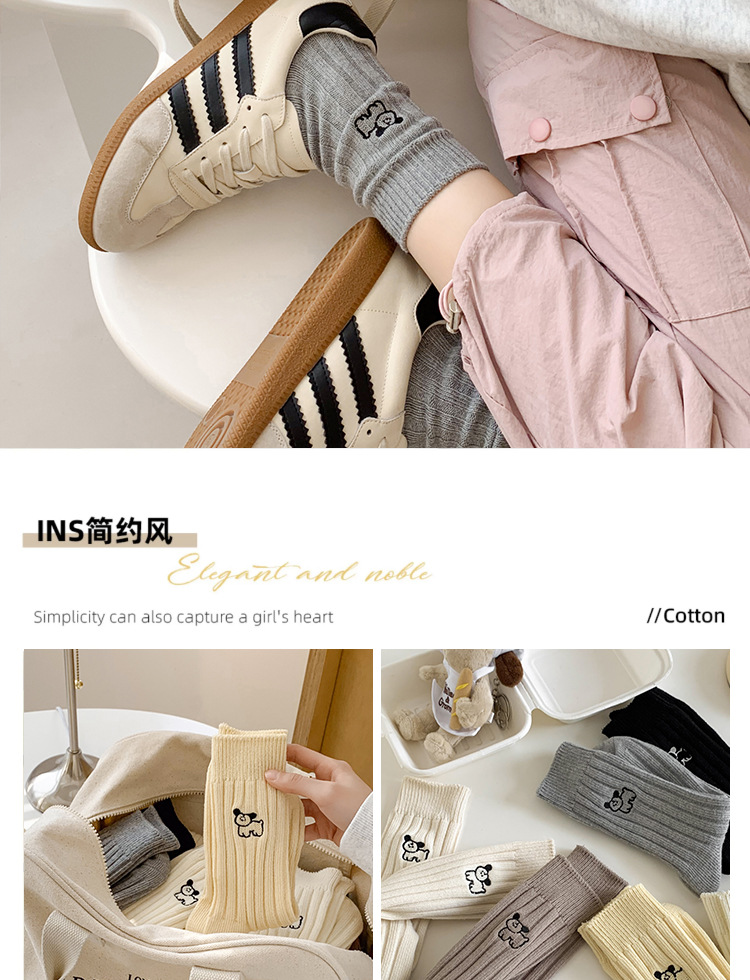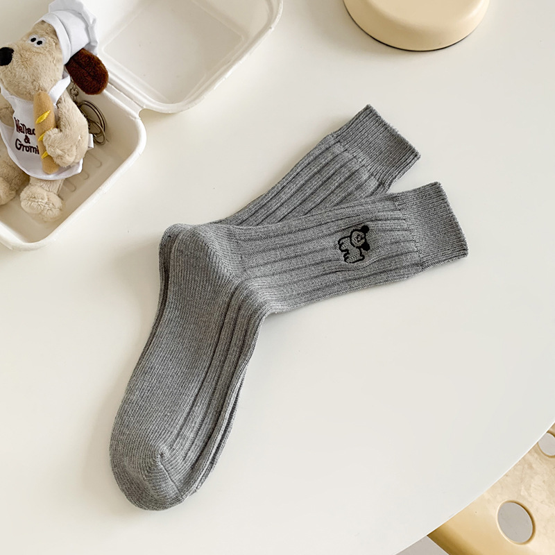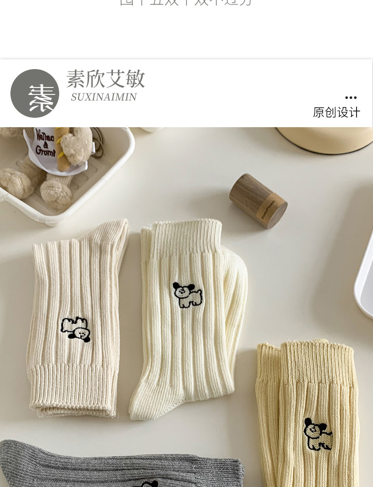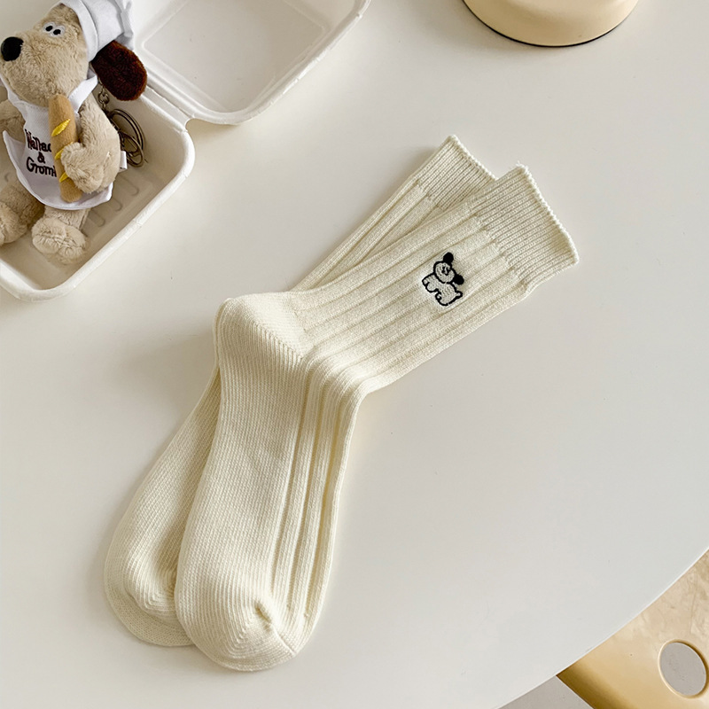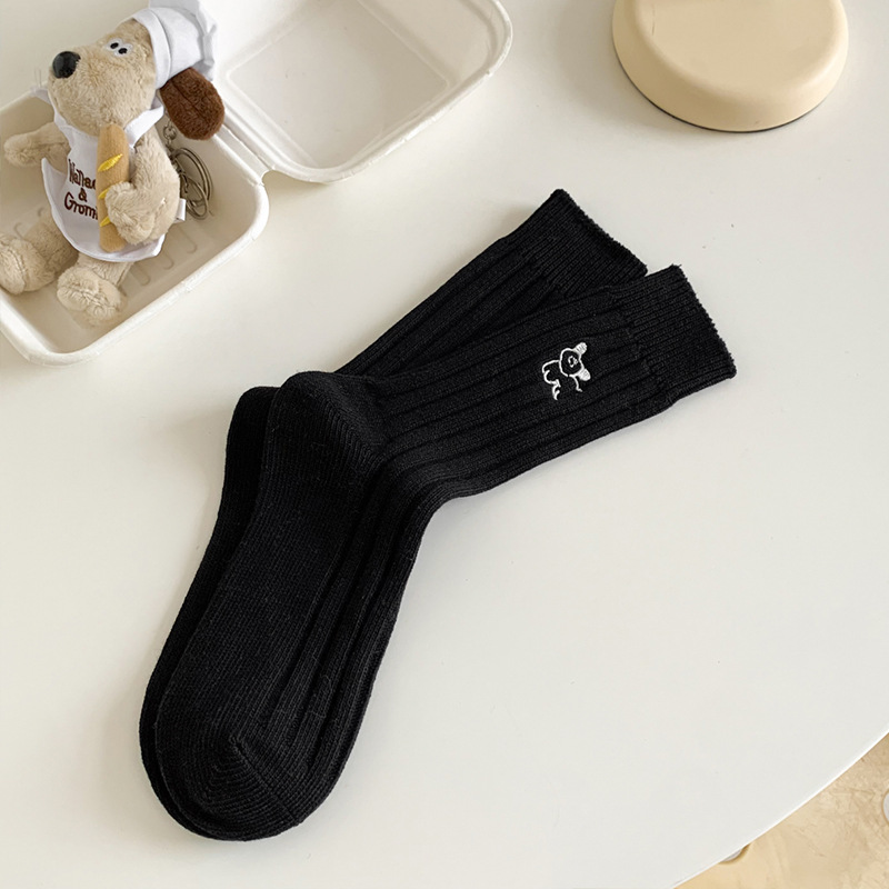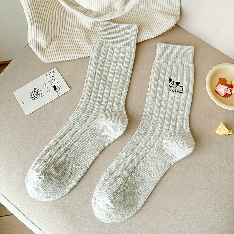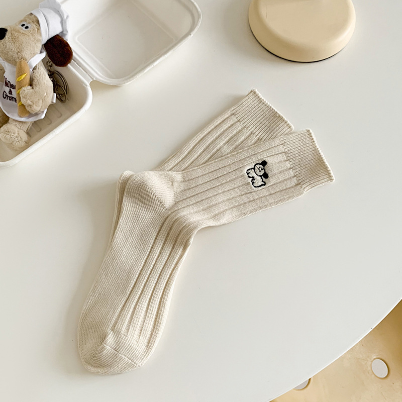 수시나이민 양말 여성 봄 · 가을 수놓은 강아지 중간배럴 이중바늘 한국 동대문 수직 줄무늬 더미 양말