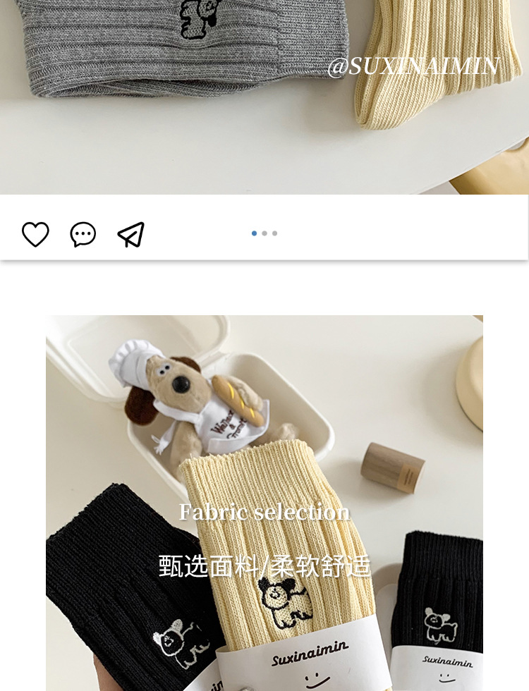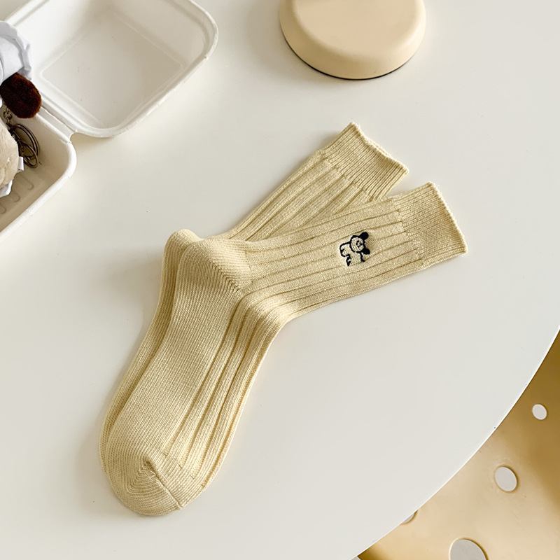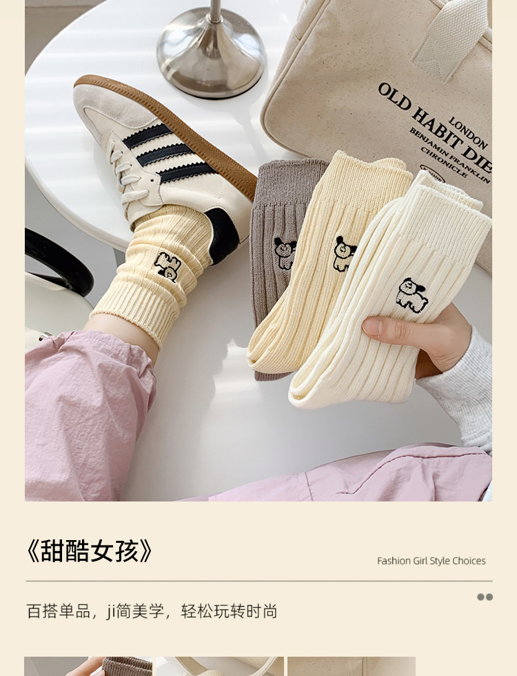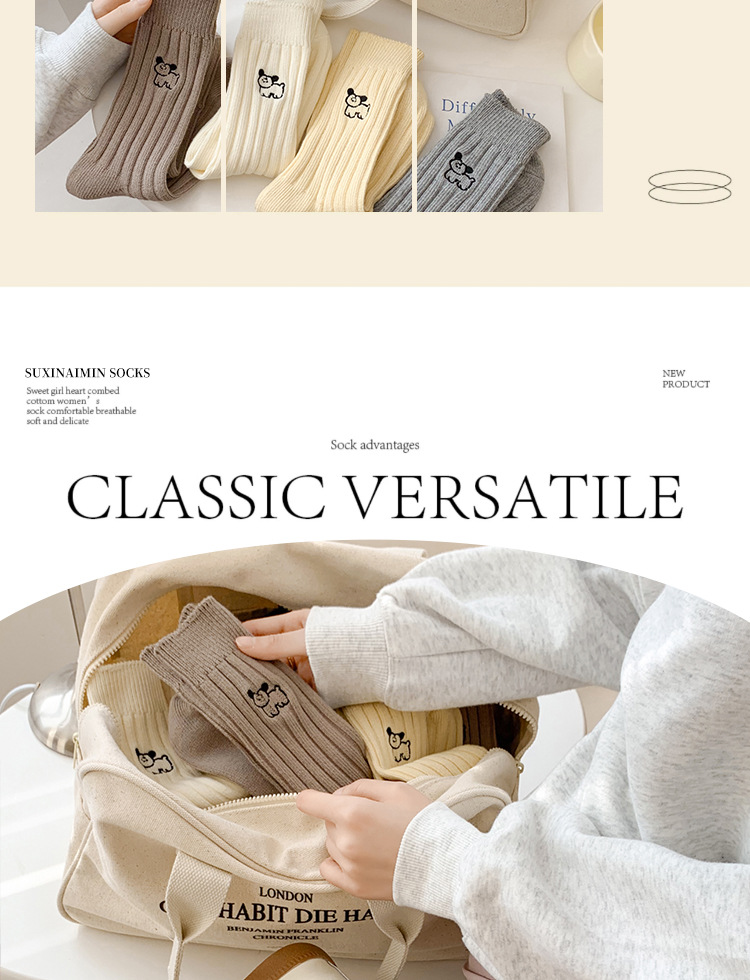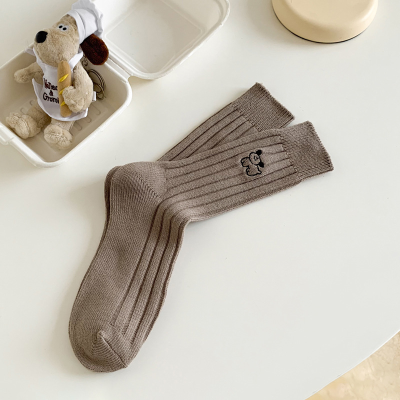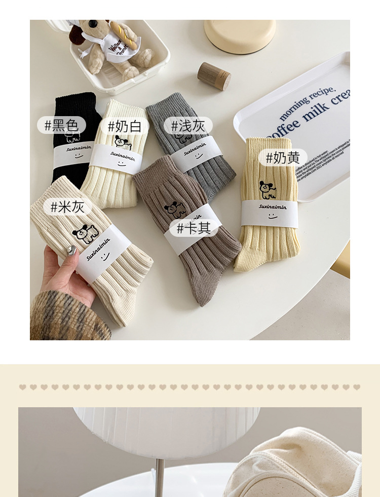 수시나이민 양말 여성 봄 · 가을 수놓은 강아지 중간배럴 이중바늘 한국 동대문 수직 줄무늬 더미 양말