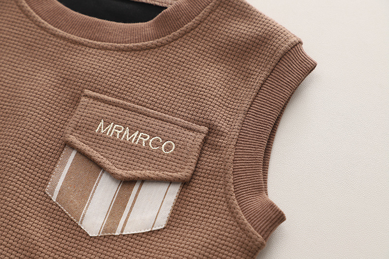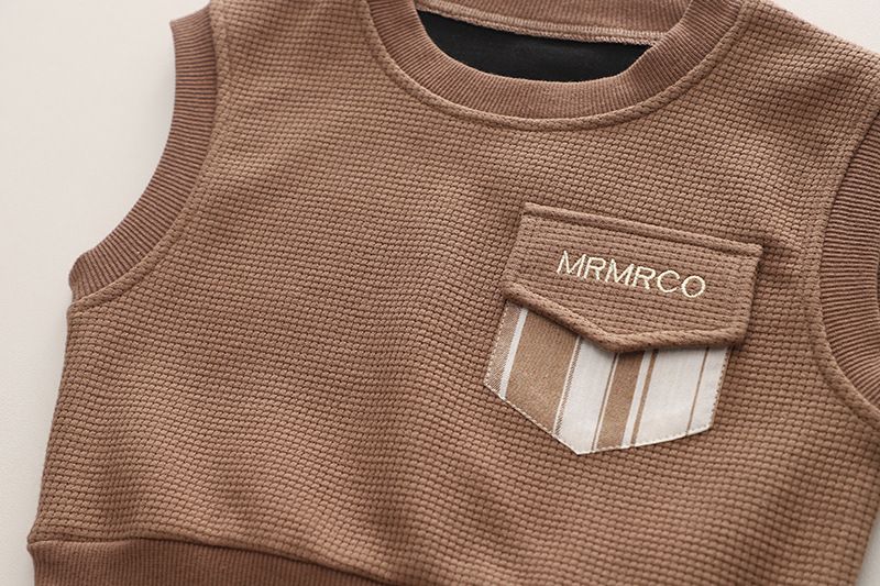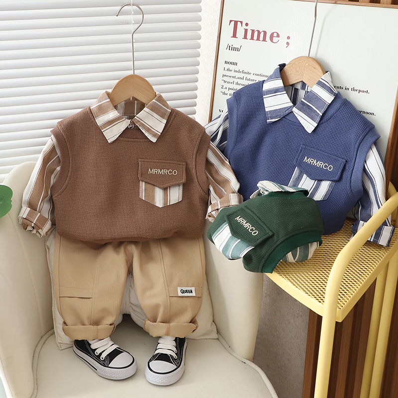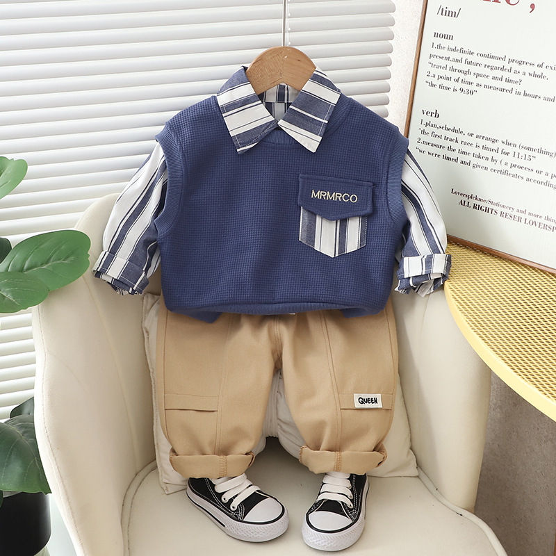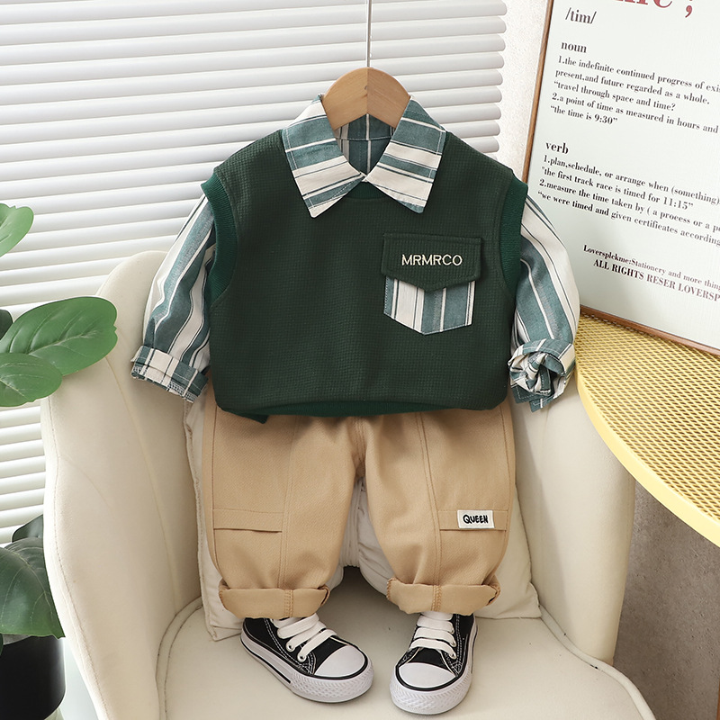 소년의 2024 가을 옷 세트 새로운 서양식 옷 아기 봄과 가을 스웨터 조끼 긴 소매 셔츠 3 피스 세트