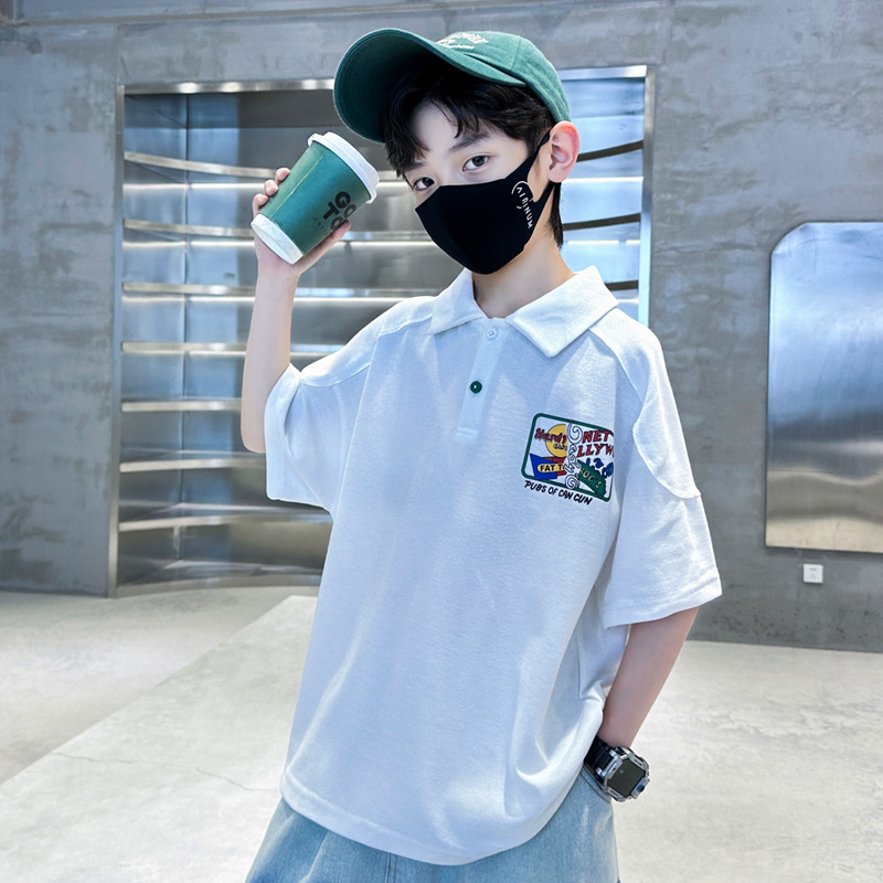 소년 반팔 폴로 셔츠 어린이 화이트 티셔츠 큰 소년 한국 스타일 여름 옷 2024 새로운 여름 탑