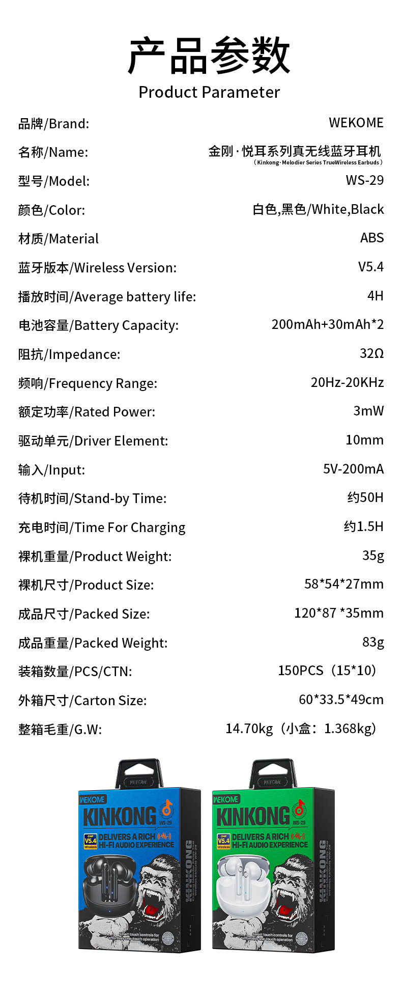 WEKOME King Kong Yue 시리즈 진정한 무선 블루투스 헤드셋 HIFI 음질 이어폰 형 터치 헤드셋 WS-29스토어 가기