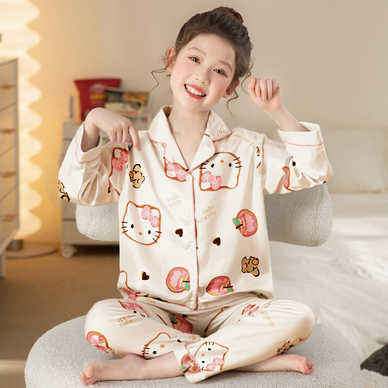 어린이 잠옷 소녀 봄과 가을 아이스 실크 얇은 긴팔 실크 세트 나이 많은 아이들 소녀의 부모 자식 서양식 홈웨어스토어 가기