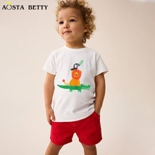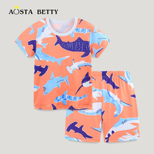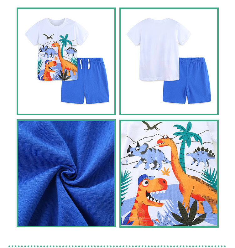 여름 새 소년 니트 면화 정장 유럽과 미국 스타일의 유아 만화 공룡 인쇄 반팔 풀오버 투피스 세트스토어 가기