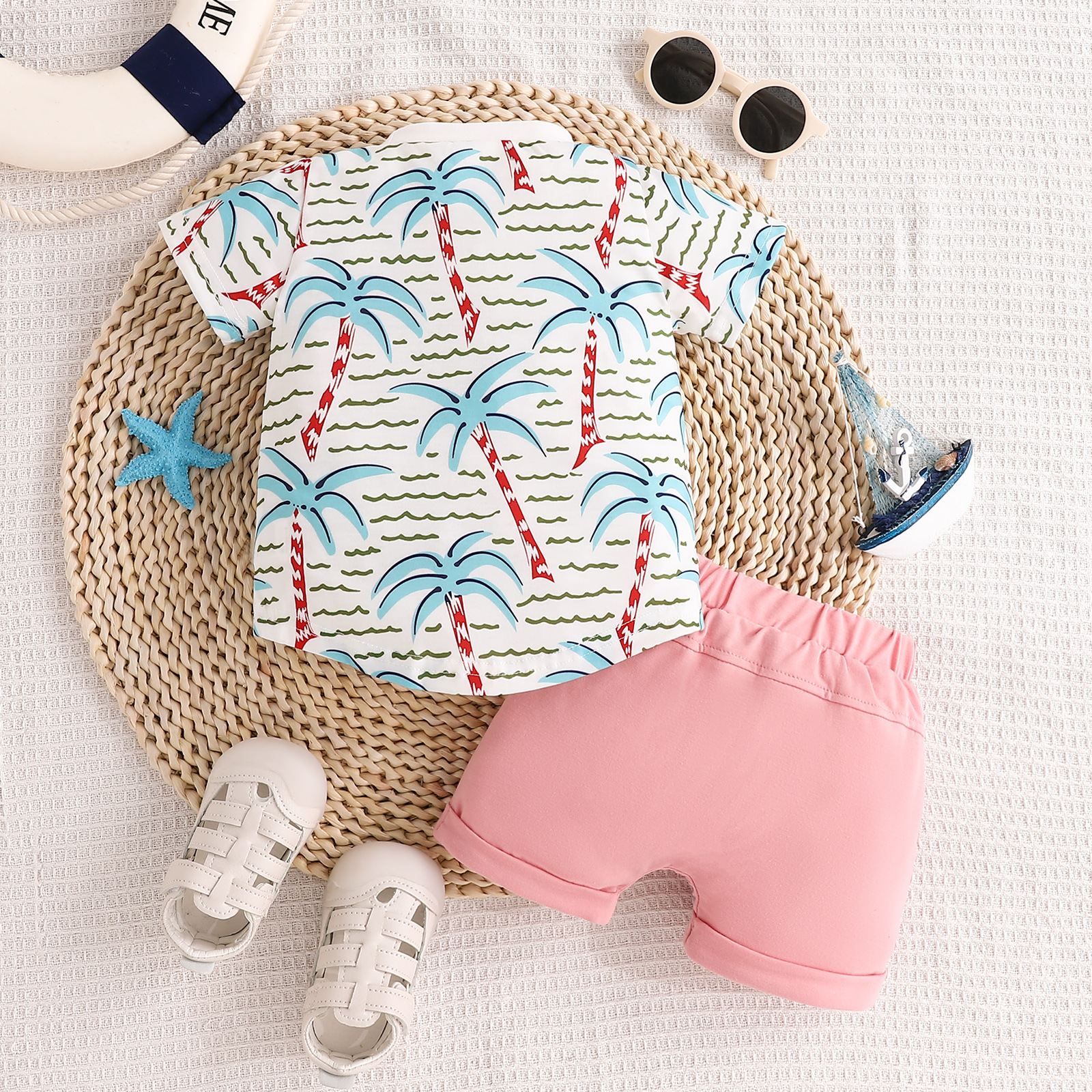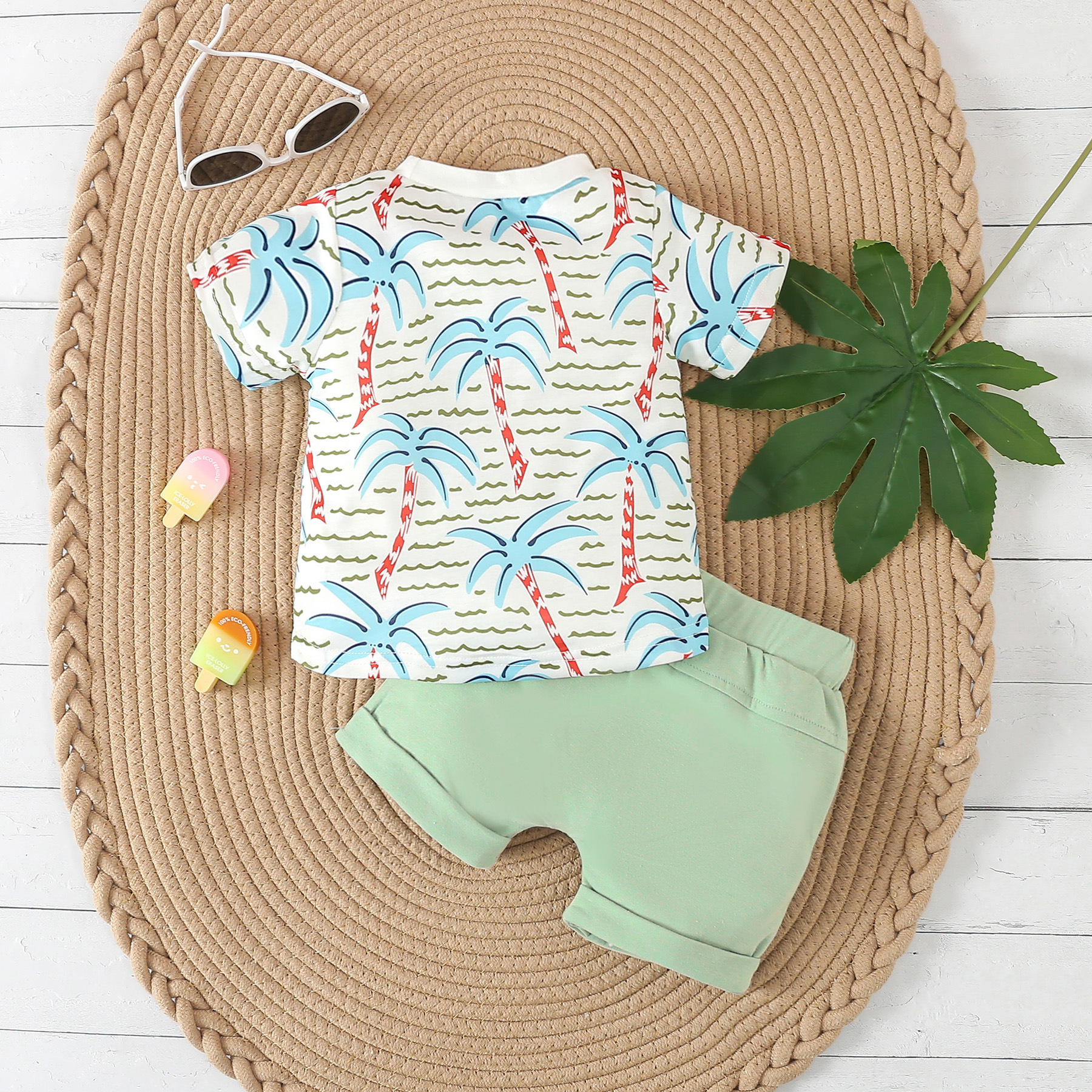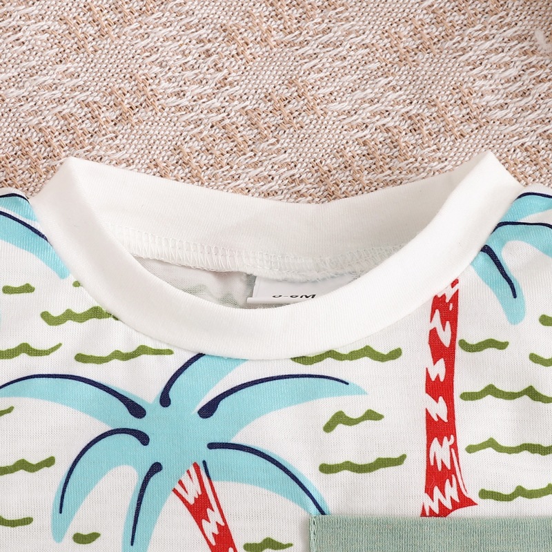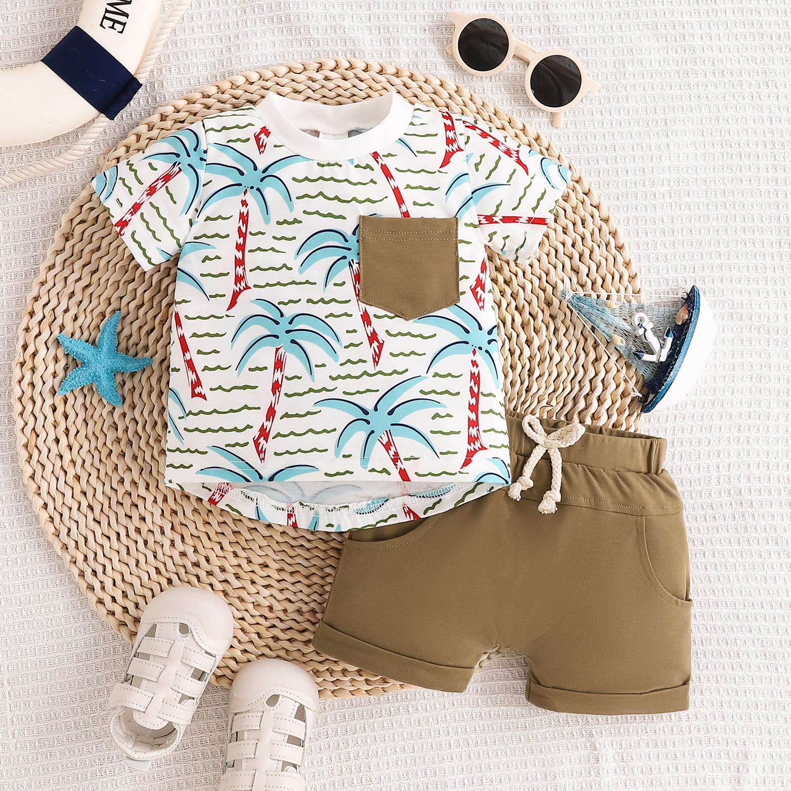 2024 여름 새 소년 캐주얼 세트 0-3 세 어린이 열대 식물 인쇄 반팔 티셔츠 반바지 세트