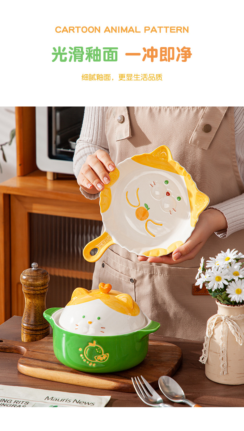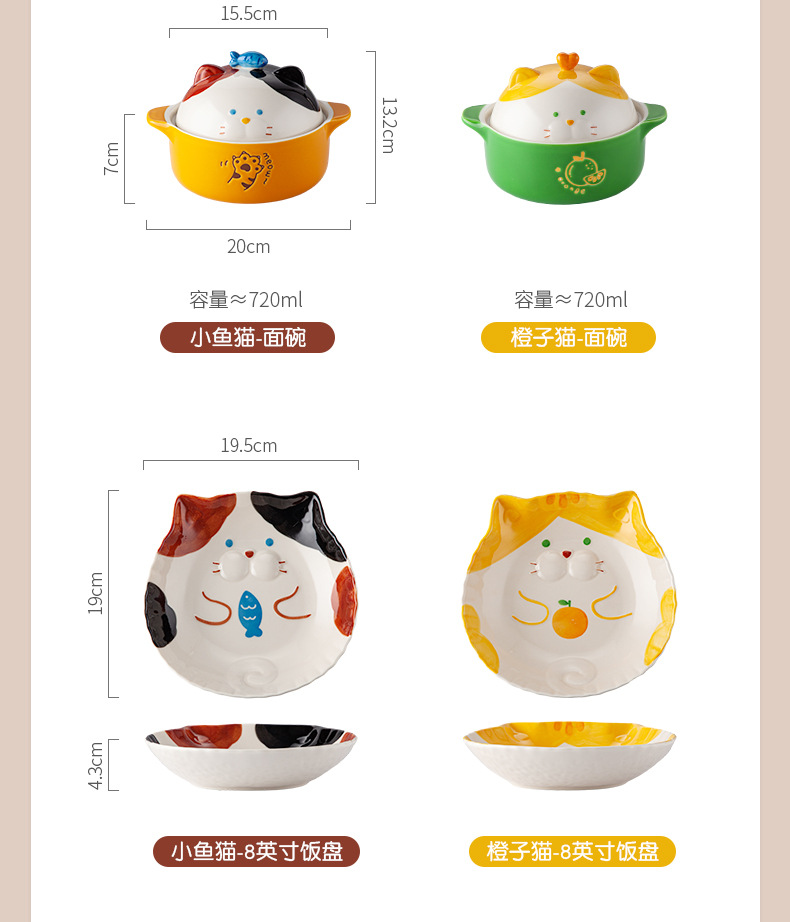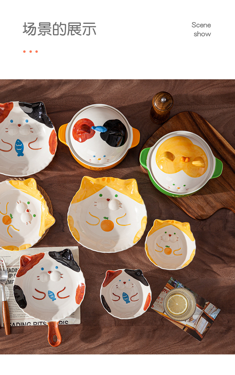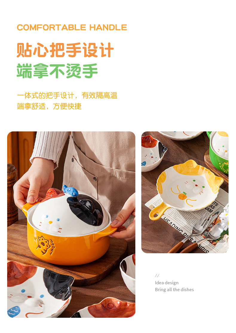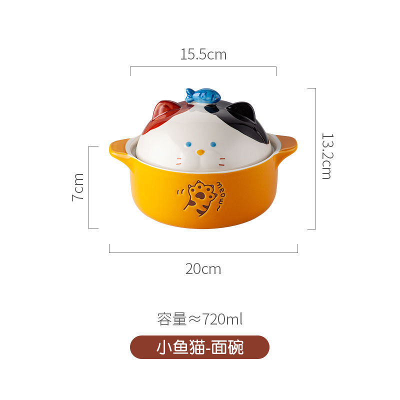 만화 도트캣 세라믹 인스턴트 국수 그릇, 귀여운 손으로 그린 샐러드 그릇, 뚜껑이 있는 유약 색상 수프 그릇, 손으로 그린 손잡이 그릇스토어 가기