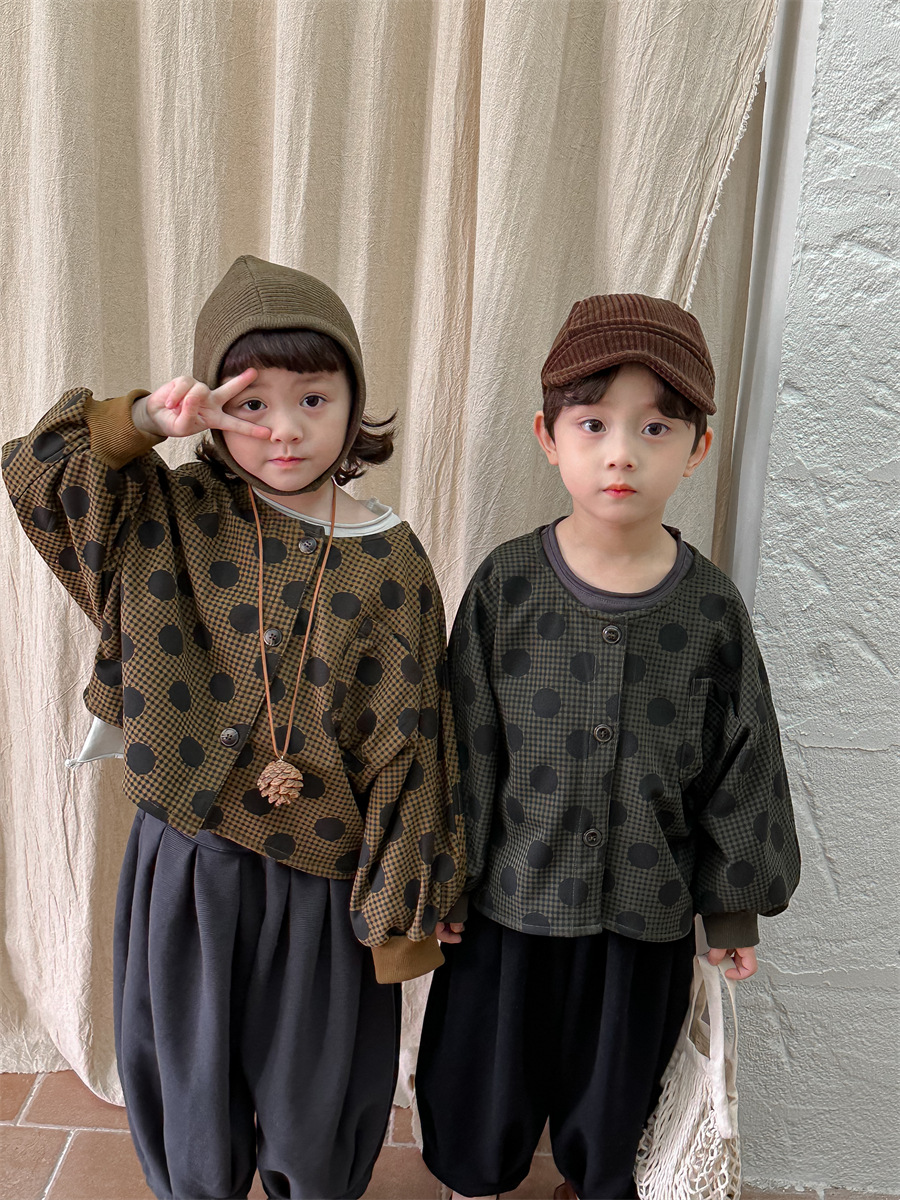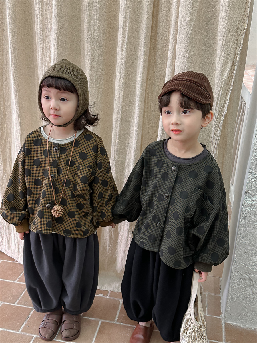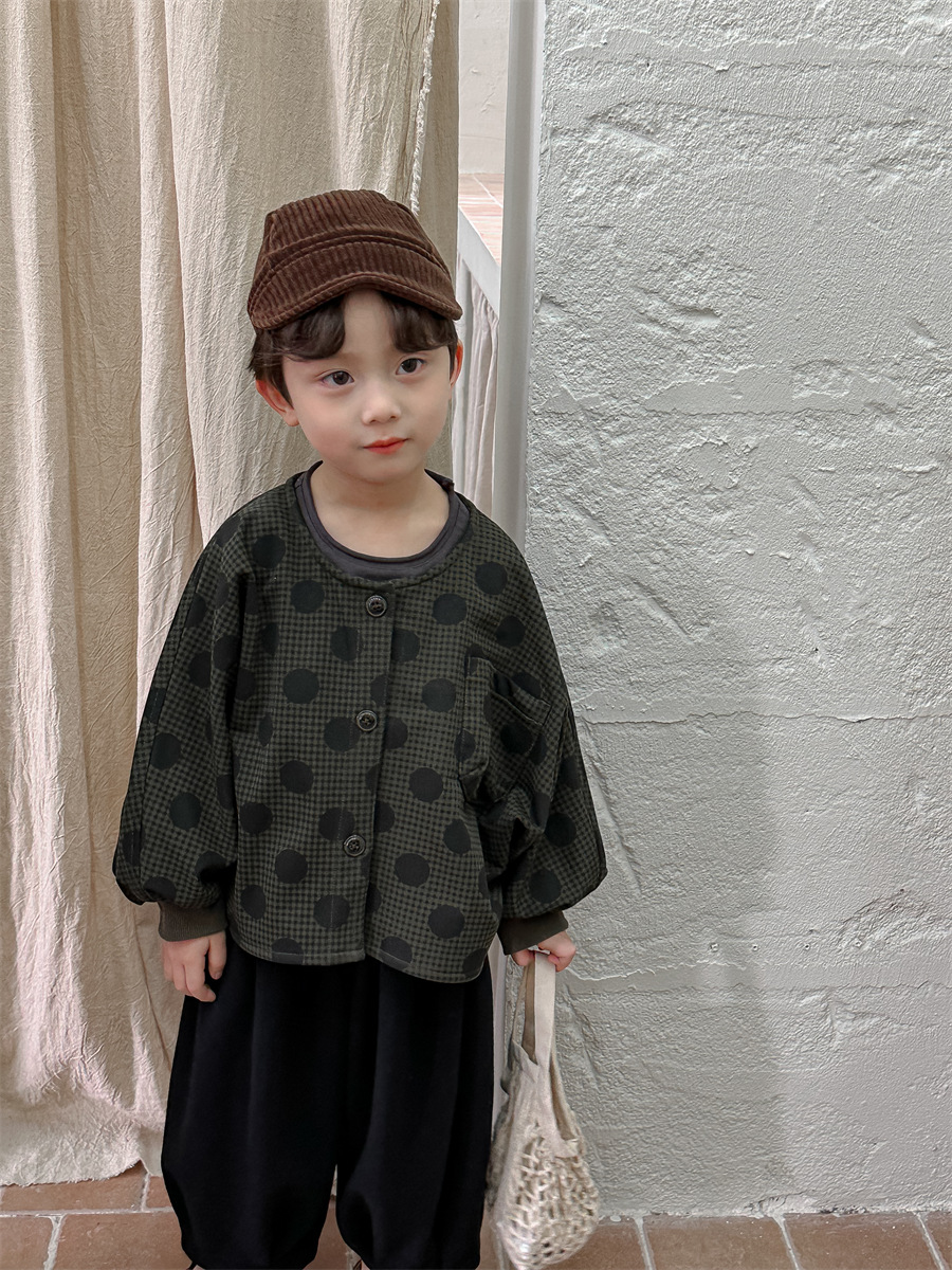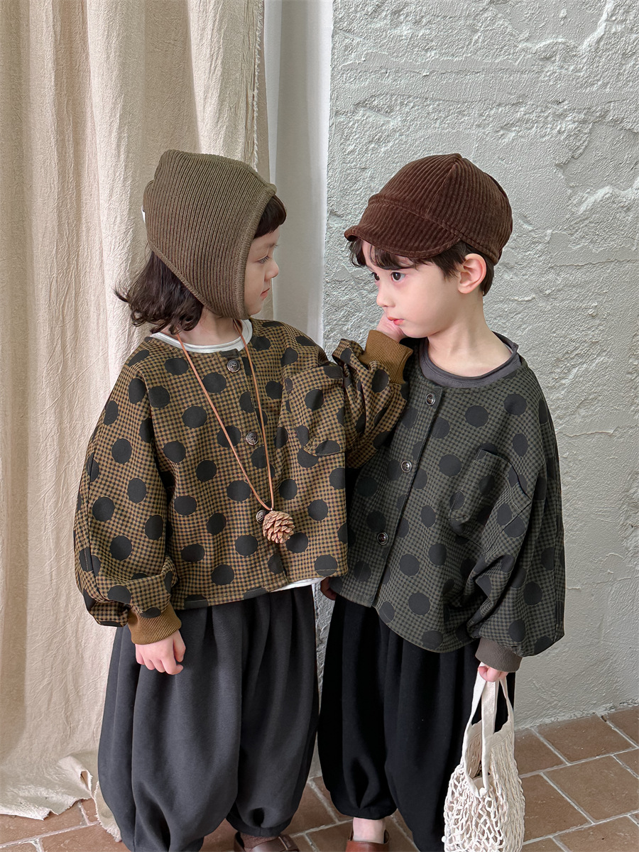 Jiaye 아동복 2025 봄 가을 신상 아동용 도트무늬 코트 재킷 남아 여아 스타일리쉬 라운드넥 긴팔 셔츠