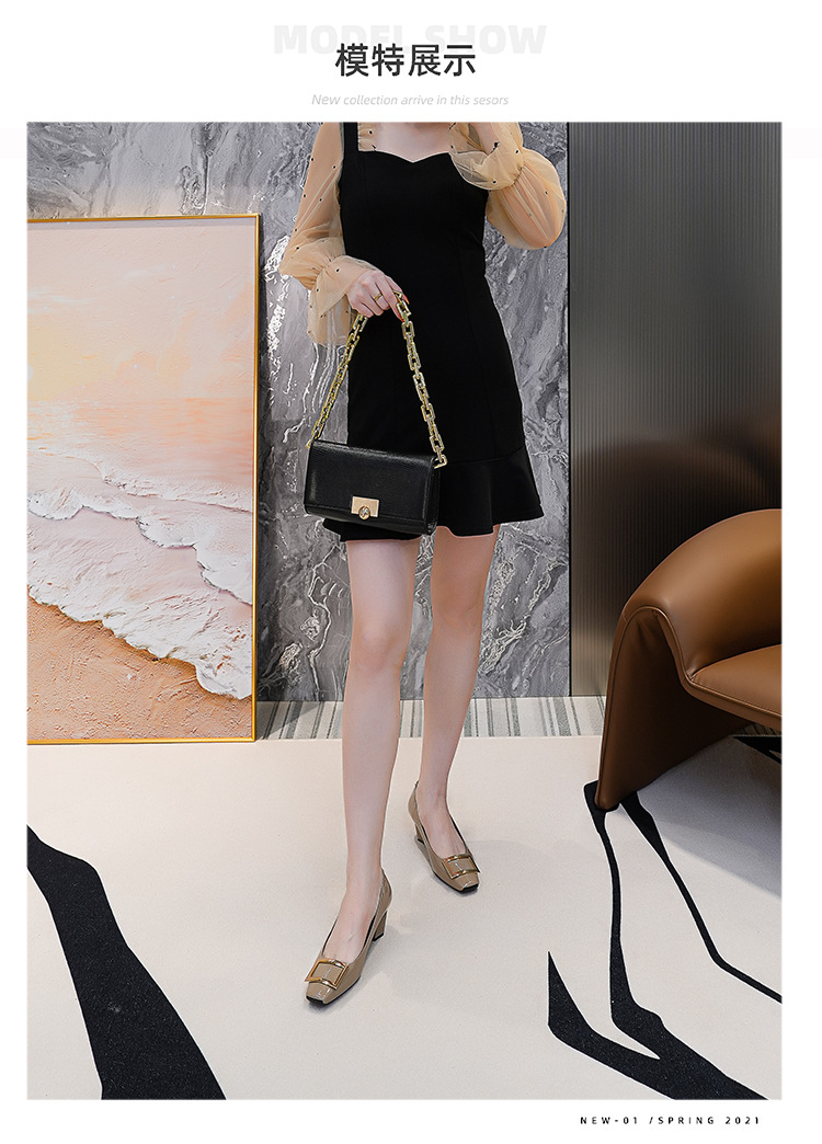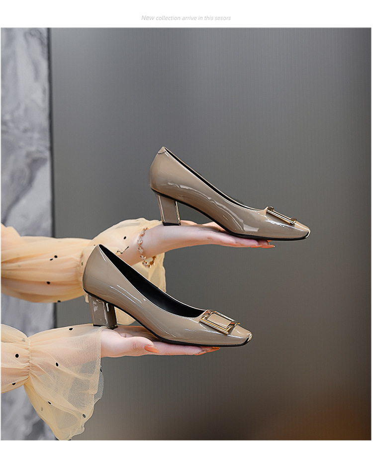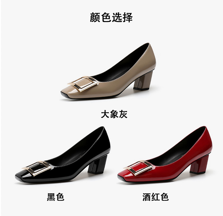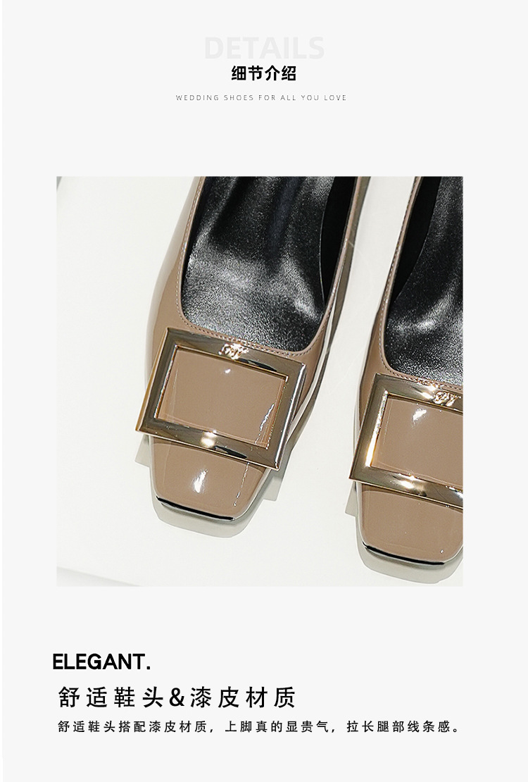 rv方扣单鞋女中跟2024夏季法式复古浅口方头细跟大象灰通勤高跟鞋