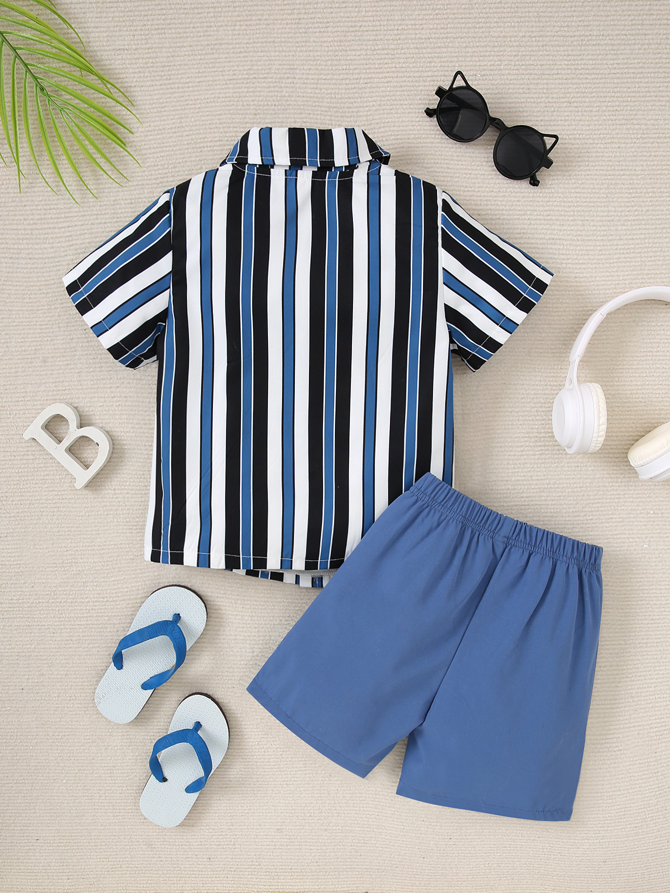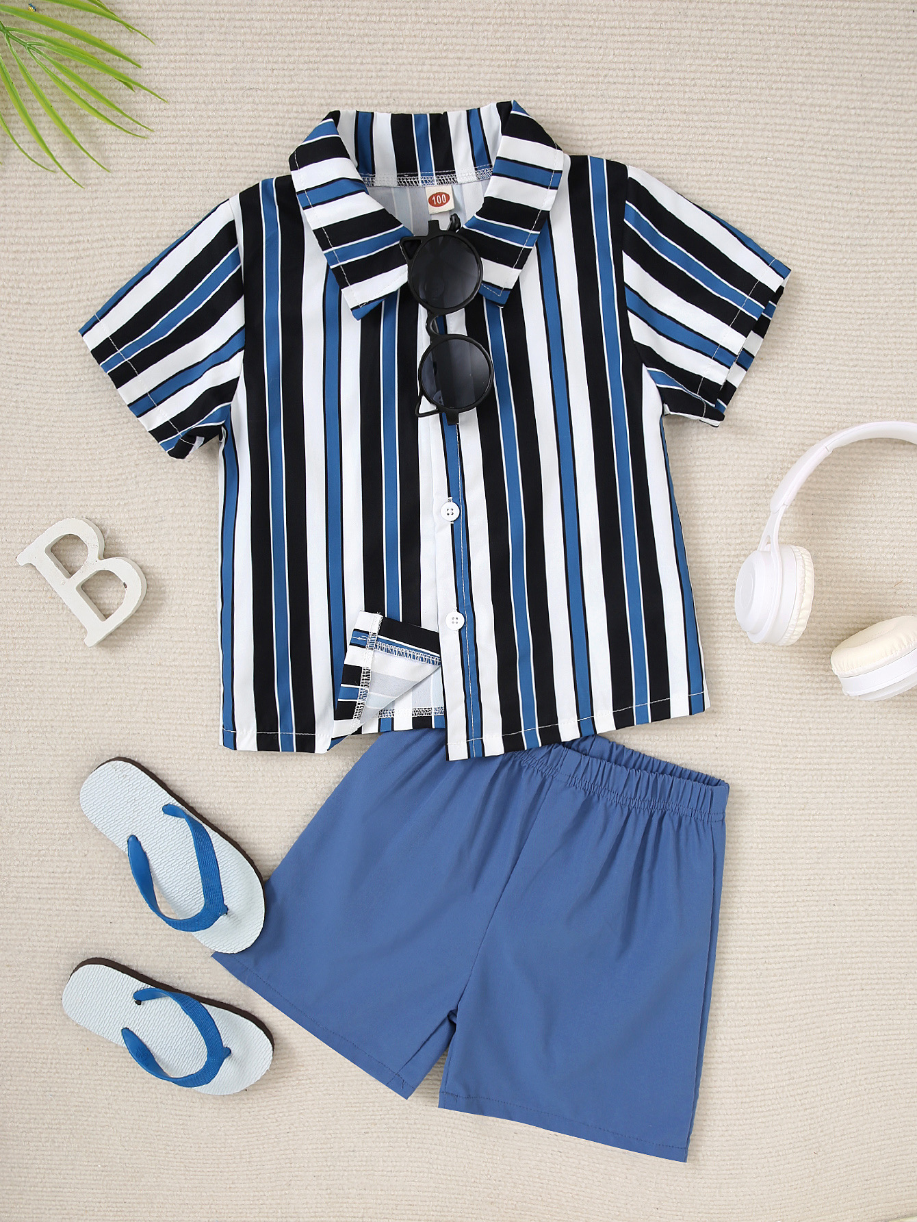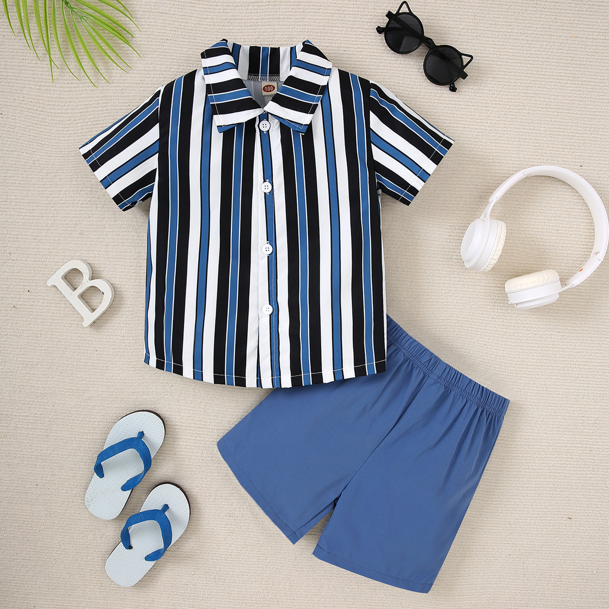 소년 줄무늬 반팔 셔츠 + 단색 반바지 투피스 세트