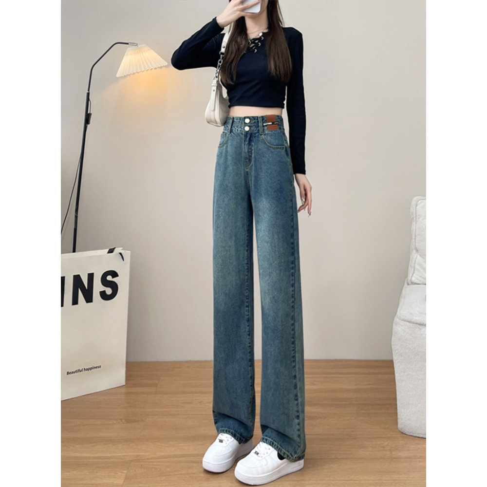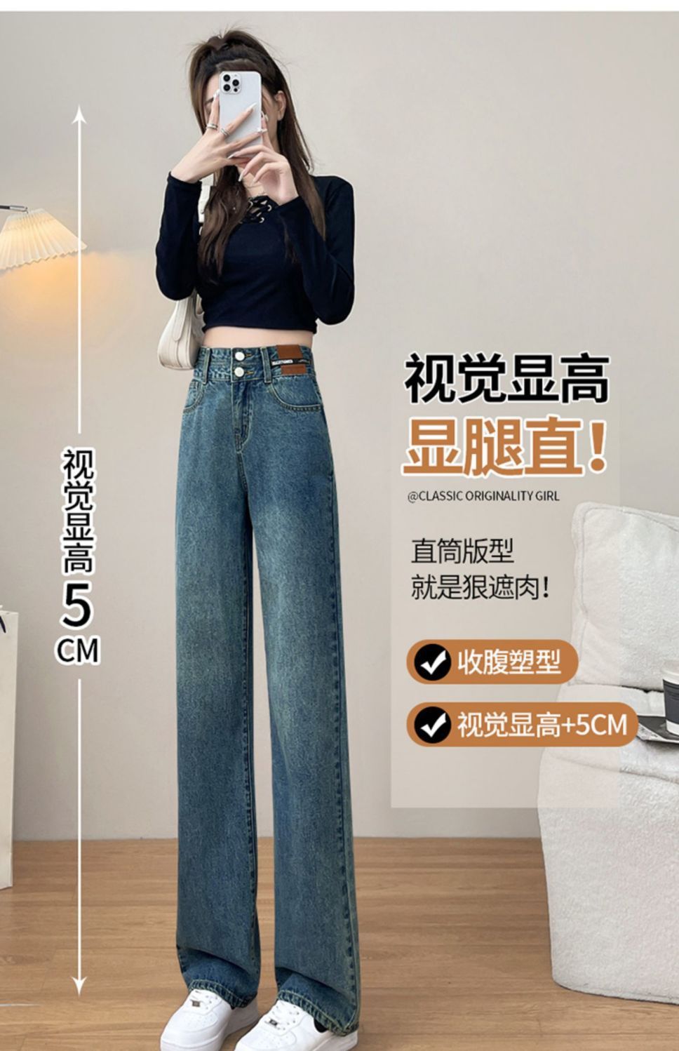 레트로 청바지 여성의 봄과 가을 스트레이트 느슨한 높은 허리 슬리밍 걸레 좁은 넓은 다리 바지 다목적 드레이핑 바지스토어 가기