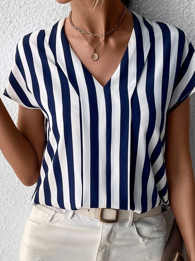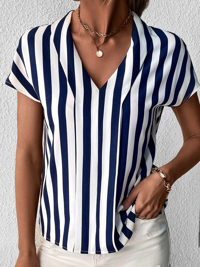 유럽과 미국의 국경 여성 의류 2024 아마존 여름 새로운 줄무늬 느슨한 인쇄 탑 캐주얼 V 넥 셔츠
