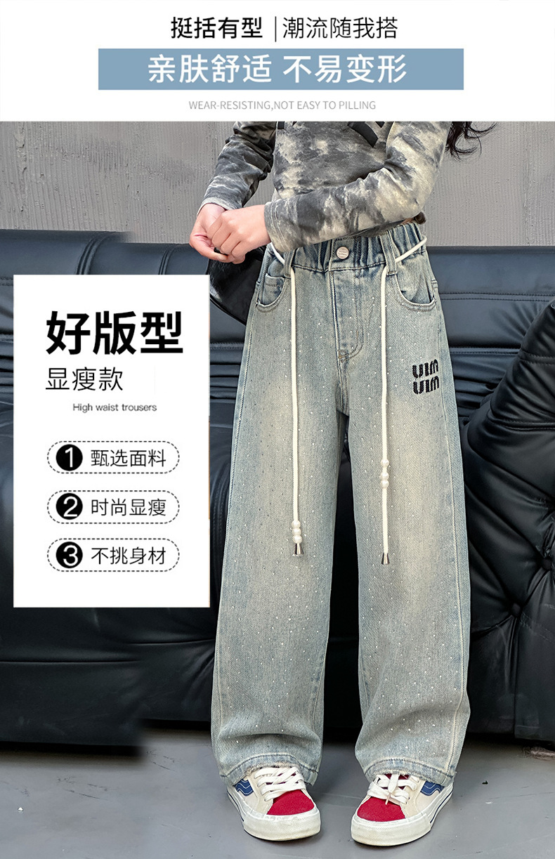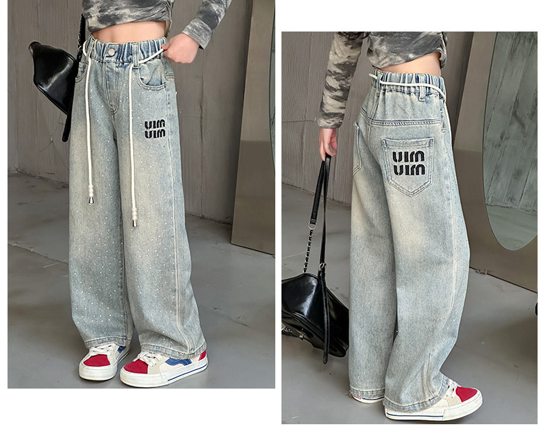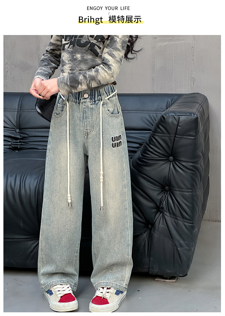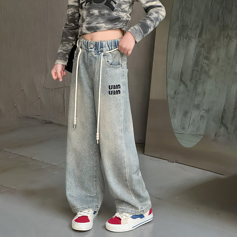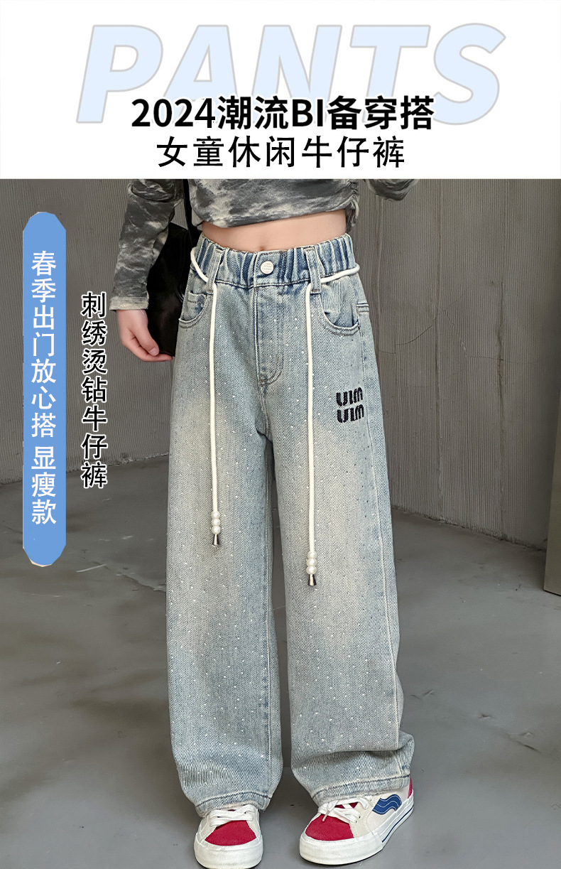 소녀 청바지 2024 봄 새로운 중형 및 대형 어린이 유행 모조 다이아몬드 캐주얼 소녀의 인터넷 유명 인사 스트레이트 바지스토어 가기
