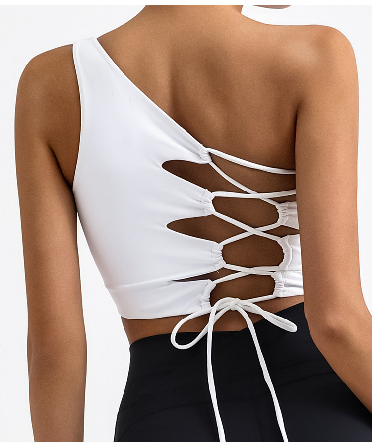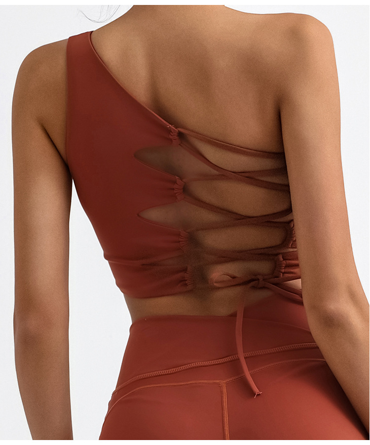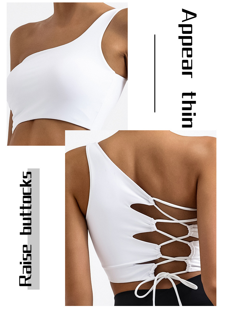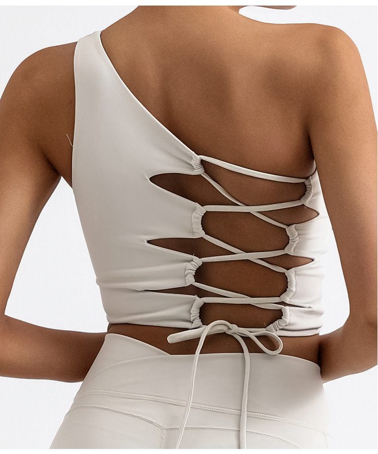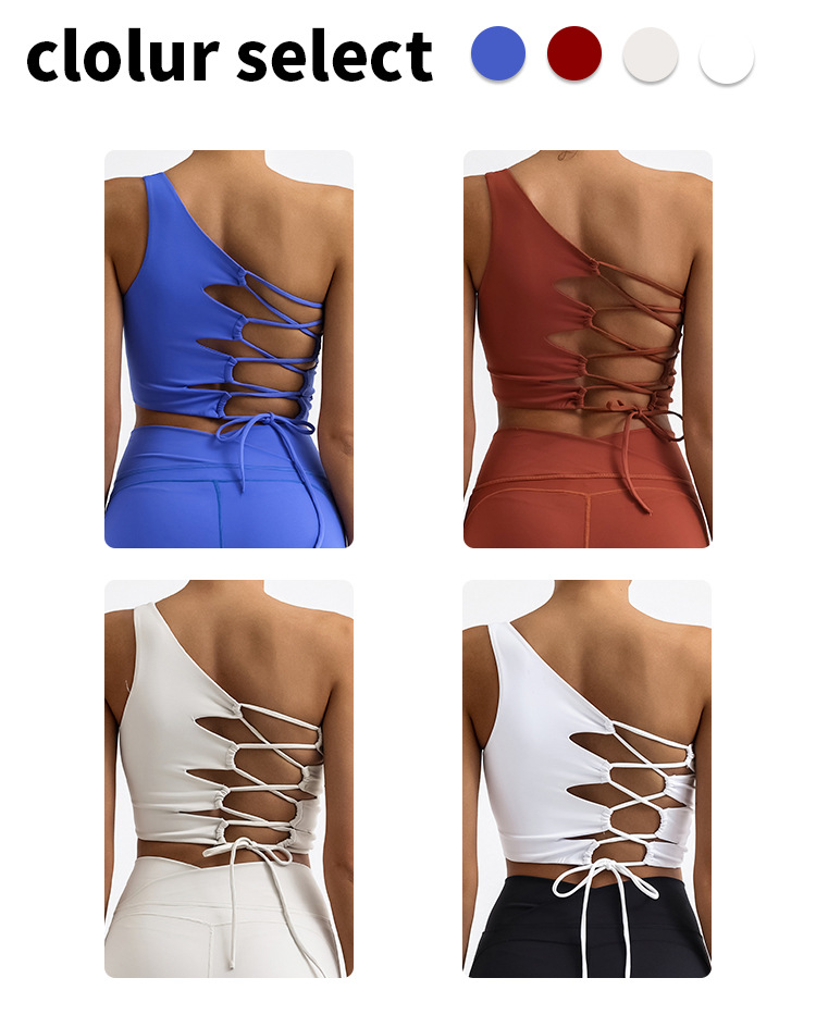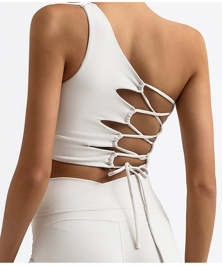 유럽과 미국의 대외 무역 국경 간 요가 조끼 불규칙한 싱글 숄더 아름다운 등 레이스 업 알몸 느낌 스포츠 피트니스 탑 (가슴 패드 포함)