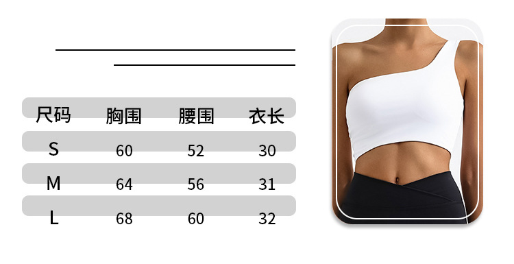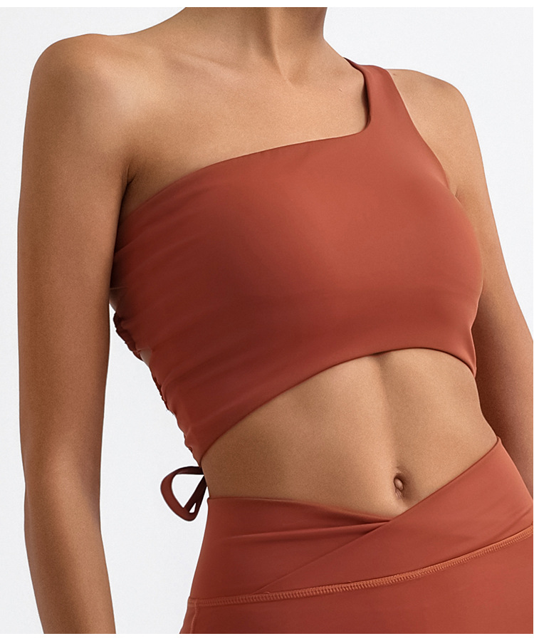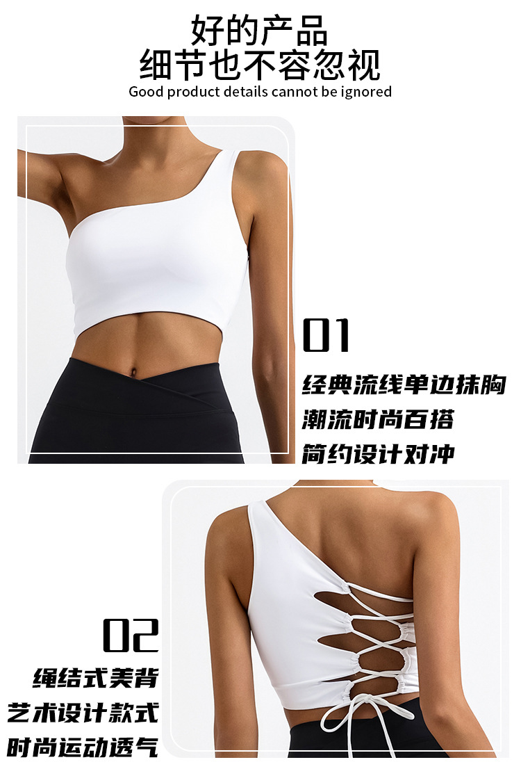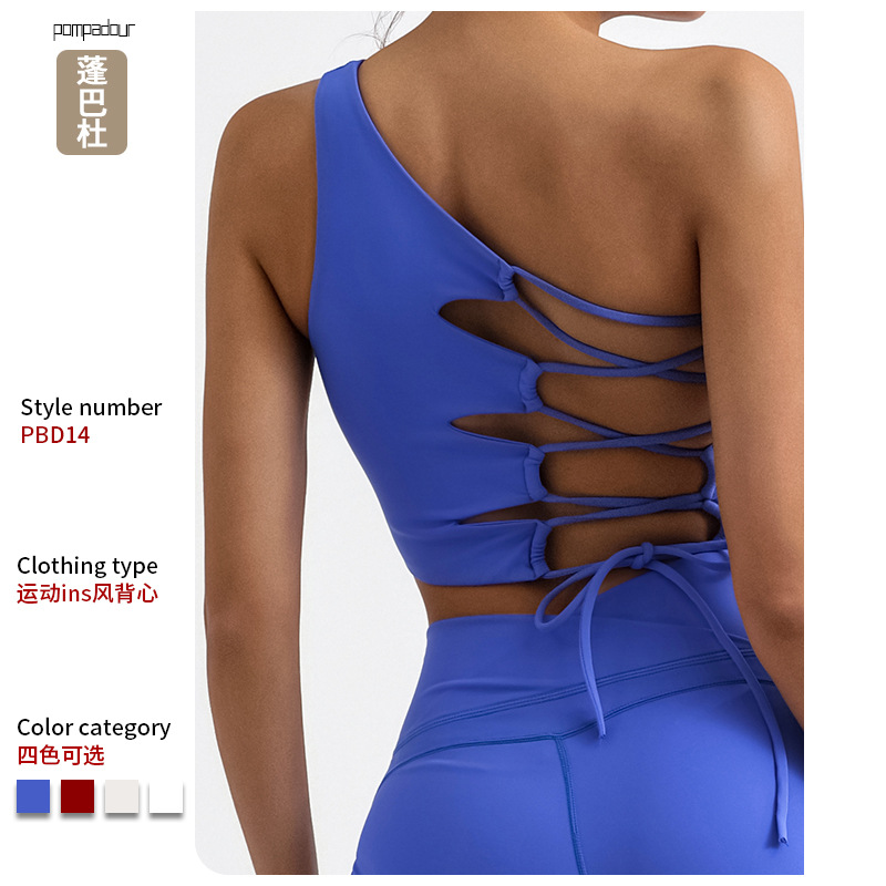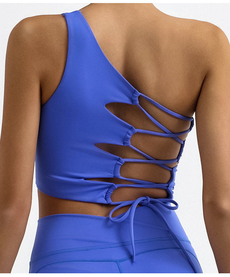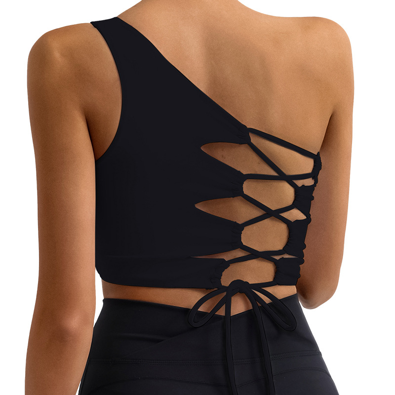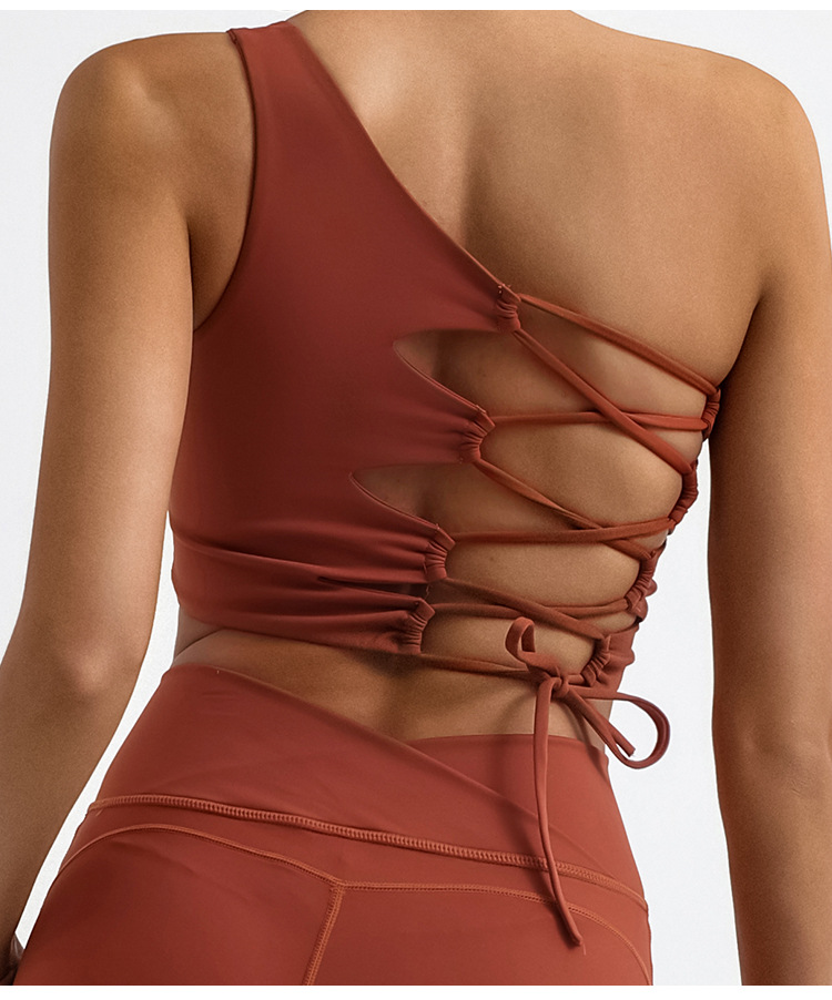 유럽과 미국의 대외 무역 국경 간 요가 조끼 불규칙한 싱글 숄더 아름다운 등 레이스 업 알몸 느낌 스포츠 피트니스 탑 (가슴 패드 포함)