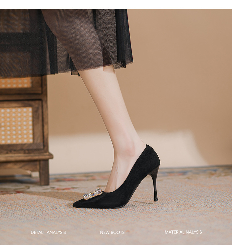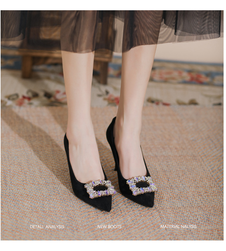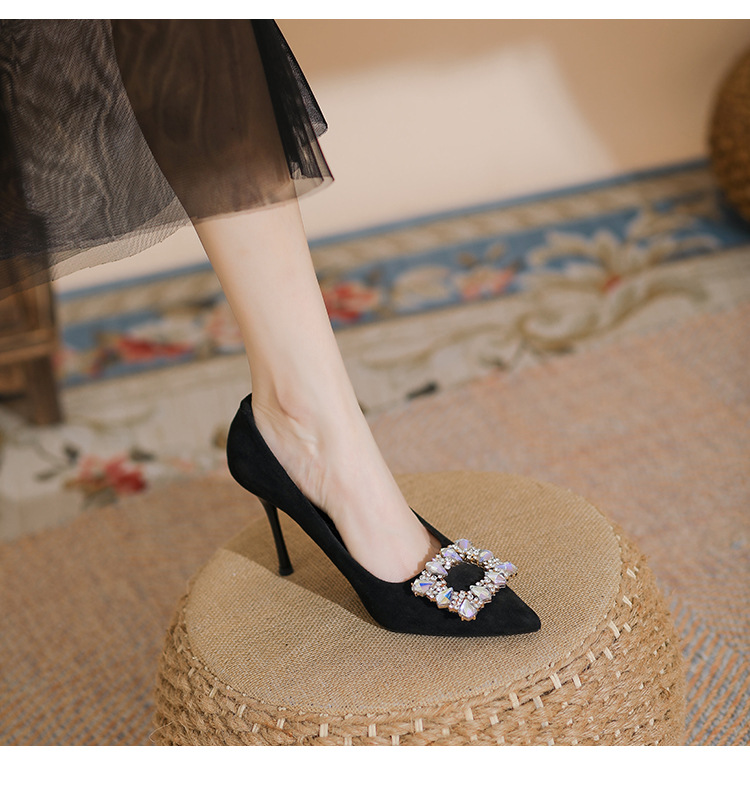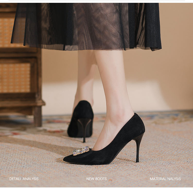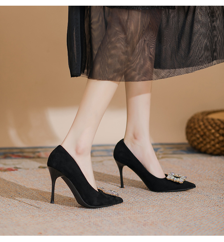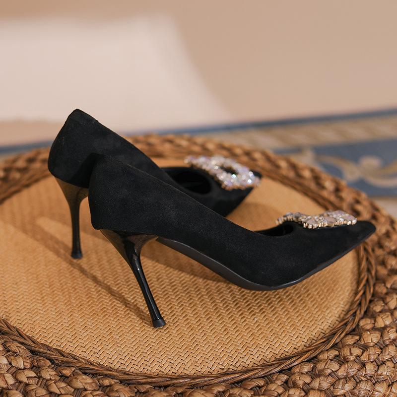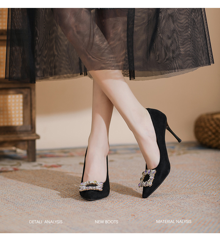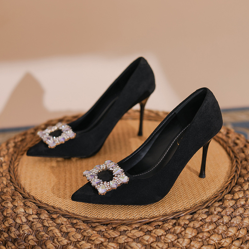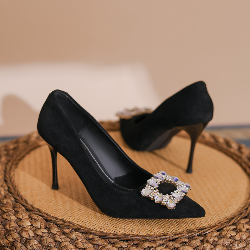 새로운 검은 통근 스웨이드 우아한 스틸레토 힐 하이힐을 2024 여성을위한 프랑스 뾰족한 모조 다이아몬드 스퀘어 버클 얕은 입 싱글 레이어 신발스토어 가기