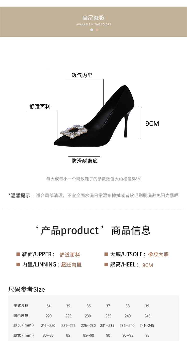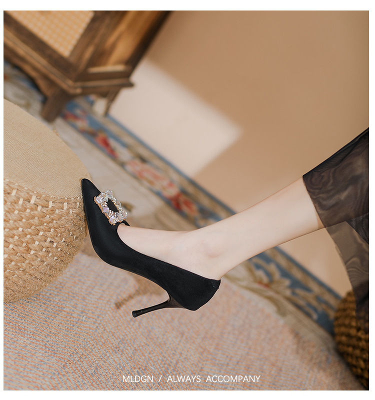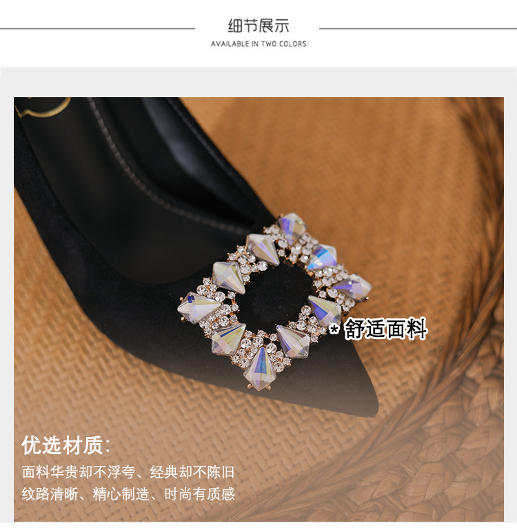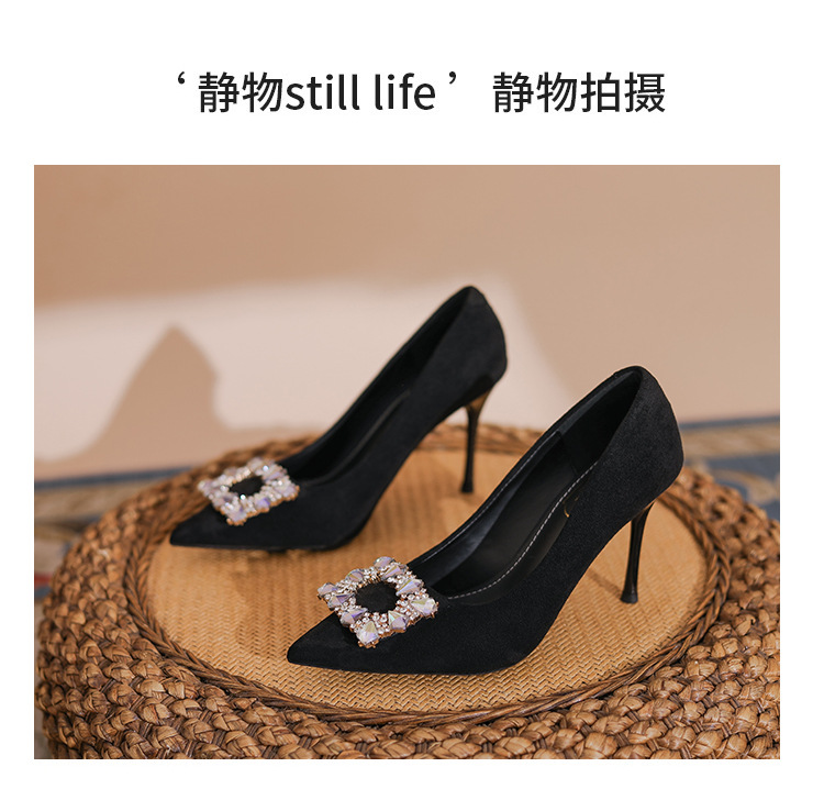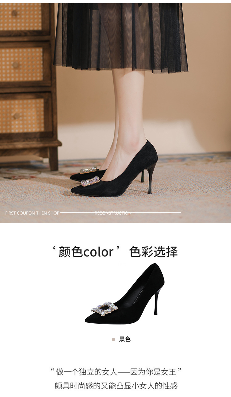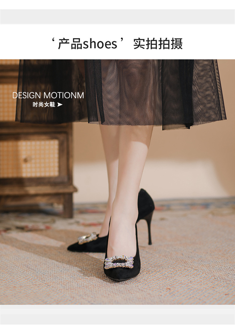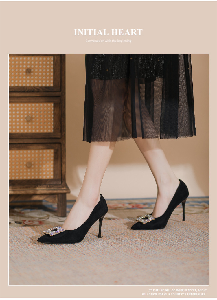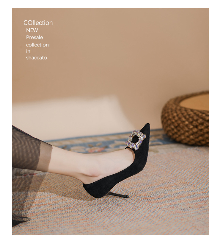새로운 검은 통근 스웨이드 우아한 스틸레토 힐 하이힐을 2024 여성을위한 프랑스 뾰족한 모조 다이아몬드 스퀘어 버클 얕은 입 싱글 레이어 신발스토어 가기
