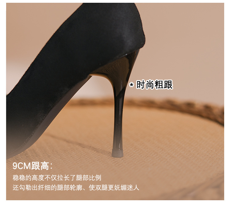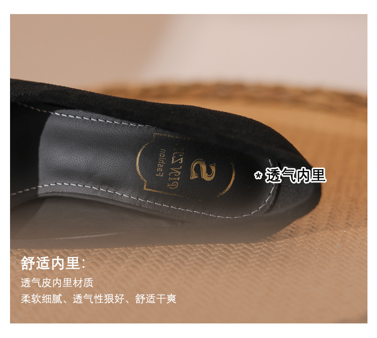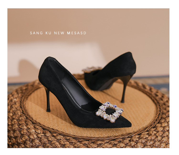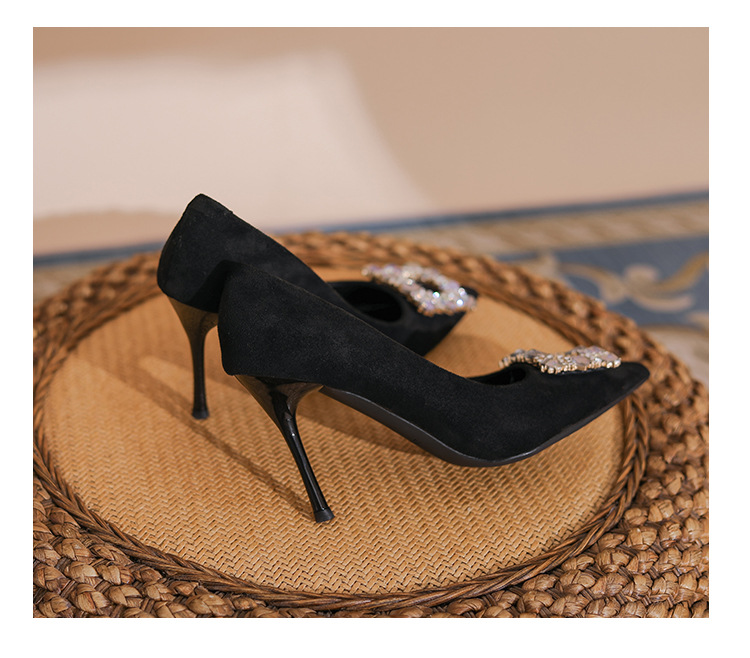 새로운 검은 통근 스웨이드 우아한 스틸레토 힐 하이힐을 2024 여성을위한 프랑스 뾰족한 모조 다이아몬드 스퀘어 버클 얕은 입 싱글 레이어 신발