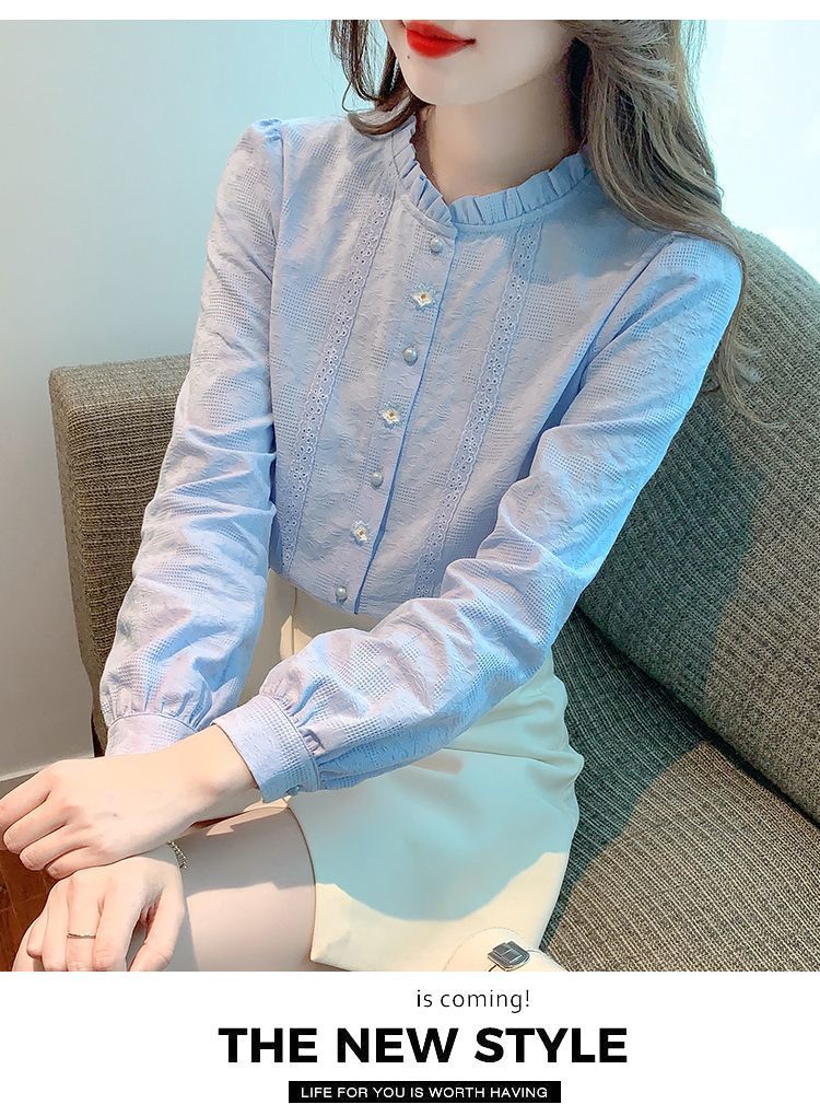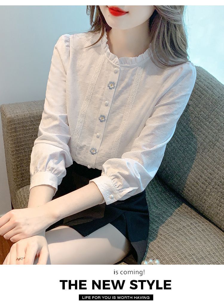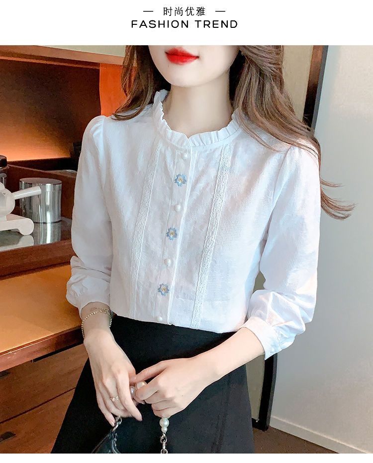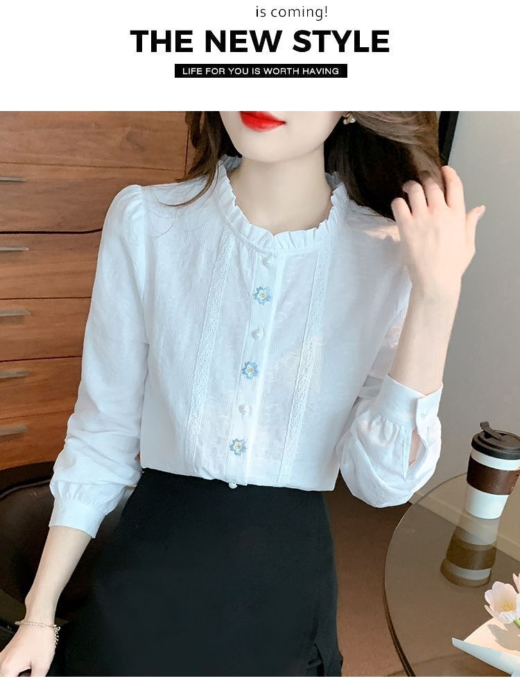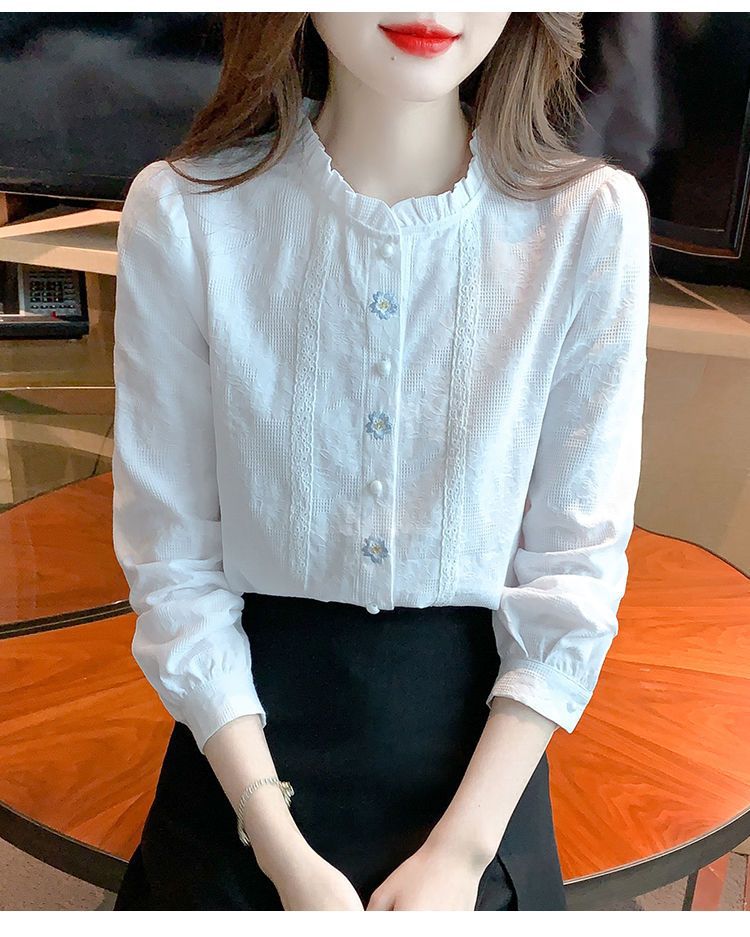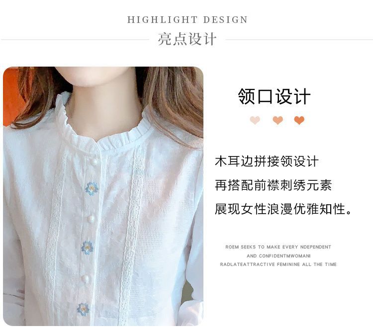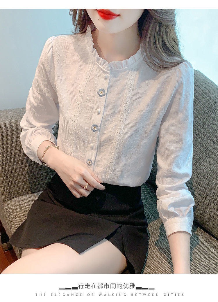 2025년 가을 겨울 신상 자수 자카드 순면 셔츠 여성용 패셔너블한 올 코튼 러플 칼라 플러스 벨벳 두꺼운 상의스토어 가기