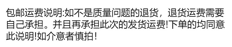 通知:新疆、西藏、内蒙古、青海、宁夏、甘肃、内蒙、海南为不包邮地区。运费需要联系客服补加。如不补运费。我们有权点击直接自提发货。如造成损失,买家自行承担!