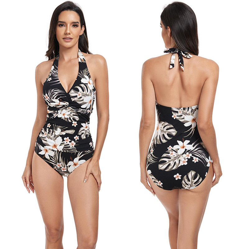 2024 국경 간 패션 새로운 유럽과 미국 인쇄 섹시한 푸시 업 홀터 스트랩 디자인 V 넥 여성용 원피스 수영복