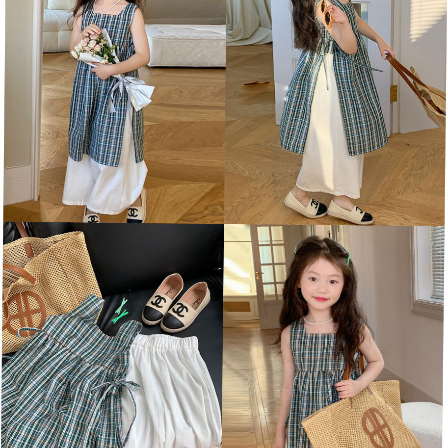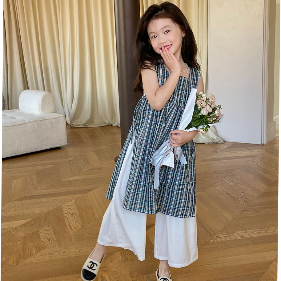 소녀 세트 여름 새로운 한국식 체크 무늬 블라우스 넓은 다리 바지 2 피스 세트 어린이 머리카락스토어 가기